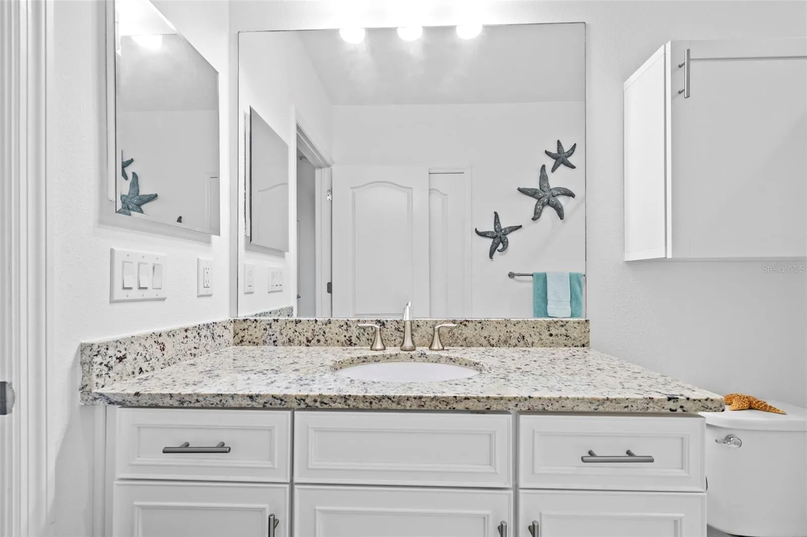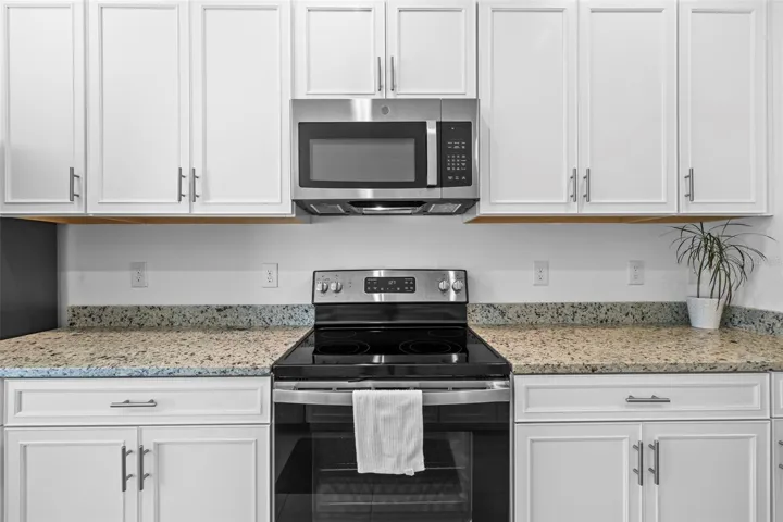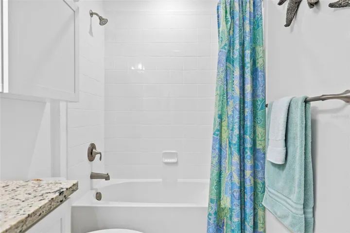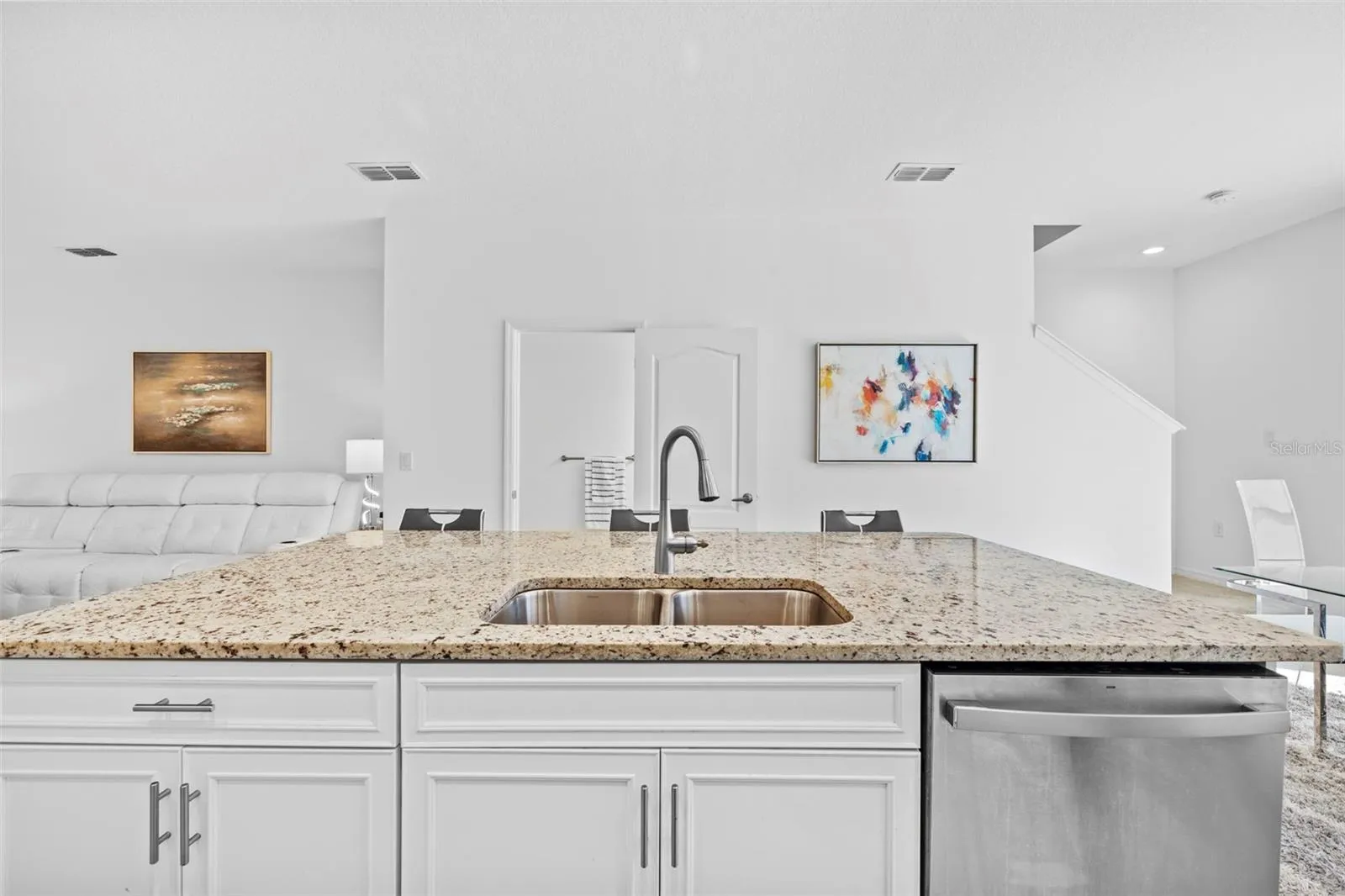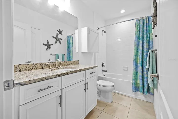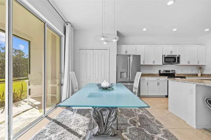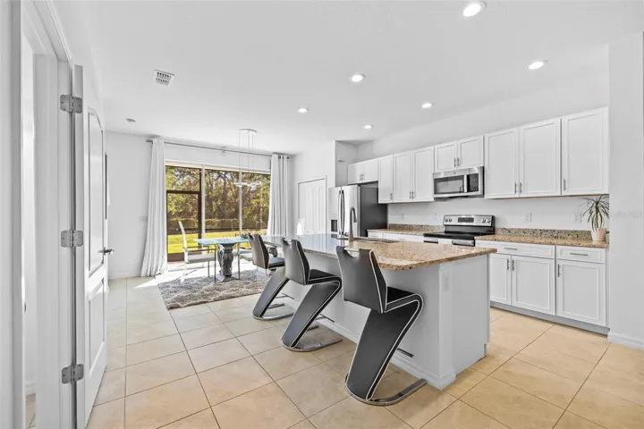 Designed with both style and functionality in mind, the first floor features ceramic tile throughout and an open-concept living area that seamlessly flows into the dining space and kitchen. The kitchen is a chef’s dream with granite countertops, wood cabinetry, stainless steel appliances, and a center island with bar seating. Just off the dining area, sliding glass doors open to a private screened-in patio—perfect for relaxing with peaceful views of trees and water. A convenient half bath completes the first level.