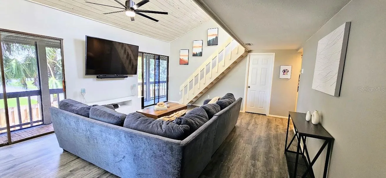 This spacious 2-bedroom, 2-bath split-plan layout offers privacy and comfort, ideal for both seasonal or year-round living. As an end unit, this home features extra privacy and natural light, enhanced by soaring vaulted Pecky Cypress ceilings and large transom windows that fill the open-concept living area with abundant light, while adding warmth and architectural character. The open floor plan includes a spacious kitchen, perfect for entertaining, and flows into the main living and dining areas.