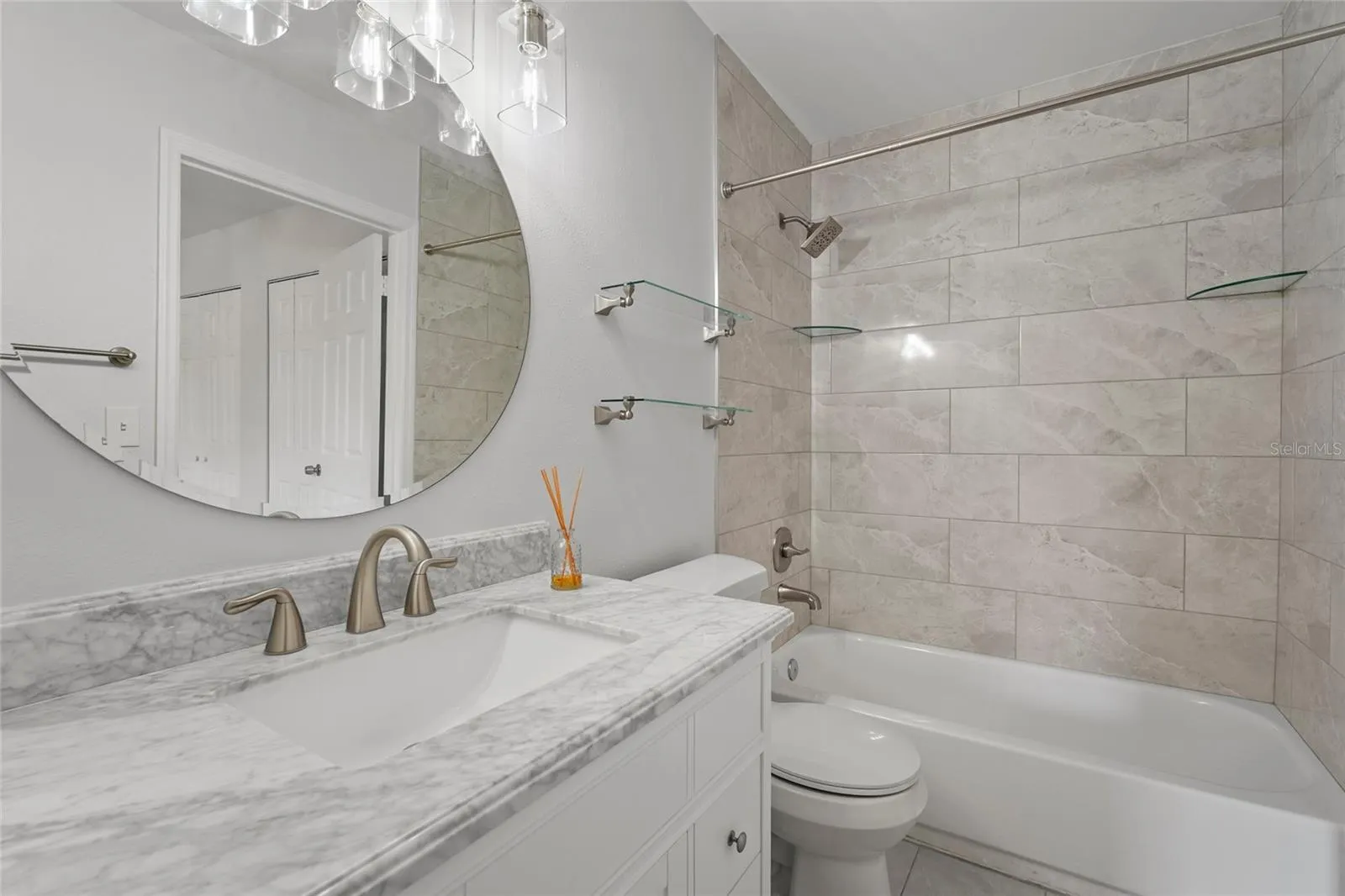 This bright and spacious three-bedroom, two-bathroom condo offers 1,260 square feet of tastefully updated living space. Located on the second floor, it features cathedral ceilings that enhance its open floor plan and natural light. Recent renovations include sleek tile flooring, modern moldings, fresh paint, and beautifully updated bathrooms and kitchen with granite countertops.