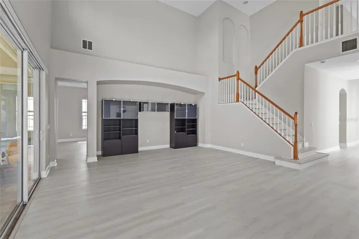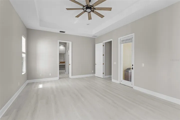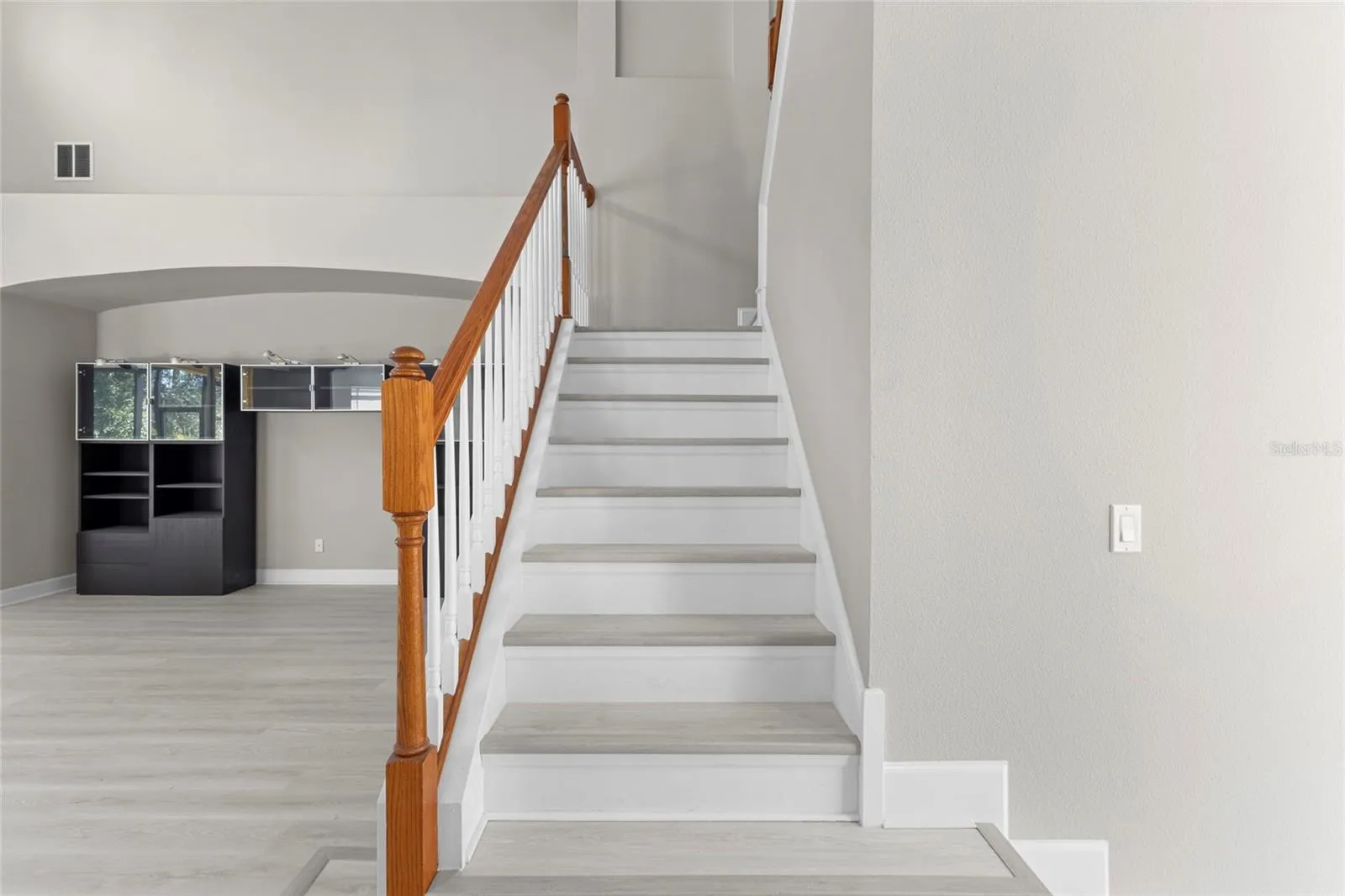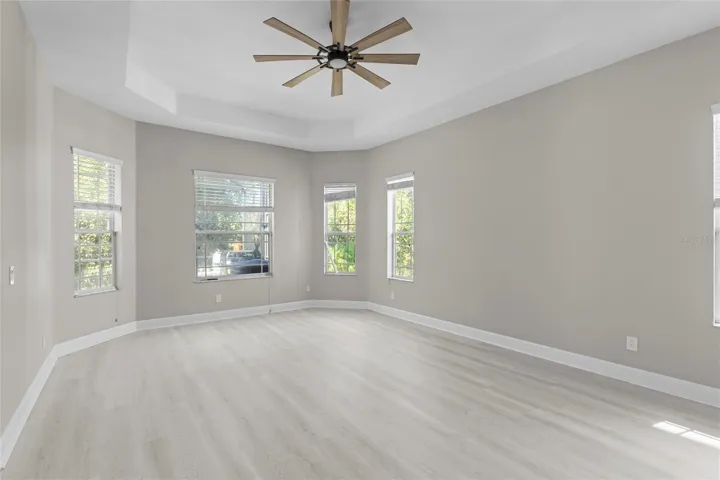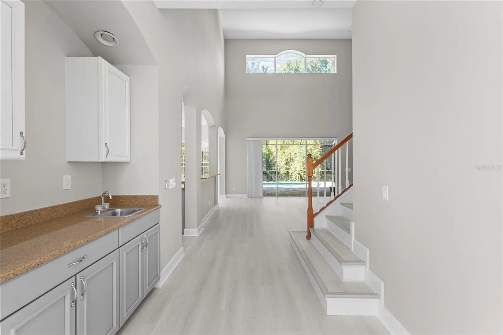 The primary bedroom is conveniently located on the first floor, offering a private retreat with direct access to the caged lanai. Also on the first floor, you’ll find a large kitchen featuring a wet bar, perfect for entertaining, and a spacious dining area, ideal for big gatherings. For added convenience, the laundry room is also located on the main level.