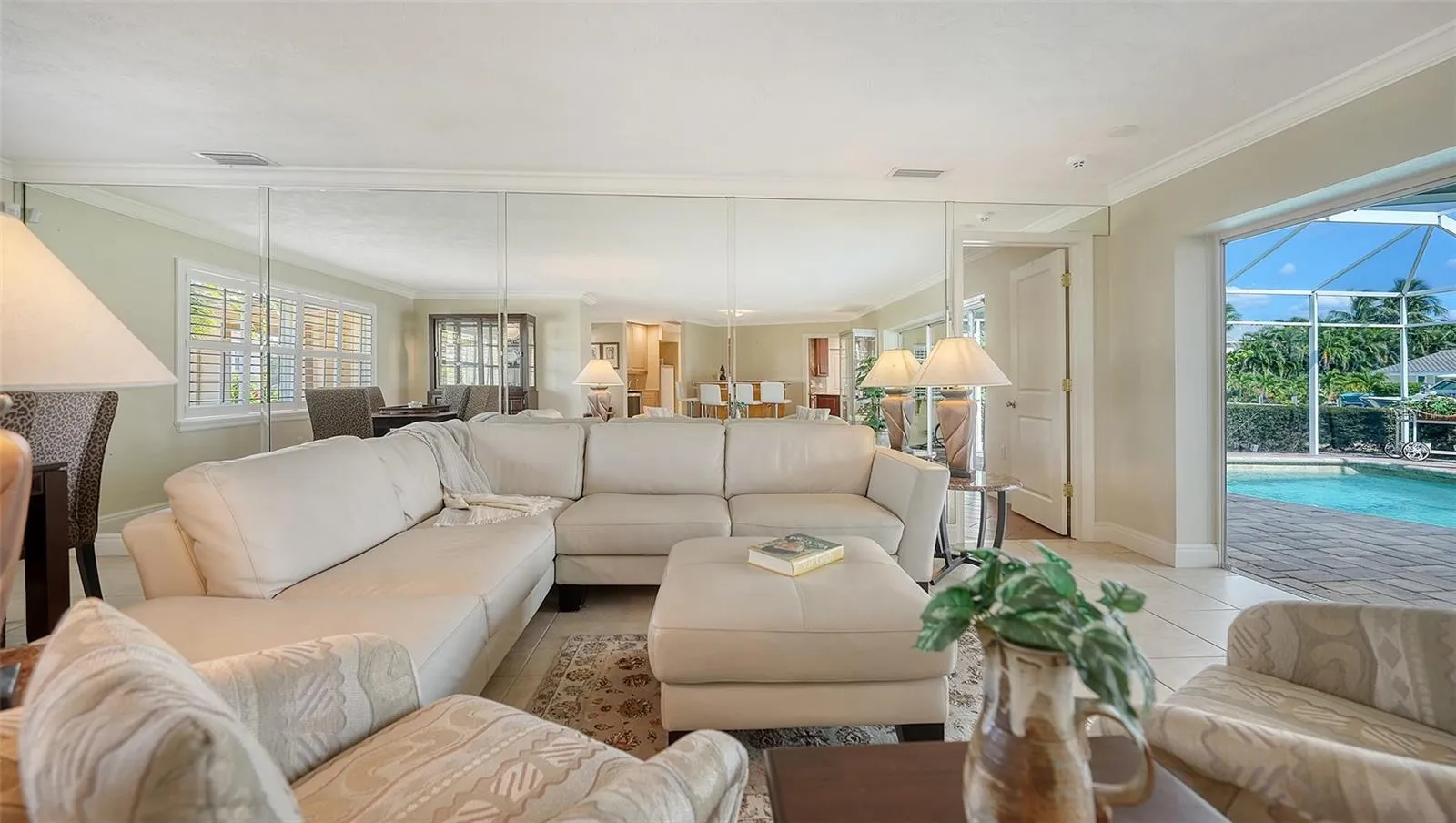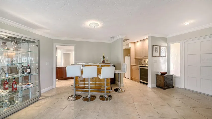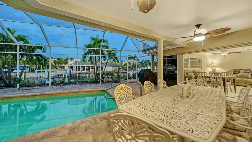 The thoughtfully designed 2,000+ square foot split floor plan provides exceptional privacy with 3 bedrooms and 2 baths, ensuring guest suites are comfortably separated from the primary living spaces. The “secret” closet delivers a private office space for when you need to work or plan your next boat trip down the ICW. At the heart of the home, an expansive great room and dining area showcases a wine captain, wet bar, and large refreshment cooler—perfect for hosting unforgettable gatherings while enjoying views of the shimmering enclosed pool and water views of your canal beyond.