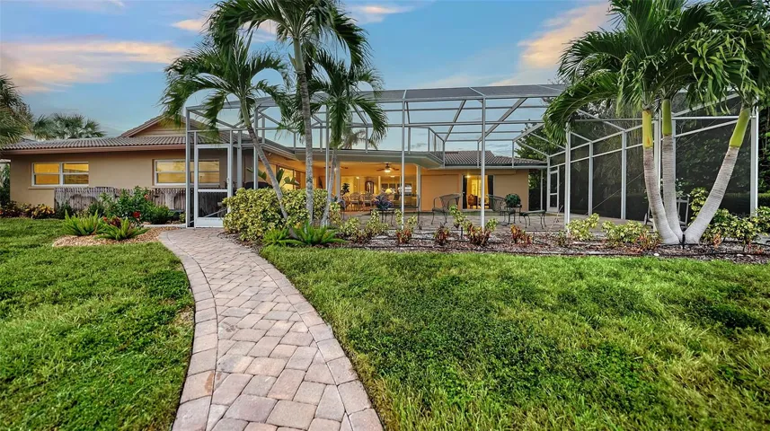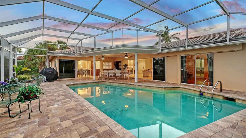 The chef’s kitchen is a culinary masterpiece featuring high-end stainless-steel appliances, built-in ovens, microwave, trash compactor, custom cherrywood cabinetry, separate pantry, and elegant stone countertops with a “chef’s prep” island. The layout seamlessly flows into the family room, where glass sliders invite refreshing bay breezes and open to an entertainer’s dream: an enclosed lanai, expansive paver patio, and sparkling pool surrounded by multiple seating areas and serene tropical vegetation.