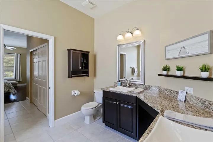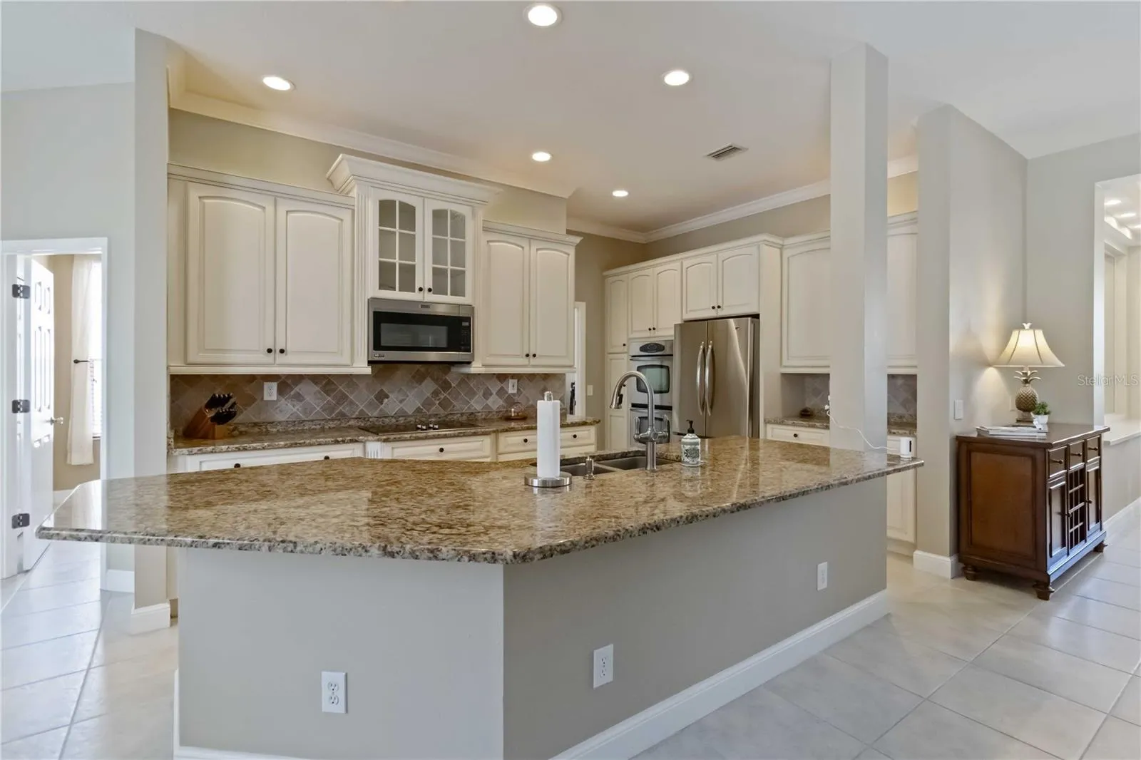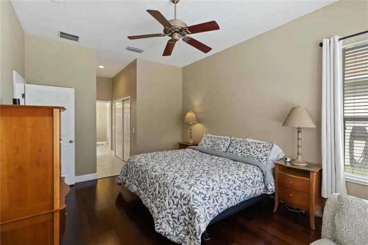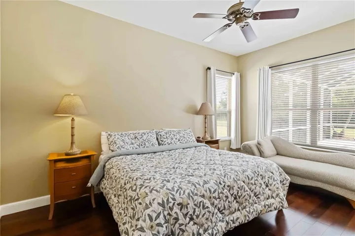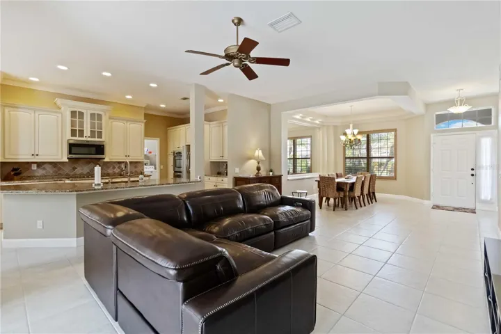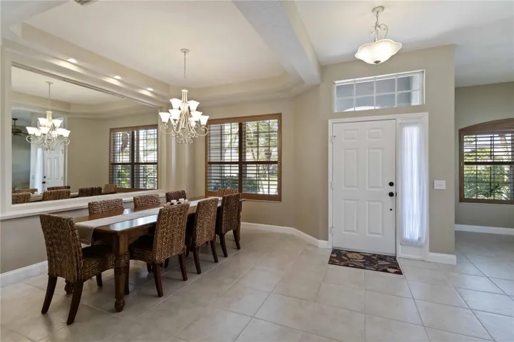 Nestled within a secure, gated community, this beautifully updated, 3-bedroom, 2-bathroom residence offers the perfect blend of luxury and tranquility. Enjoy the assurance of a brand-new roof, complete with a 20-year warranty, as well as a 7-year warranty on the exterior painting completed 10/10/2025. Interior wood shutters adorn the front windows, adding a touch of classic curb appeal. The moment you enter, you’ll be greeted by an open and airy living space, with stylish tile flooring throughout the main areas that flows seamlessly into the elegant, formal dining area. Just off the dining room, a large sitting area provides an ideal spot for relaxation , entertaining or a home office. The heart of the home is the chef-inspired kitchen, boasting upgraded cabinetry, gleaming granite countertops, and a double oven. All appliances are included even the fridge in the garage ,making this home a truly turn-key. Bedrooms are finished with warm hardwood flooring, while seven ceiling fans throughout the home provide comfort and air circulation. Custom window treatments and curtains add a touch of sophistication. Step outside to your private maintenance free yard where a stunning oversized paver lanai and a refreshing pool create a true outdoor oasis for endless entertainment and relaxation. Most furnishings are also available for purchase, offering a seamless transition into your new home.