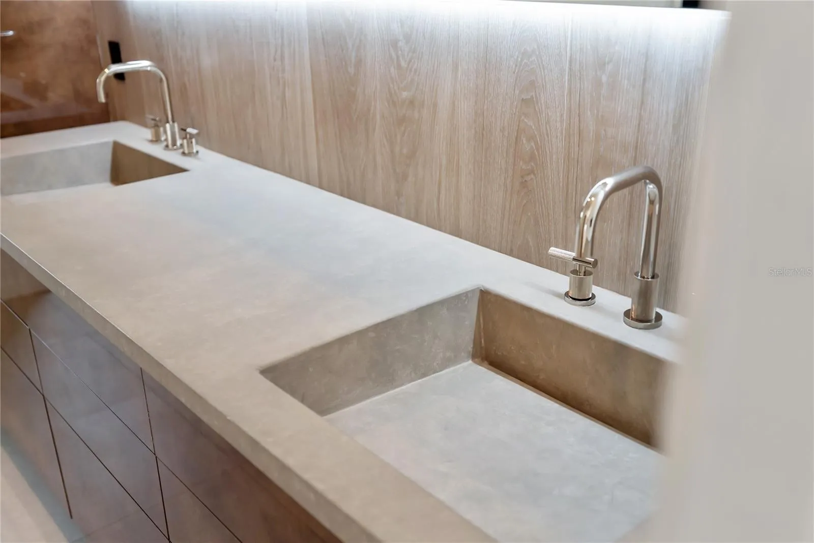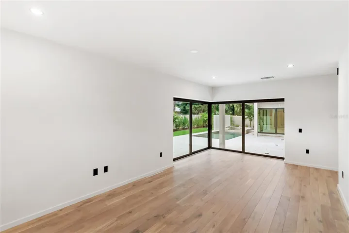 The first-floor primary suite epitomizes luxury with zero-corner sliders that open directly to the pool and outdoor living area. Inside, a spa-inspired bath includes a freestanding tub, walk-in shower, and a custom built-in walk-in closet.