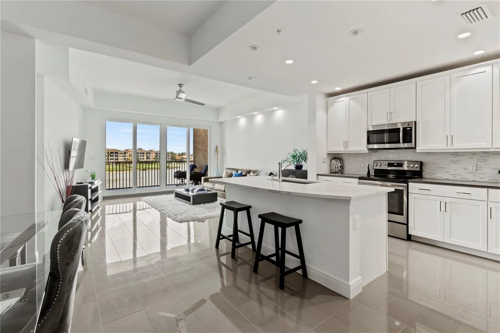 Welcome to your well appointed, third floor, waterfront unit boasting quartz countertops, stainless appliances, and beautiful open floor plan with panoramic views of Lake Uihlein and legacy golf course. This two-bedroom, two full bath unit also includes an office/Den as well as a fully equipped separate laundry room with full-size washer and dryer in addition to a fully enclosed lanai to enjoy coffee or breakfast with a water view. The community also includes an elevator up to all floors, a weight room/fitness facility, community pool, assigned under building parking as well as your own storage area under building as well in addition to having a secure gated entrance as well as coded building security. all of this in the heart of Lakewood Ranch Main Street. Walk out your door and have access to a movie theater, restaurants, shopping and even a hospital. Lakewood Ranch also provides A rated schools. If you wanna enjoy all the conveniences that Lakewood Ranch and/or Main Street have this community would be perfect for you.