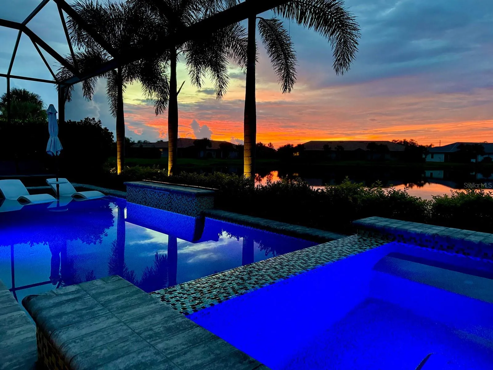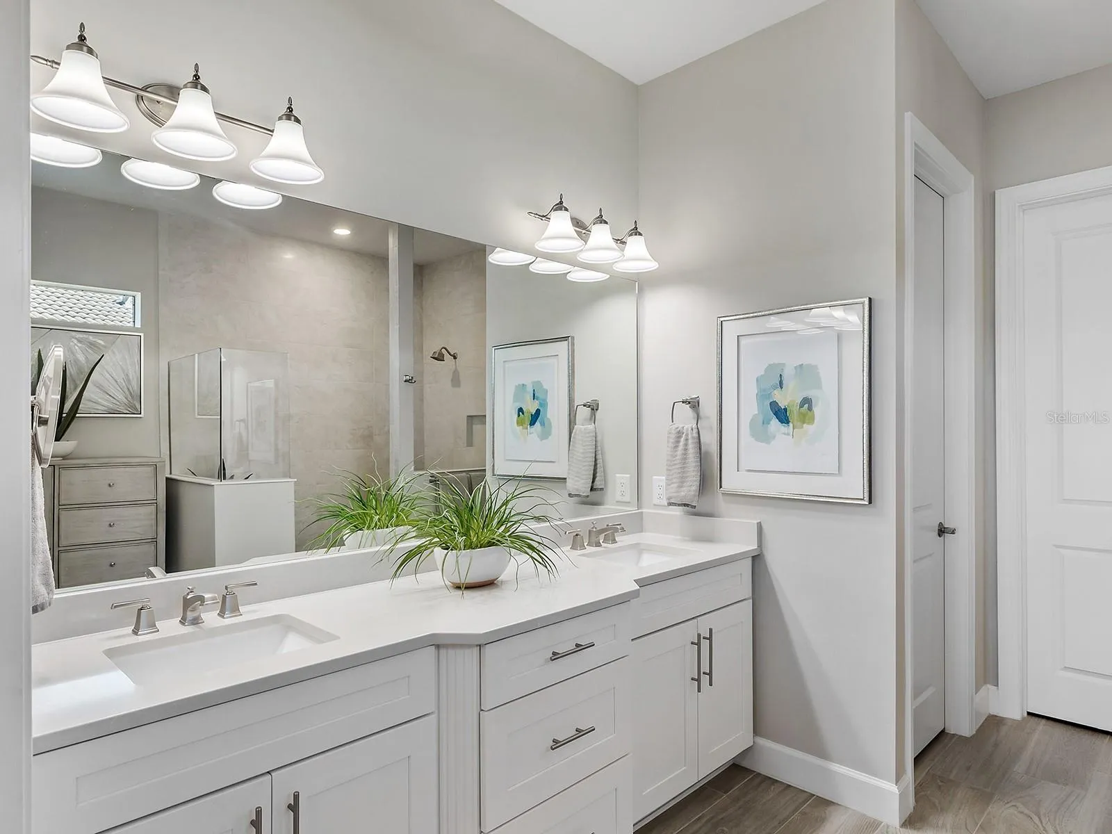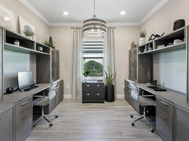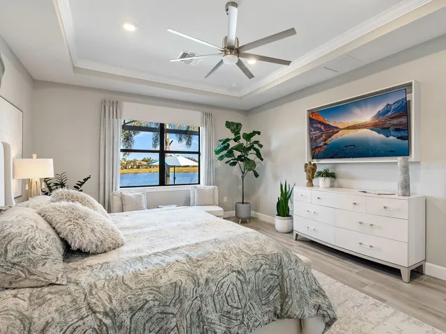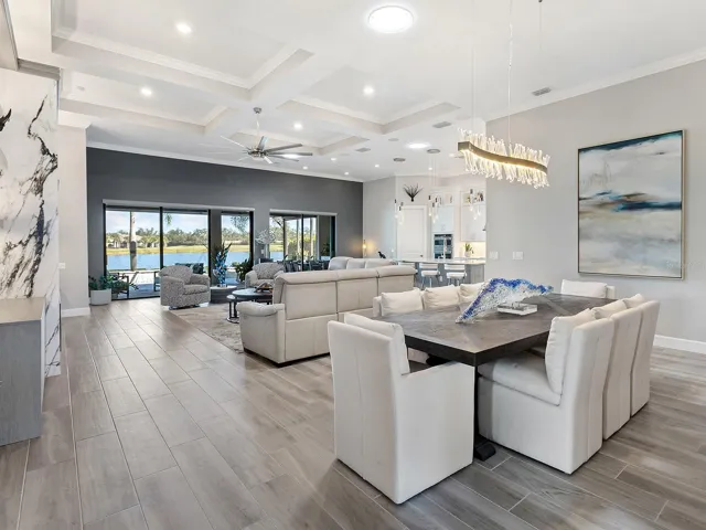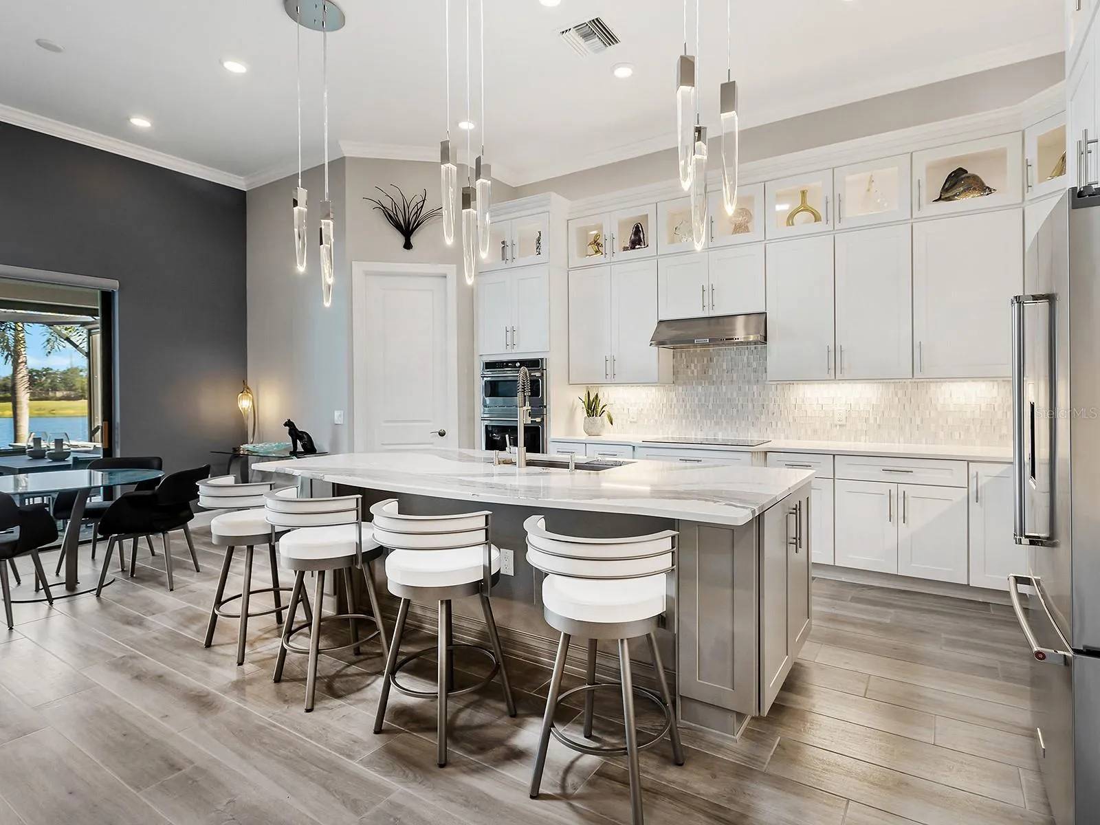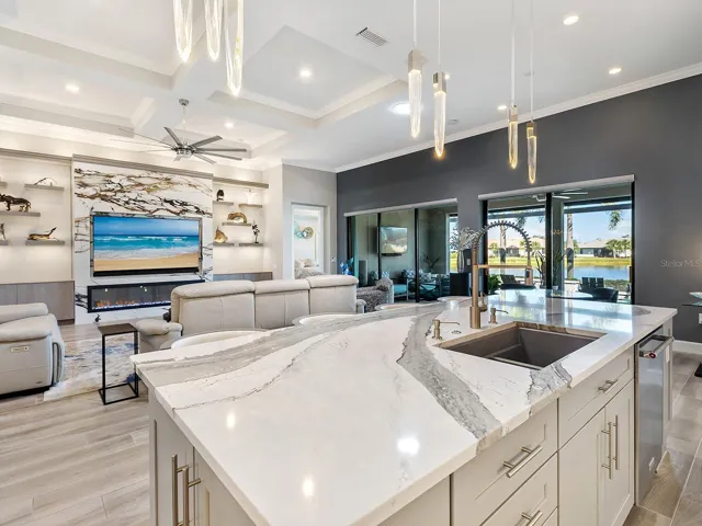 Filled to the brim with clever and beautiful upgrades, this fully FURNISHED home on a prime lakefront lot is the crowning jewel of Del Webb, Lakewood Ranch’s premier 55+ active adult community. Starting with this spacious single level floor plan, the owners made numerous upgrades enhancing the beauty; and then expanded on those upgrades throughout 2022 to 2025 improving the form, function and appearance of this residence even more. From the moment you enter you will be greeted by upscale front landscaping with rocks and lights, large lake views, wood-look porcelain plank flooring throughout, an open floor plan ideal for entertaining and custom upgrades in every room that make this home truly one of a kind. The central great room boasts a 2023 feature wall with custom built-in cabinetry and under-lit floating shelves, a full porcelain wall with 85” TV, built in sound system, electric fireplace and solar skylights, plus coffered ceiling and wall of sliding glass doors to the lanai. The opulent formal dining room features a showstopping custom dry bar added in 2023 with granite counters, crackle glass display cabinets, and custom handpainted backsplash, plus 2023 crystal chandelier. The chef’s kitchen shines with 2023 Calacatta quartz island counter, 2023 crystal pendants, custom two-tone cabinetry with additional lit upper glass displays, walk-in pantry, and adjacent dinette. The stainless-steel appliance suite includes 2021 induction cooktop (pre-plumbed for future gas cooktop if desired), dishwasher, 2023 Advantium built-in microwave and wall oven, and refrigerator. Through the sliding glass doors, take in the gorgeous lake views from the 2021 paver lanai with summer kitchen, pool and motorized hurricane screens. Enjoy meals alfresco from the outdoor kitchen with stainless steel grill, dual-drawer bar fridge and side burner. Lounge by the lakeside in your custom 2021 pool with large sunshelf, raised spa, fire bar, water features and surrounded by panoramic screen enclosure with additional integrated sunshade for privacy on the east side. Inside the primary bedroom is your private oasis with sunset lake views, large walk-in closet with custom shelving and spa-like bathroom with oversized walk-in shower. Guests will cherish the two guest bedrooms and two full guest bathrooms outfitted with luxe upgrades. When you’re ready for privacy, retreat to the study with dual walls of desks and storage. Also included in this impeccable residence is a laundry room with 2023 floor-to-ceiling storage cabinetry and large folding counter, along with an expanded 3-car garage with its own air conditioner and workshop space. Enjoy premium peace of mind with a 2023 Kohler whole-house GENERATOR and 2023 whole-house storm power and roller shades. Additional upgrades include blackout window treatments, 2023 gas pool heater and salt cell and 2023 upgraded front landscaping. Offered fully FURNISHED, this residence is ready for you to move in right away! Del Webb is a premier 55+ active adult, gated community with extensive resort-style amenities and social activities including an expansive clubhouse, restaurant, fitness center with classes, resort-style pool, lap pool and spa, outdoor and events areas, dog park, tennis and pickleball courts, social clubs and events, full-time lifestyle director and more! Lakewood Ranch is the top multi-generational community in the country for seven years in a row with plentiful shopping, dining, parks and nearby beaches.