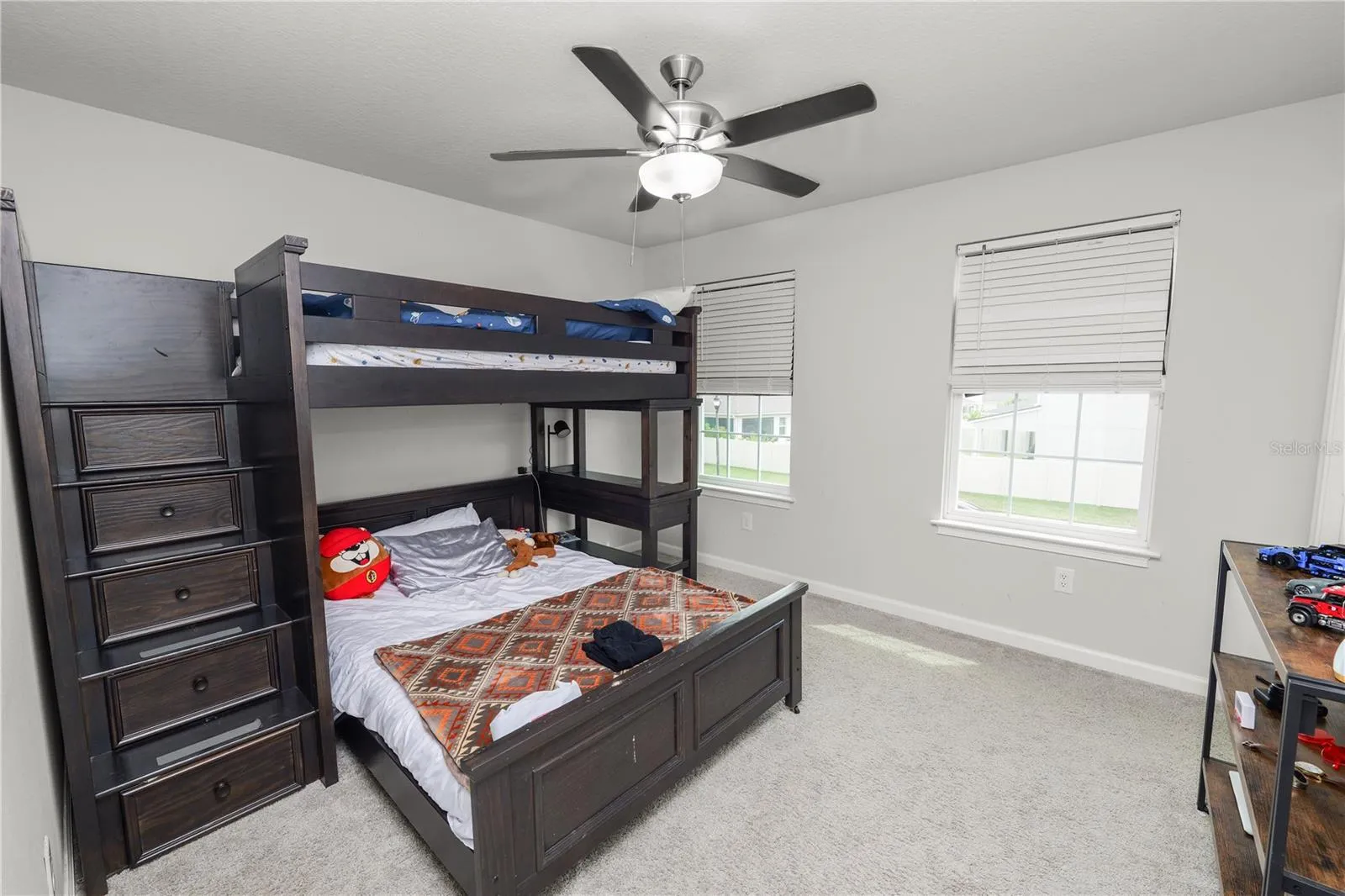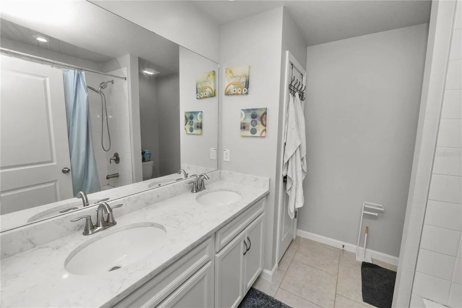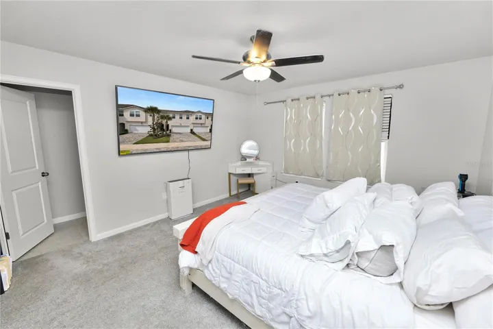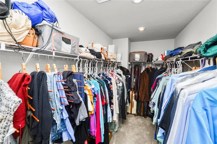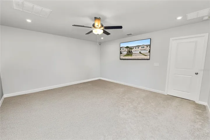 Upstairs, a spacious loft-style family room separates the primary suite from the secondary bedrooms, providing privacy and additional living space. The primary suite is a peaceful retreat, offering two walk-in closets and a luxurious en-suite bathroom with dual quartz vanities, a large walk-in shower, private water closet, and a linen closet. Both secondary bedrooms include walk-in closets, with one featuring stylish upgrades such as wood slat accents, wallpaper, and a decorative rattan light fixture. A full hallway bathroom with modern finishes completes the upper level, along with a convenient laundry room.