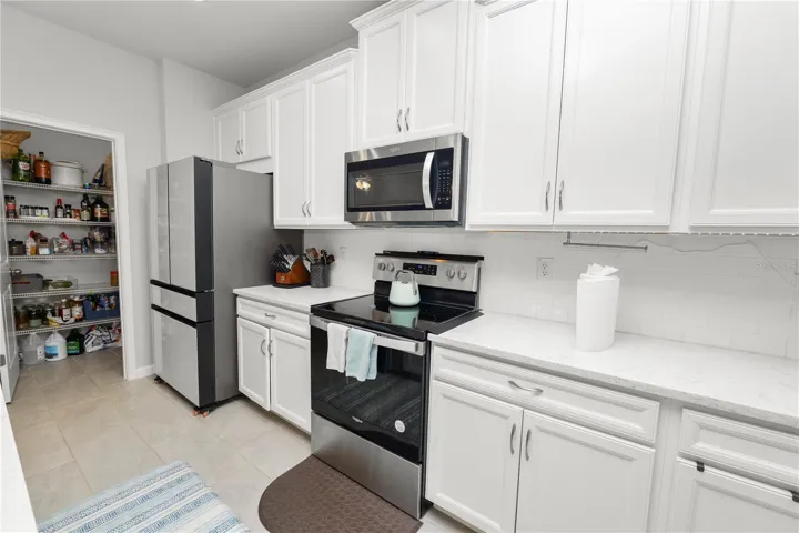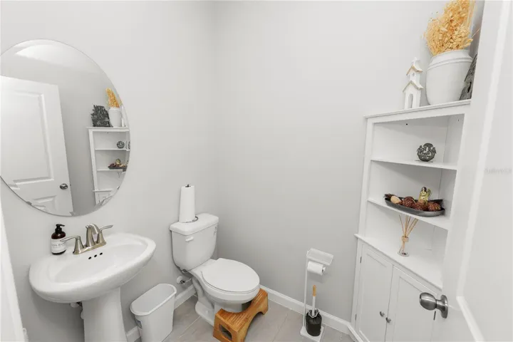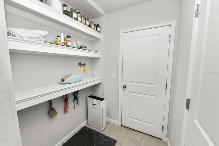 The kitchen is a chef’s dream, complete with solid wood cabinetry, quartz countertops, stainless steel appliances, a walk-in pantry, and a convenient breakfast bar. Just off the kitchen, a custom-built mudroom area features a bench with storage, coat hooks, and floating shelves for added organization. A downstairs half bath and extra storage closet add to the home’s functionality.