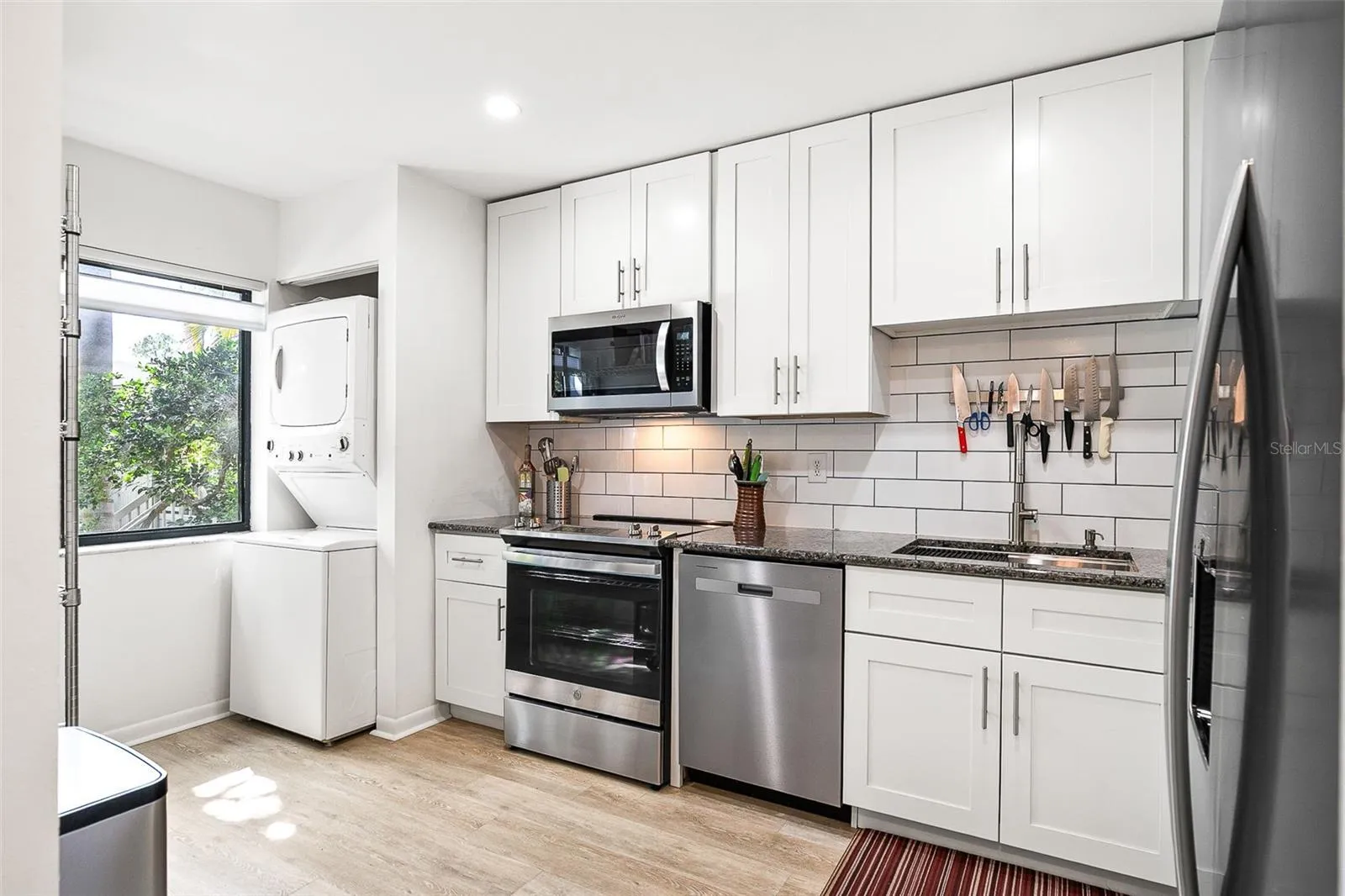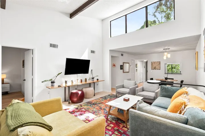 Step inside this recently remolded unit to a lofty, light-filled open floor plan. The renovated kitchen is spacious and bright with all new stainless-steel appliances, and granite countertops. A huge sun-dappled living room with vaulted ceilings and transom windows, shares space with a substantial dining nook. Large sliding glass doors open out to a shady screened in porch framed in by old-growth live oaks and cabbage palms. The generous primary suite features a beautifully refreshed bath and a tranquil view of the surrounding greenery, while the second bedroom provides the perfect space for guests with an adjoining full bath, or a serene home office.