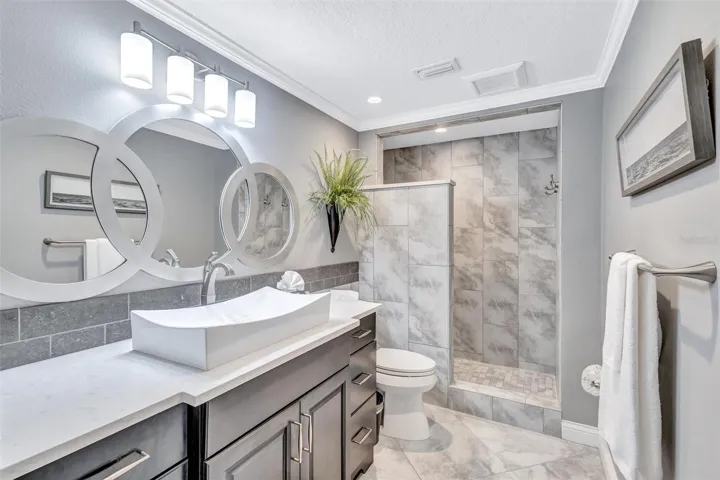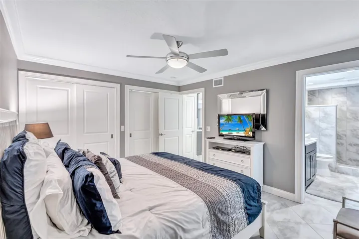 The bedroom offers custom closets and en-suite bath with a modern walk-in shower. A large walk-in pantry provides extra storage. Add a sleeper sofa or Murphy bed to easily host guests.