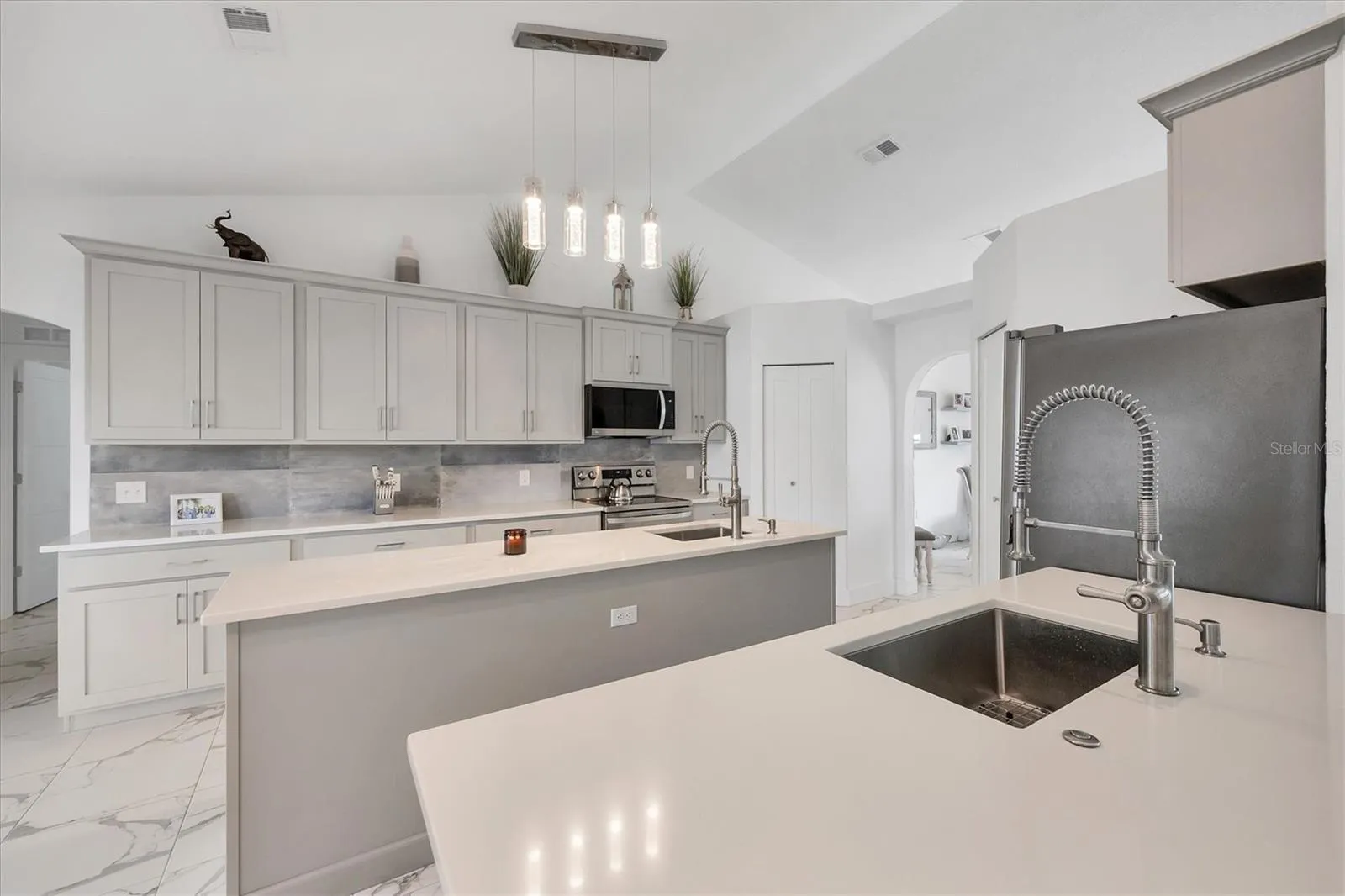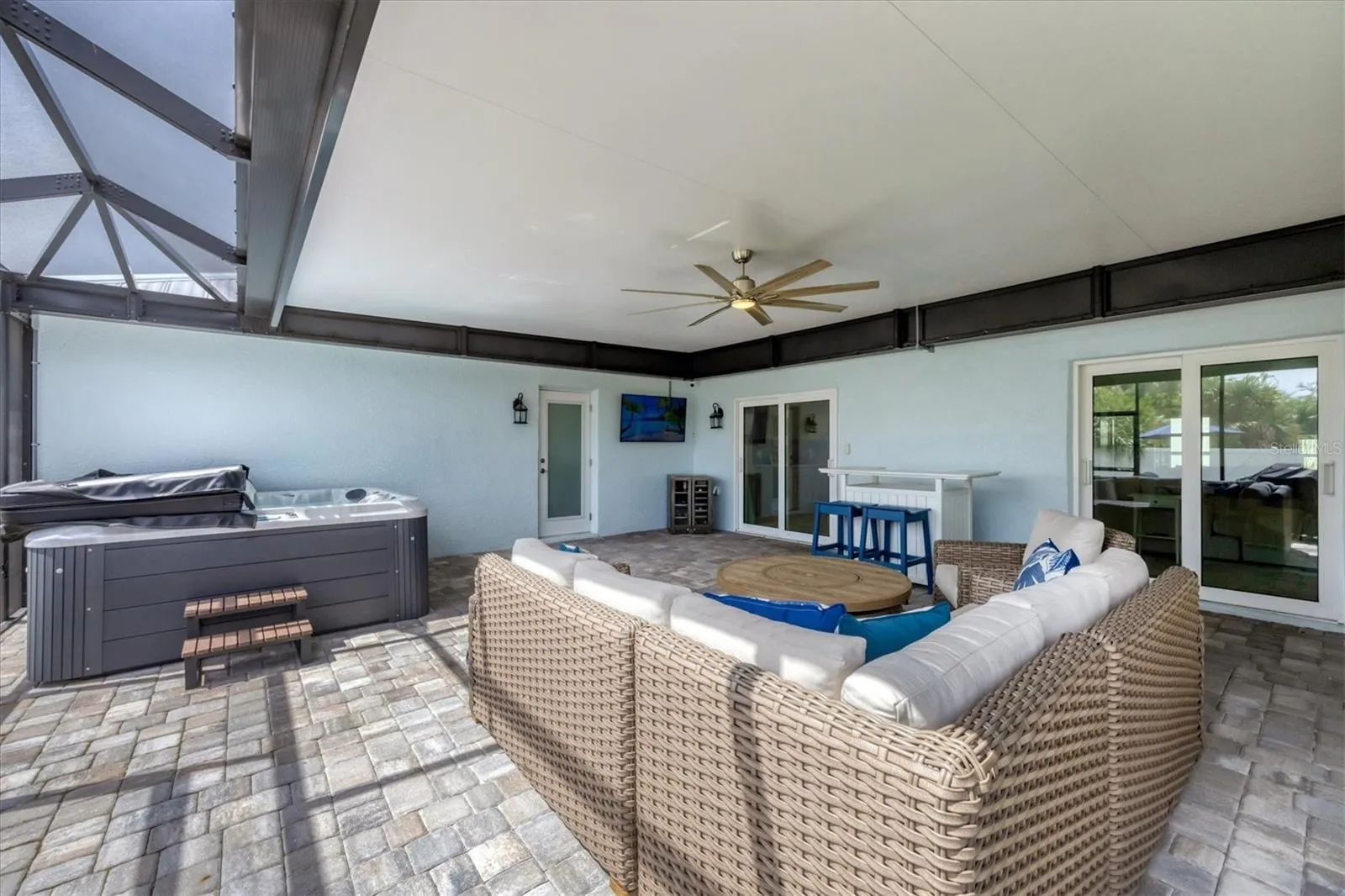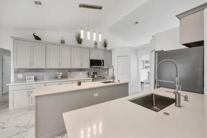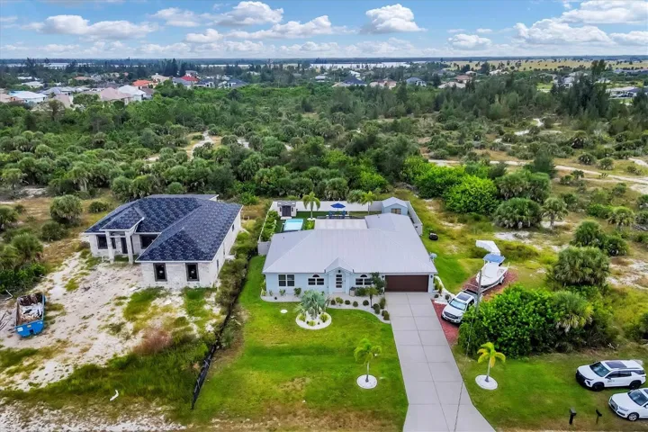 This beautifully renovated 4-bedroom, 2-bathroom home with a 2-car garage sits on an expansive 0.46-acre double lot – offering endless possibilities. Whether you’d like to build another single-family home, add a guest house, or have additional privacy, this property provides exceptional flexibility and value. Originally built in 2006, the home underwent a complete renovation in 2023, making it feel like new construction. Every detail has been thoughtfully updated, from the new metal roof with the 3rd nail for enhanced protection, to the high-impact windows, doors, and garage door for peace of mind. Step inside to soaring ceilings and an open floor plan that seamlessly blends style and function. The main living area and primary suite feature vaulted ceilings, creating a light and elevated feel. The kitchen is a chef’s dream, boasting dual oversized islands, two sinks, quartz countertops, Schaefer cushion-close cabinetry, porcelain tile backsplash, and a two walk-in pantries with custom wood shelving. The split floor plan ensures privacy, with the primary suite tucked away as a true retreat where you can enjoy dual walk-in closets, and a spa-like ensuite bath. Outdoor living is a dream here – relax on the extended screened lanai in the 6-person hot tub, take a dip in the above-ground pool, or gather around the fire pit under the stars. Two storage sheds provide plenty of space for tools and toys, and with no HOA, you have the freedom to enjoy your property your way. Additional highlights include a 3-stage whole-home water purifier, reverse osmosis system in the kitchen, and modern finishes throughout. This move-in ready home offers the perfect blend of comfort, security, and versatility. Schedule your private showing today!
