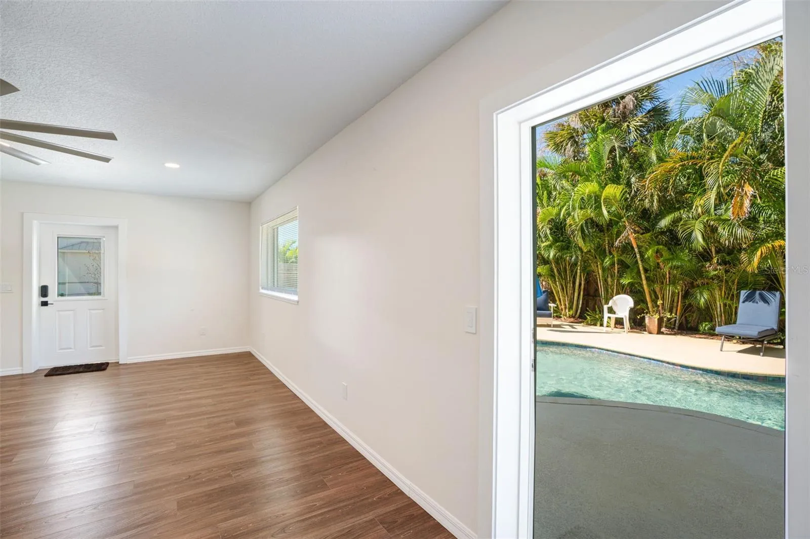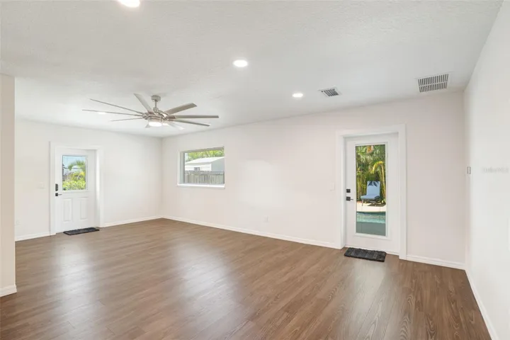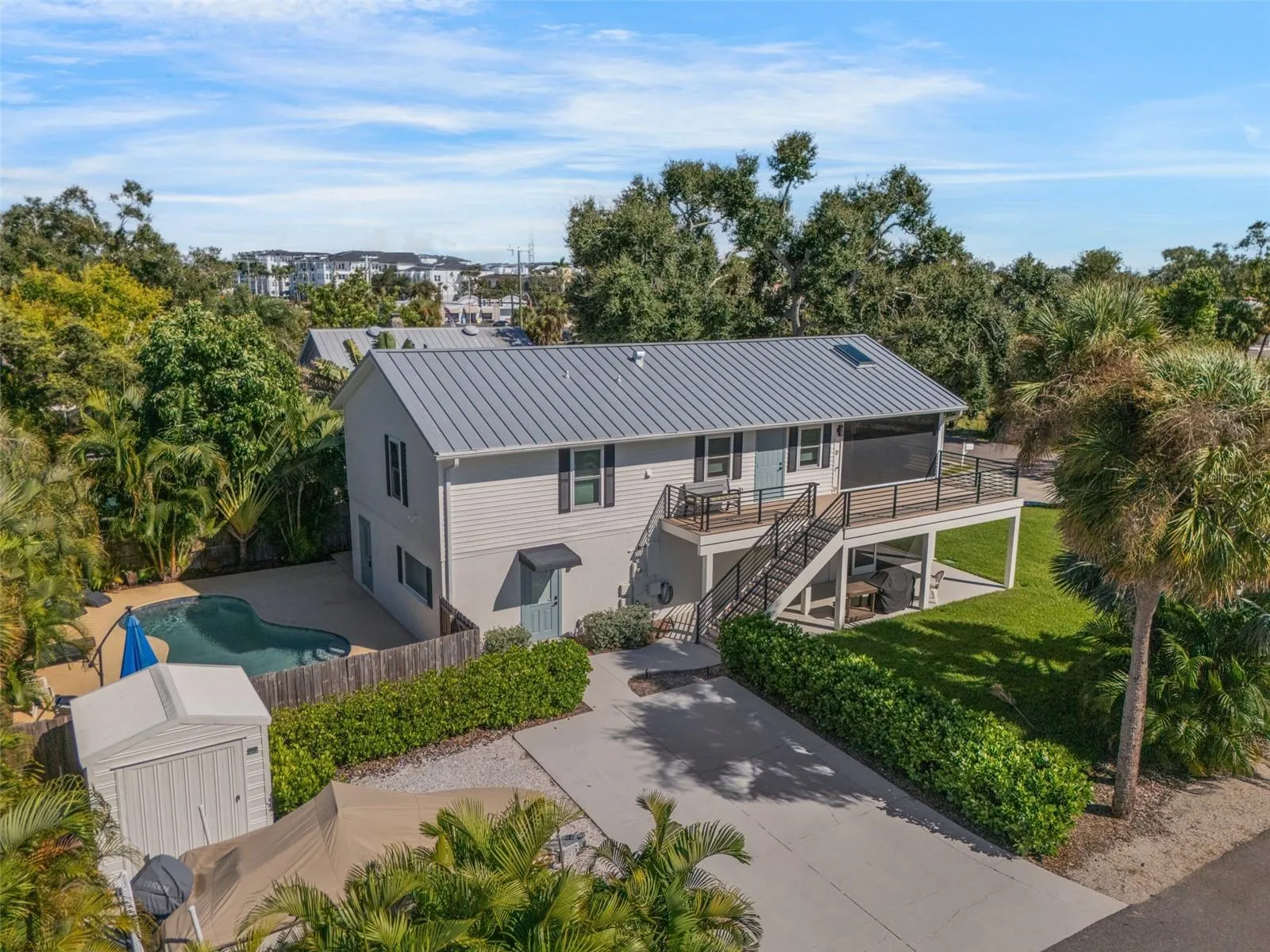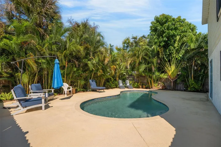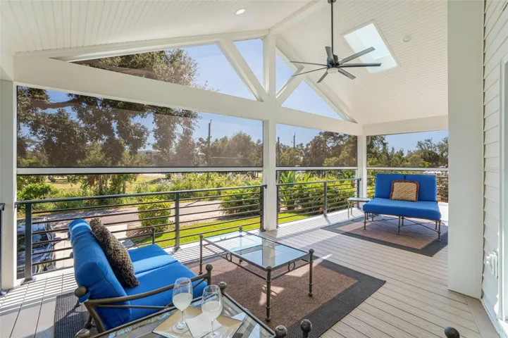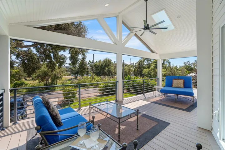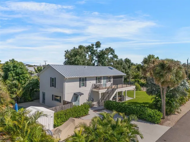 Live like you’re on vacation in this updated Key West–style home West of the Trail. Upgrades include a new standing seam metal roof, hurricane impact windows, electric tankless water heater, wraparound “Lifeproof” composite decking, and a custom heated pool. Interior features vaulted ceilings with a mix of travertine, LVP, and tile flooring, plus a kitchen with solid wood cabinets, stainless steel appliances, beadboard ceiling, and custom backsplash. The screened second-story porch has an electronic roll-up system for open-air or enclosed comfort. A unique “hidden” door design allows the home to function as one residence or two separate units, with the lower level offering its own entrance, bedroom, bath, family room, and laundry—perfect for in-laws, guests, or rental income. Outdoors, enjoy lush landscaping, a tropical pool setting, and unbeatable location just a block from the public dock and kayak launch. Minutes to Sarasota, Venice Island, beaches, Legacy Trail, and Spanish Pointe.