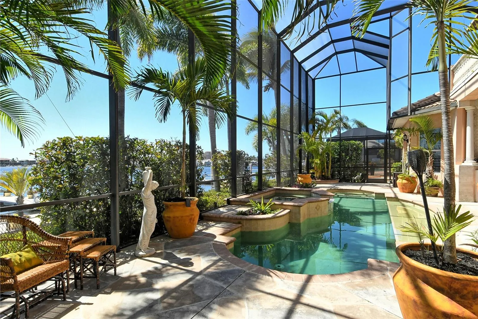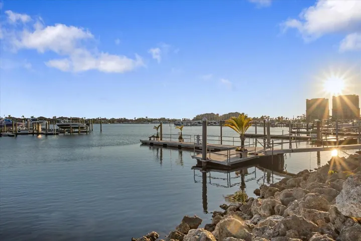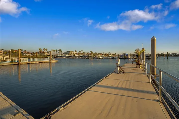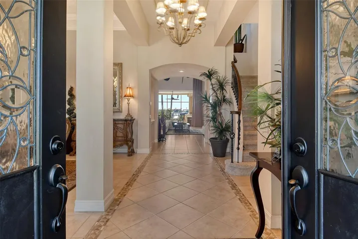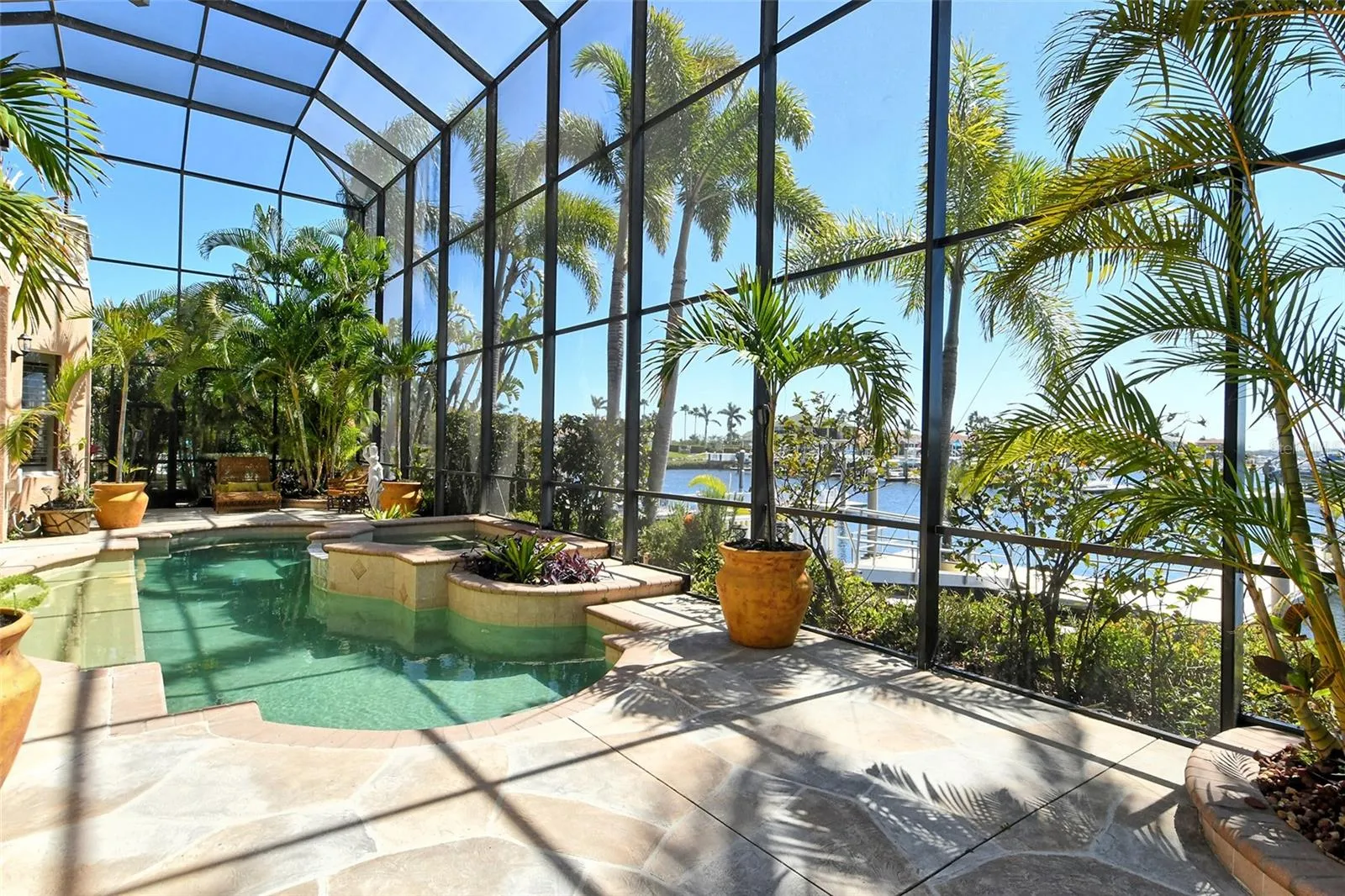 Welcome to Casa de Avrille. Nestled within the exclusive gated confines of Riviera Dunes, this residence stands as a testament to luxury and beckons to those who appreciate the finer things in life. Upon crossing the threshold, one is immediately mesmerized by the allure of high ceilings, luxury appointments, a stunning dining room and a view of their yacht in the expansive basin beyond. The living and dining spaces flow effortlessly. A butler’s pantry flanks the entrance to the kitchen, where culinary delights await. Equipped with a generous working counter and a suite of gourmet appliances, the kitchen and family room provide an open and inviting space for relaxation with family and friends. Adorning the family room, a wall of sliding glass doors stands as a gateway to an outdoor oasis, inviting guests to step outside and indulge in the splendor of the stunning pool patio. One is surrounded by the ambiance of tropical splendor as Southern exposure provides golden sunrises and sunsets. A full outdoor kitchen and gas fireplace are perfect for alfresco entertaining under the starlit sky. The primary ensuite is a sanctuary unto itself, with panoramic views of the pool and water. The lavish master bath offers another tranquil oasis complete with a soaking tub, oversized shower for two, wine and coffee bar, dual vanities and toilets. Also, on the first floor one will find a theater room, an ensuite bedroom and two additional bedrooms. Ascending the second floor reveals a spacious great room with a wet bar wrapped with a second-story patio that affords additional outdoor enjoyment. A second primary ensuite with picturesque water views completes the upper level, offering a retreat from the world below. Living is easy and secure with hurricane rated windows and doors, a whole house generator and tankless water heater. Situated along a hurricane shelter basin with deep water dockage and direct access to Tampa Bay, the Intercoastal Waterway and the Gulf, this property boasts an oversized dock primed for up to a 56-foot yacht. This community is centrally located with proximity to Tampa, St. Petersburg and Sarasota as well as the coveted beaches of Anna Maria Island. From its unparalleled location to its lavish amenities and meticulous attention to detail, this residence stands as a testament to luxurious waterfront living at its finest.