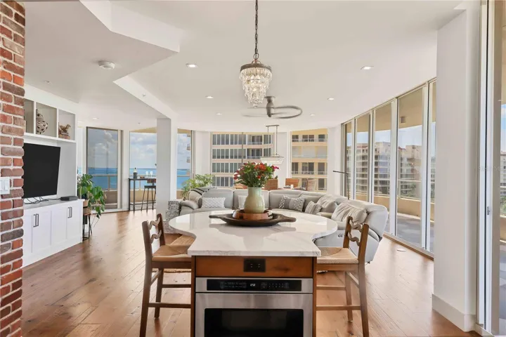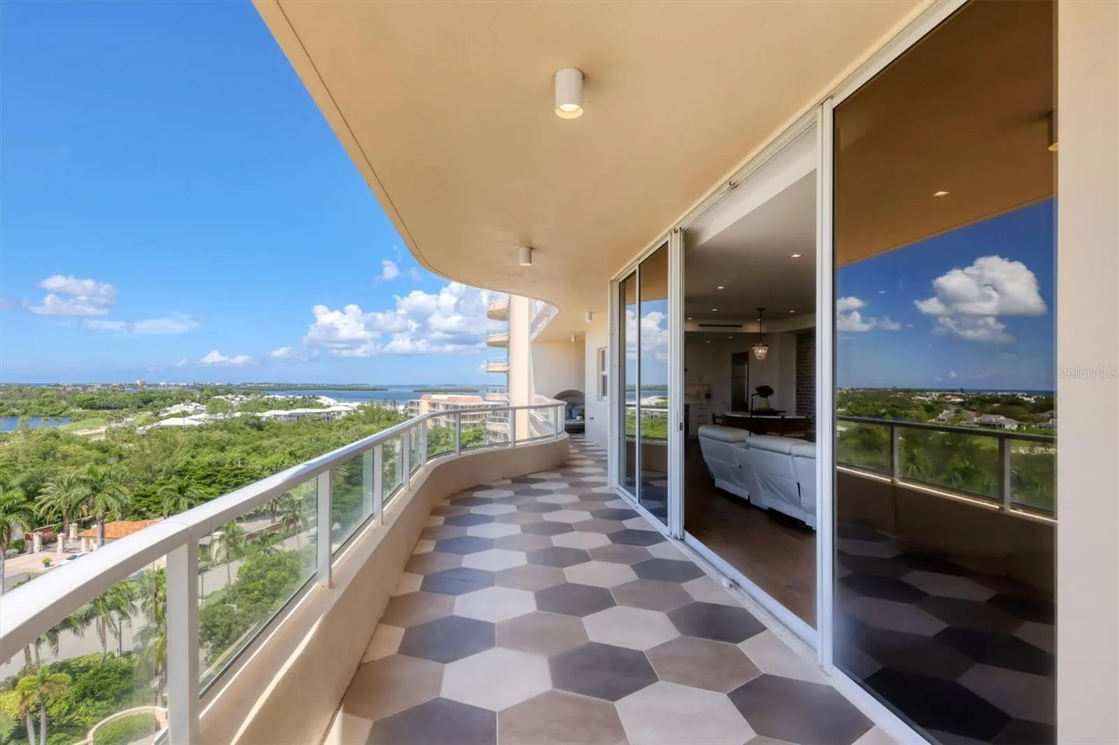 One or more photo(s) has been virtually staged. This home has unobstructed seventh-floor views of the Sarasota skyline, along with sweeping water views of Sarasota Bay, The Longboat Key Club and the Gulf. Enjoy the views from sunrise to sunset through the floor-to-ceiling windows and sliding doors. Go outdoors to experience the luxury of the stylishly tiled wraparound balcony, accessible from the east, south and west sides of this home. A total renovation enables you to move right in. The stunning interior redesign optimizes the views and maximizes the living space. You’ll be impressed with the private elevator entrance which opens to the main living space, where you’ll find a large dining area and a charming dry bar. The innovative design extends throughout the home, highlighted by a gourmet kitchen with luxury Italian appliances, exquisite cabinetry, and an island/breakfast bar with extra storage. Wake up each morning in the primary suite to the breathtaking views and convenience of two generous closets, one a substantial walk-in. The large primary bath has double vanities with illuminated mirrors, dual water closets, custom linen storage and a spacious shower with a rain head. Guest accommodations are equally impressive, with a comfortable guest suite featuring west-facing views, stylish finishes and a closet with custom built-ins. A third bedroom was designed to accommodate bunk beds with special lighting and mobile phone charging stations. This space can also easily serve as an office, library or studio. You’ll find abundant storage in the hall closets, all outfitted with custom built-ins. There is a water filtration system in place and a new hot water heater, located in the laundry room. Parking for this home is on the lobby level with close access to the lobby, which makes life easy. There is also extra parking at the building. This move-in-ready home is a wonderful find. The Grand Bay community offers exceptional privacy, with superb amenities including a newly refurbished gym, two pools with spas, Har-Tru tennis courts and a clubhouse. Membership is included to the private Bay Isles Beach Club with access to five acres of gulf beach perfection, restrooms and beach chair storage. From this home, it’s easy to go to the Longboat Key Club where you’ll find 45 holes of golf, five private restaurants, a world-class tennis center and new pickleball courts, all available with separate membership.
