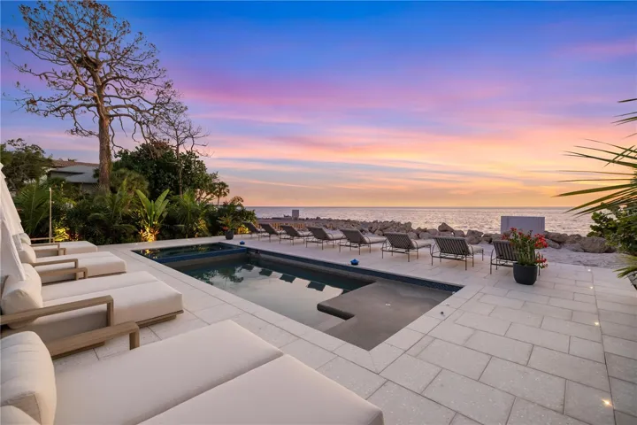 Pull into the property through the gated entry, with a paved driveway for ample parking. The ground level offers a 3-car garage, spacious private fitness studio with AC, large flex space/storage room, and huge game room that leads out to the truly special backyard – with premium turf, silica sand and a putting area. Host a sunset dinner with the full outdoor kitchen, including a freezer, wet bar, beverage center, ice machine, and 6-burner grill. Have a drink while sitting in the pool facing the ocean, relax in the champagne spa hot tub, or tan on the sun shelf. Put your toes in the sand area of the backyard, or take the paver steps down to the private beach and swim in the ocean – the ultimate paradise.