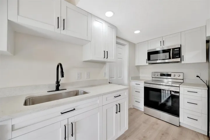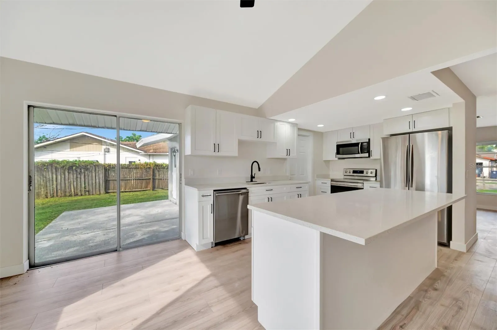 YOUR NEW CHAPTER STARTS HERE!! Experience the ultimate living with this beautifully renovated 2-bedroom, 2-bath home, where every detail has been thoughtfully designed for style and comfort. Step inside to a spacious open-concept living area that flows effortlessly into a sunlit kitchen featuring brand-new cabinetry, sleek quartz countertops, and stainless steel appliances. Luxury vinyl flooring extends throughout, creating a cohesive and inviting atmosphere. Wake up each morning to beautiful lake views right from your backyard, and take advantage of the expansive outdoor space—perfect for gatherings, relaxing weekends, or even building your dream pool. The fully fenced lot ensures privacy and gives you the flexibility to create your own outdoor oasis.