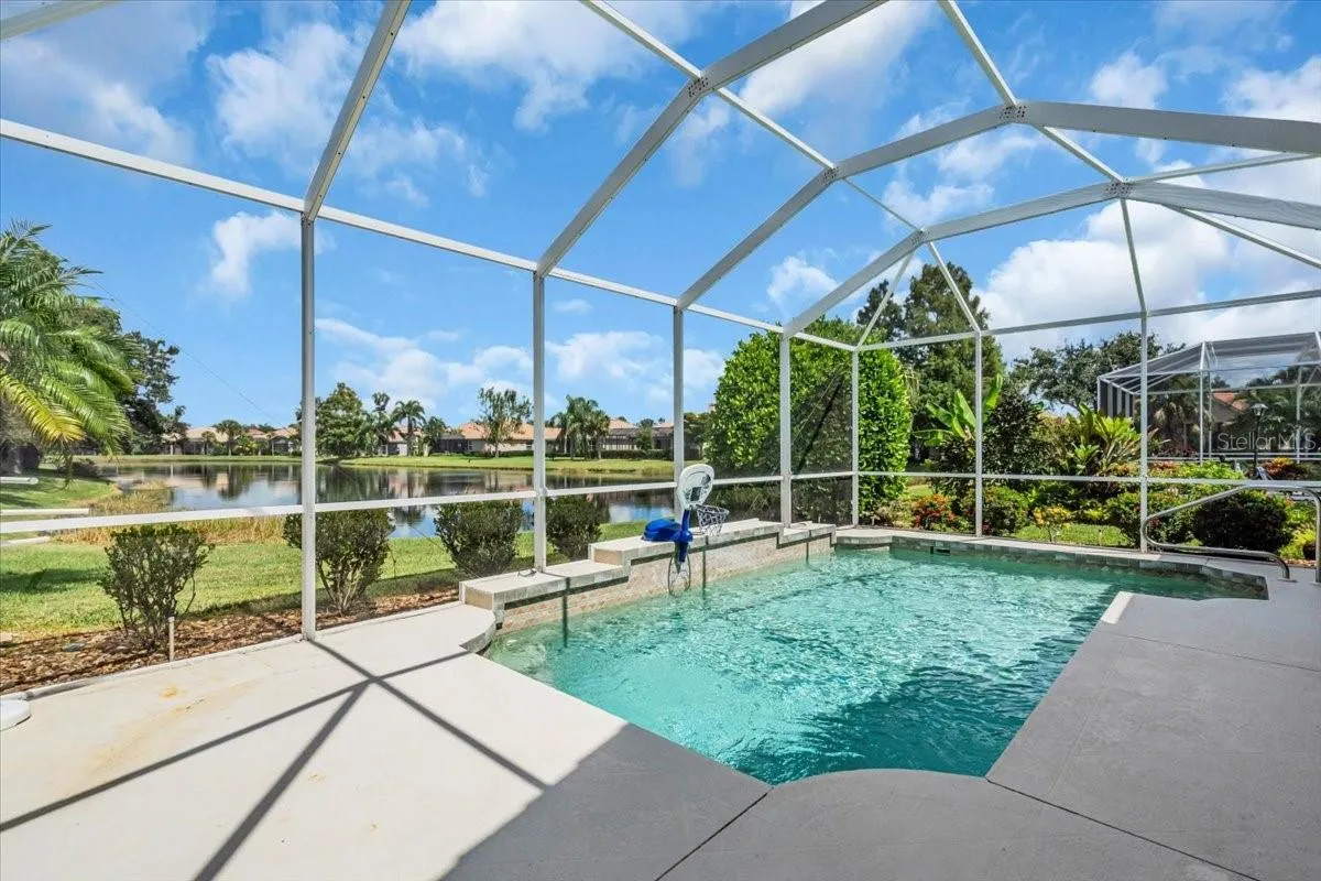 This home features a pool with screened in pool area overlooking a neighborhood pond.