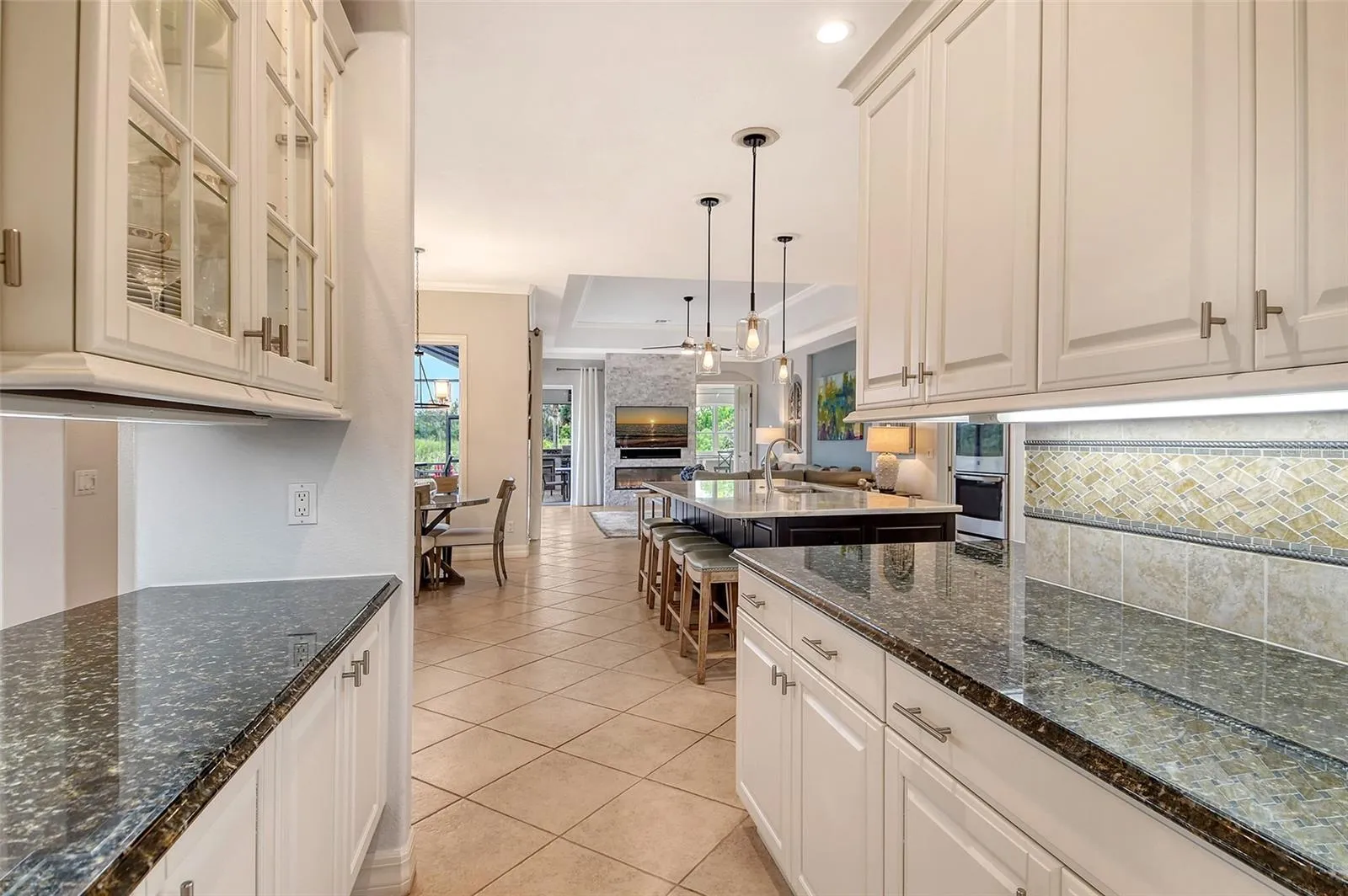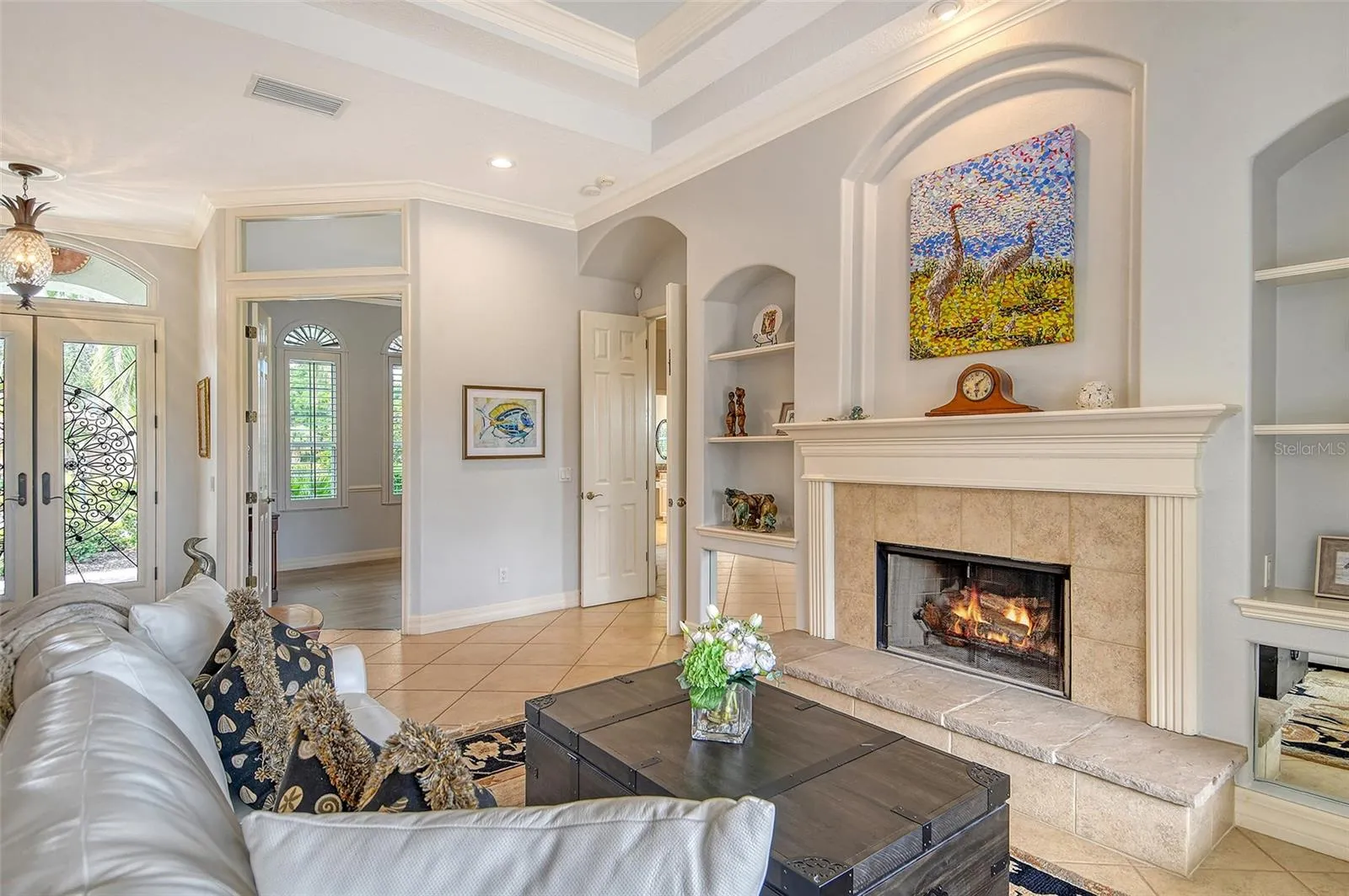 Inside, natural light pours through expansive sliding glass doors that frame the panoramic views, creating an inviting, open atmosphere perfect for everyday living or entertaining. The updated gourmet kitchen is a chef’s dream, featuring a striking marble island, premium appliances, and custom cabinetry, all flowing seamlessly into the spacious living areas. A formal living room offers a relaxing retreat with wide aquarium windows with views to the pool and nature preserve along with a real wood-burning fireplace.
