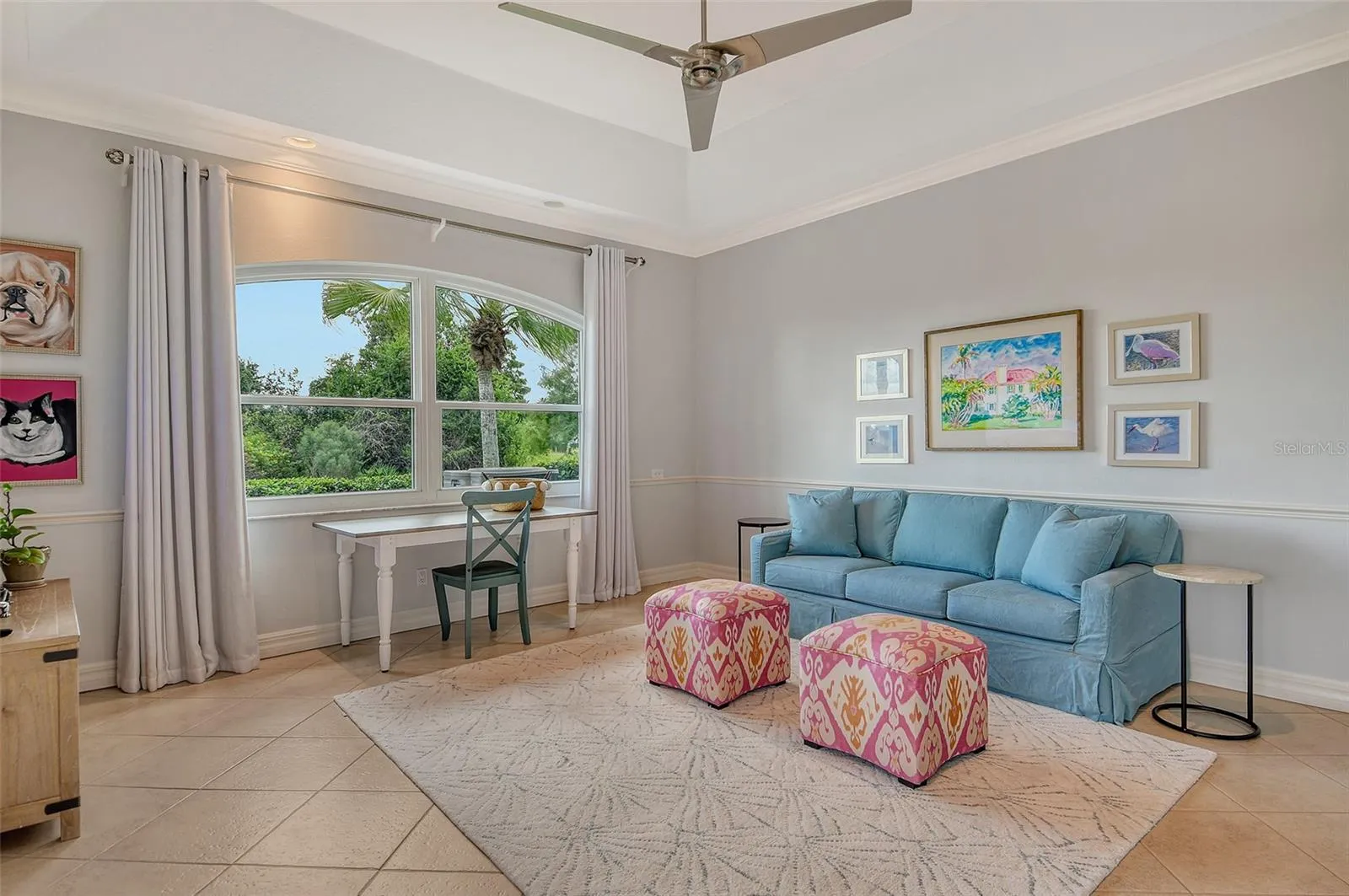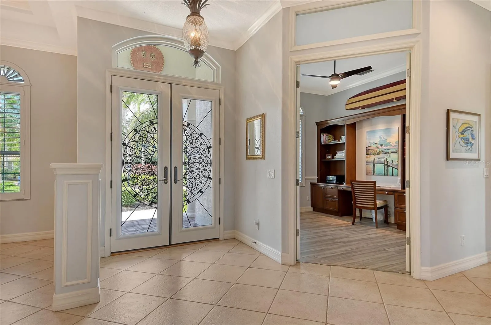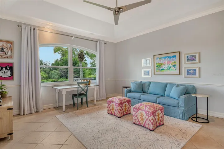 The primary suite is a true retreat, offering peaceful views, a custom walk-in closet, and a spa-like bath with dual vanities, soaking tub, and oversized shower. Adjacent to the primary suite, the executive office boasts a solid wood-built in desk, cabinetry and file storage. The bonus room opens directly to the outdoor kitchen and living area, making it the ultimate spot for entertaining or relaxing after a round of golf.