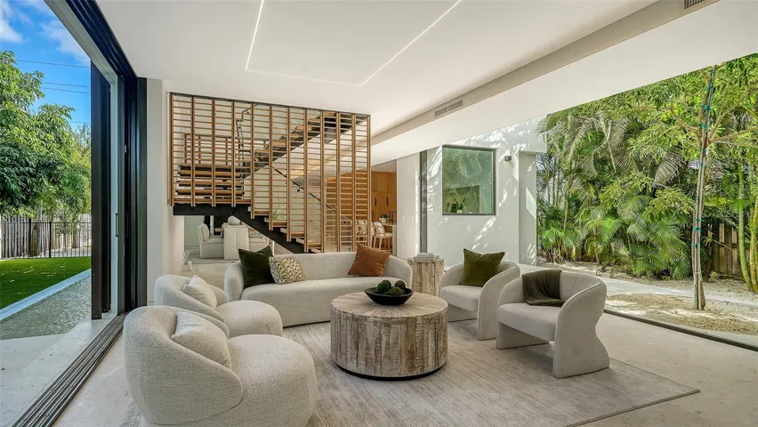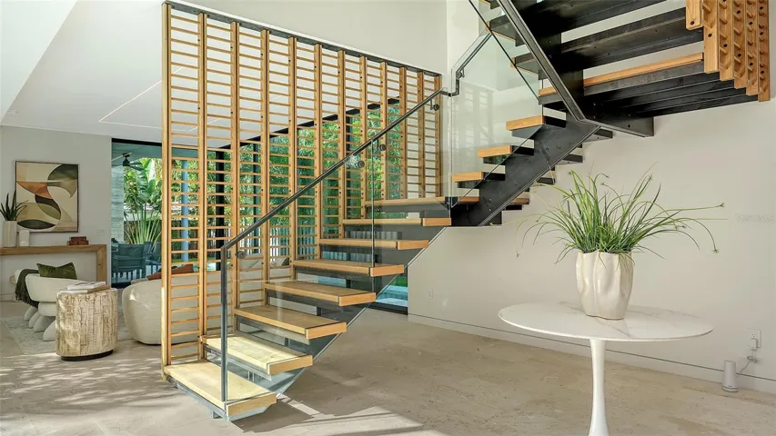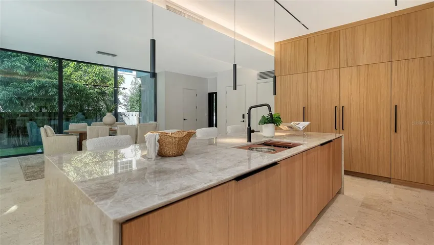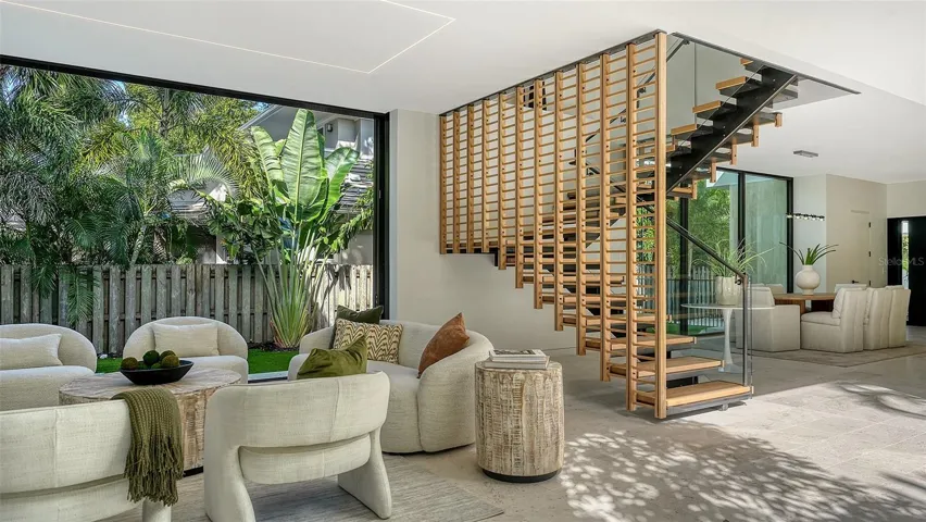 Stunning New Construction by Award-Winning Architect Dan Lear in coveted West of Trail Neighborhood** This meticulously designed luxury home offers the perfect blend of modern elegance and timeless sophistication. Near Selby Gardens, Morton’s Market, and Sarasota Memorial Hospital, this exceptional property provides both convenience and style. Spanning over 3,800sqft of living area, this expansive residence boasts four spacious bedrooms, five full bathrooms, a enormous den with terrace, and a dedicated office space, all thoughtfully crafted for contemporary living. The grand, open-concept great room is the heart of the home, seamlessly floating over the pool area with a stunning large corner pocketing glass door that connects the interior to the beautifully landscaped outdoor oasis. The second floor features three guest suites, each with its own private terrace, offering tropical views and tranquility. The home’s striking exterior showcases luxurious vein-cut travertine, creating a refined, sophisticated look. This is an extraordinary opportunity to move right in to a worry free one-of-a-kind masterpiece.