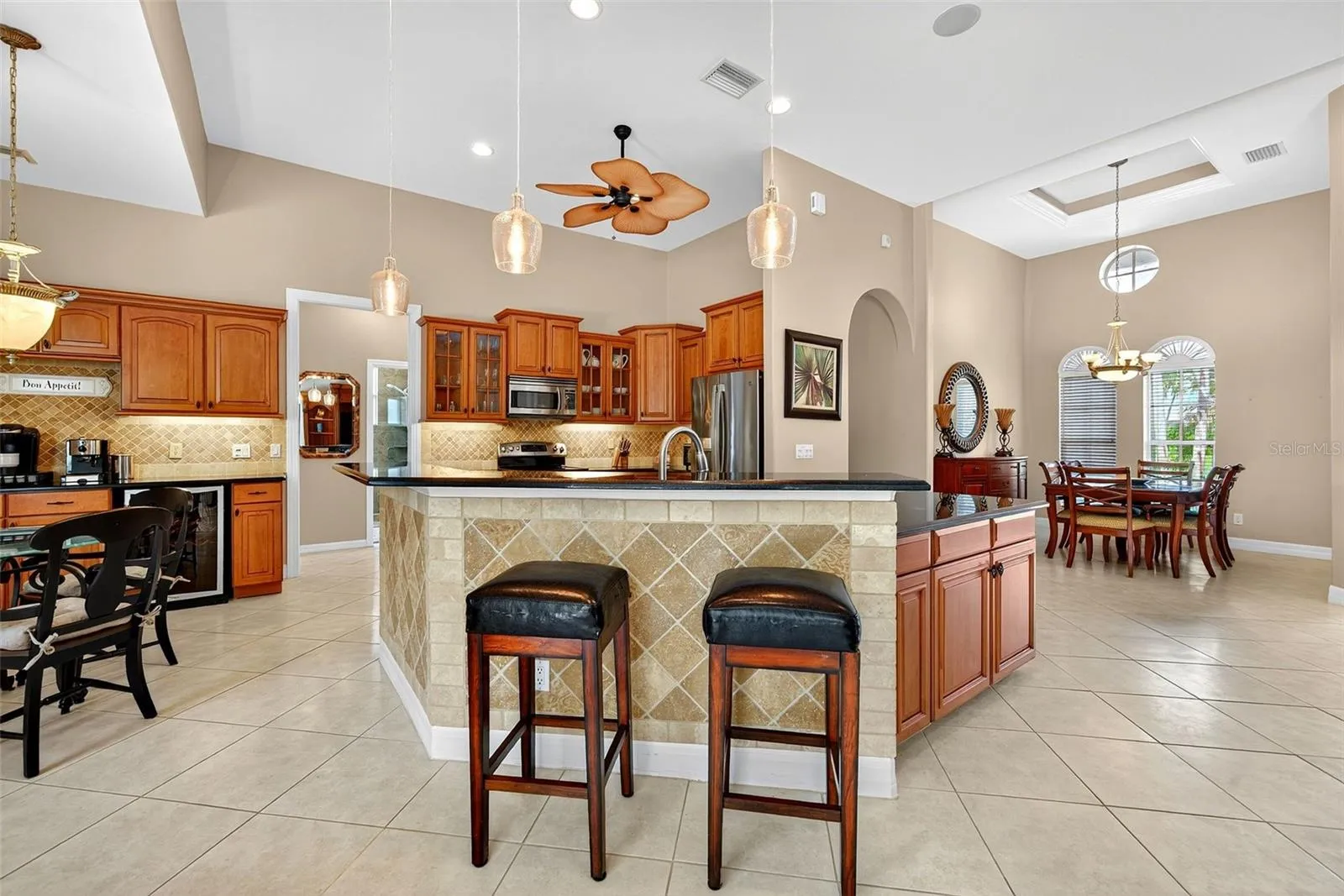 The GOURMET KITCHEN will impress any chef with WOOD CABINETRY, GRANITE COUNTERTOPS, STAINLESS STEEL APPLIANCES, a WINE COOLER, and ample storage space. CERAMIC TILE FLOORING flows throughout the home, enhancing its timeless appeal.