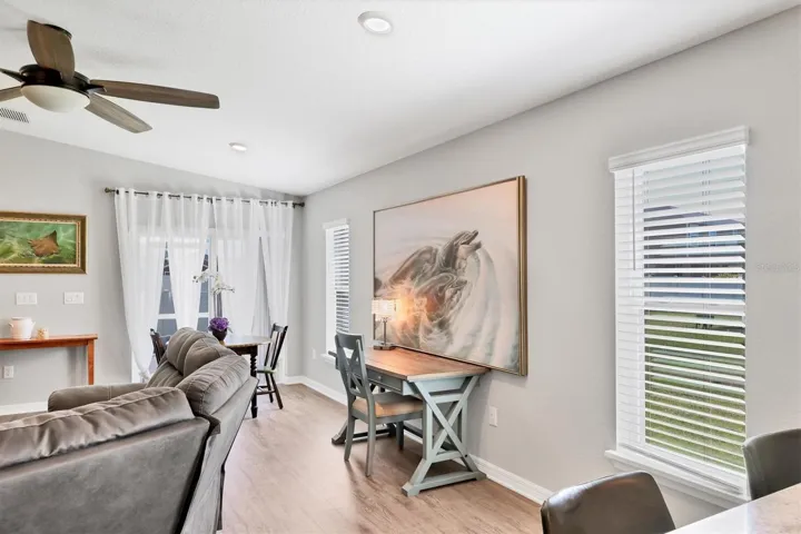 Inside, you’ll find neutral colors and large windows that fill the home with natural light, creating an inviting atmosphere throughout. The open-concept layout flows easily from the bright living area to the stylish kitchen, which features stainless steel appliances and plenty of counter space—perfect for everyday living or entertaining. The vinyl plank flooring adds warmth and durability, complementing the home’s modern appeal.