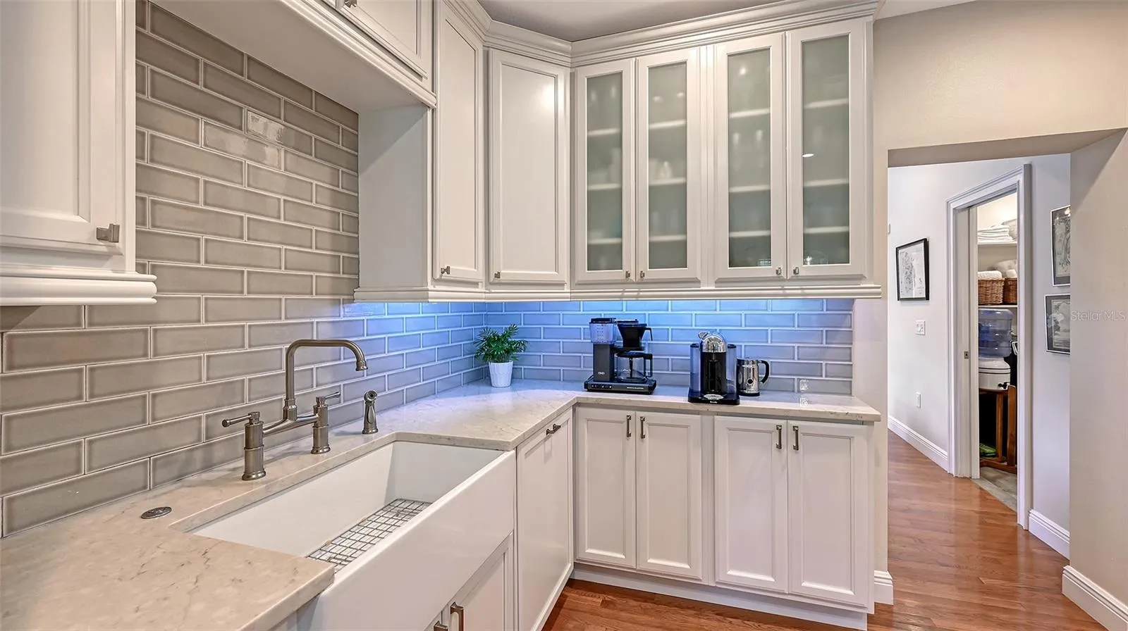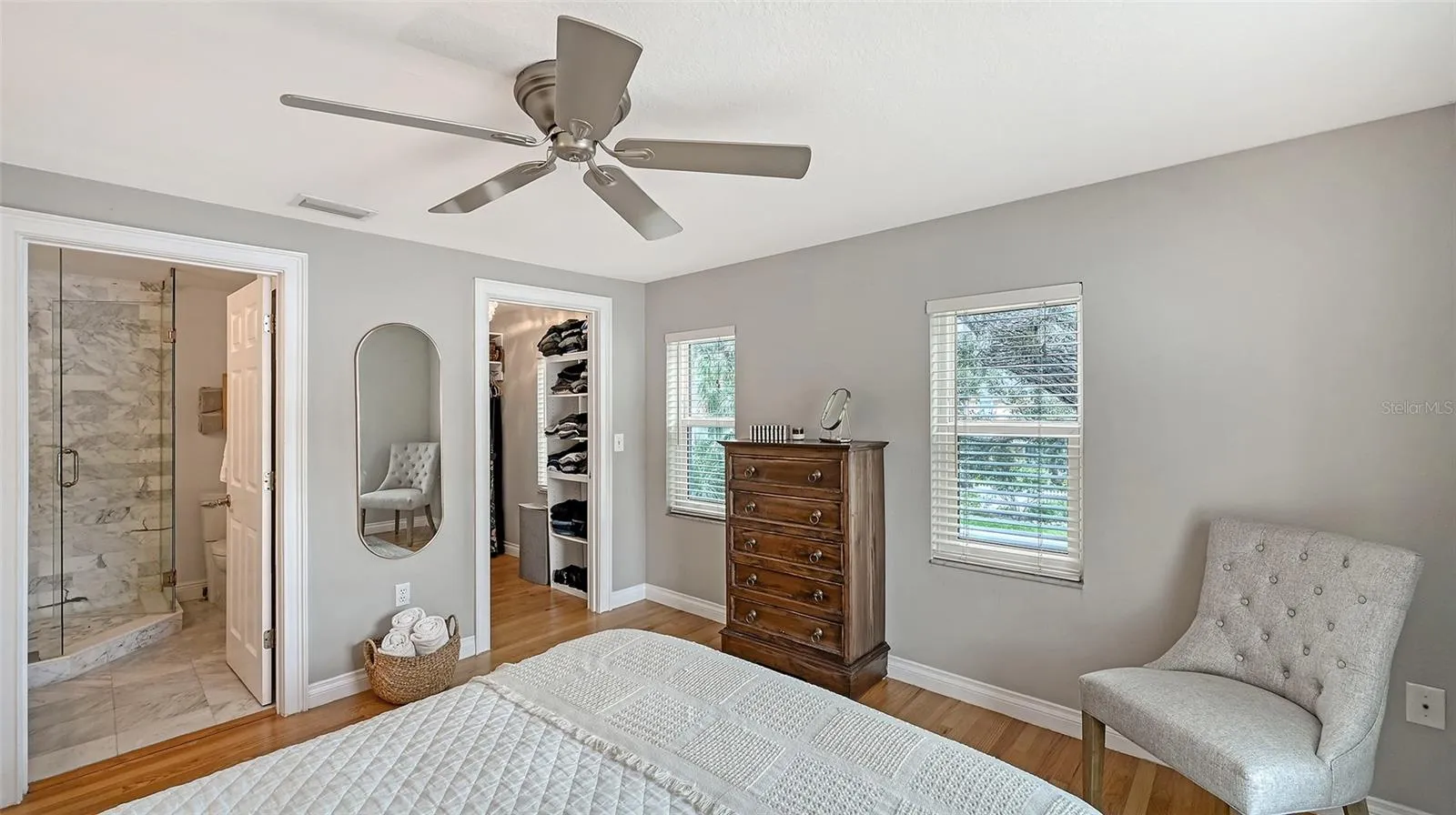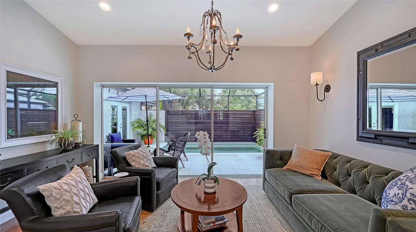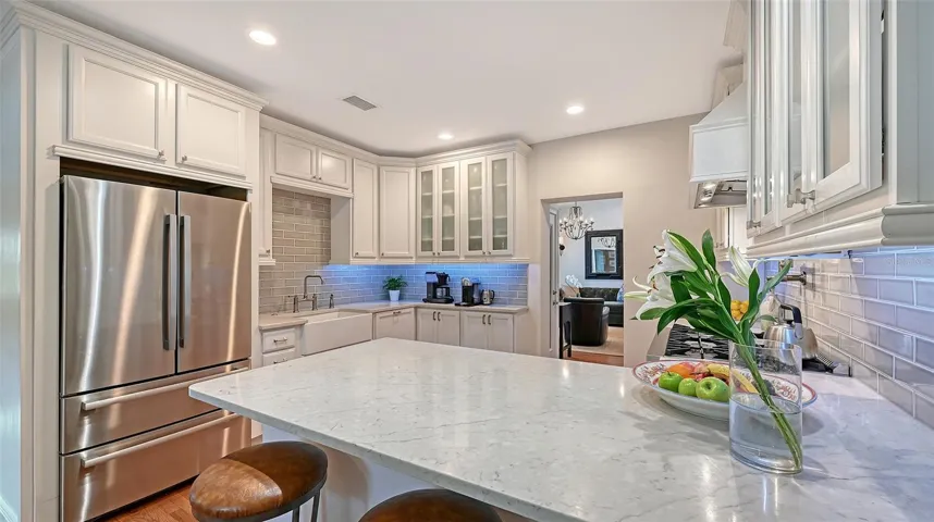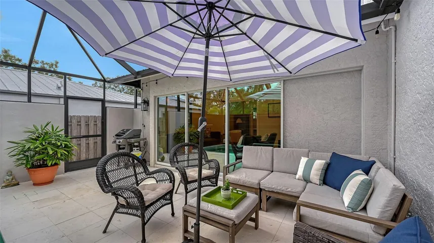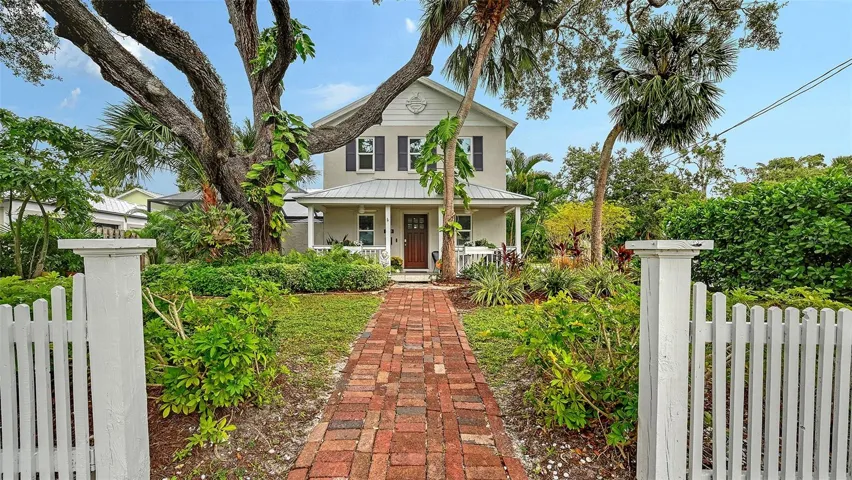 Perfectly situated in Sarasota’s vibrant Downtown within the coveted Gillespie Park neighborhood, this exquisitely renovated two-story Key West–inspired residence blends timeless architectural charm with modern sophistication. A magnificent oak tree graces the front yard, framing the home’s welcoming façade, while a historic brick driveway—crafted from original Sarasota street bricks—sets the stage for the artistry and attention to detail found throughout. Inside, solid wood floors, designer lighting, and refined finishes create a warm yet elegant ambiance. The gourmet kitchen impresses with custom cabinetry with soft-close drawers, quartz countertops, and top-tier appliances including a professional Forno gas range, seamlessly marrying function and style. Open-concept living and dining spaces are enhanced by an electric fireplace and abundant natural light streaming through windows and doors, many of which are impact-rated. Upstairs, rich hardwood flooring continues through the private quarters, including the serene primary suite featuring a custom-built walk-in closet and a spa-inspired bath adorned with porcelain tile, designer fixtures, and a soothing neutral palette. The flexible floor plan offers versatility for today’s lifestyles: a downstairs bonus area—currently used as a Pilates studio with private entry—is zoned for business or rental use and could easily serve as a family room, media room, primary/guest bedroom or fitness space. A beautifully appointed 600-square-foot apartment offers full independent living, complete with a contemporary kitchen, induction cooktop, full-size washer and dryer, and a spacious private balcony—ideal for guests, extended family, or short-term rental income (one-week minimum rental permitted). Additional highlights include a temperature-controlled wine room, an oversized laundry area with attic storage, three zoned HVAC, and a security system. Outside, a lush courtyard with screened lanai and heated pool creates a tranquil retreat for relaxing or entertaining amid tropical landscaping. Set on a spacious, fenced corner lot, the property offers abundant privacy along with an expanded 2½-car garage featuring an impact-rated door and generous storage. Residents of Gillespie Park enjoy one of downtown Sarasota’s most walkable locations—just moments from fine dining, boutique shopping, arts and cultural venues, SRQ International airport, and the scenic Bayfront. The neighborhood’s namesake park offers tennis and pickleball courts, dog areas, and a lively community spirit that captures the essence of urban Sarasota living. Blending the character of Sarasota’s historic past with the ease of modern luxury, this exceptional residence delivers rare flexibility, craftsmanship, and an enviable location in the heart of it all.
