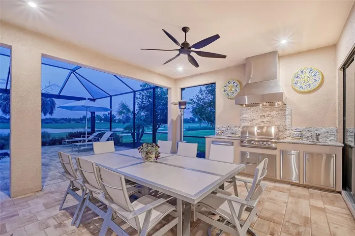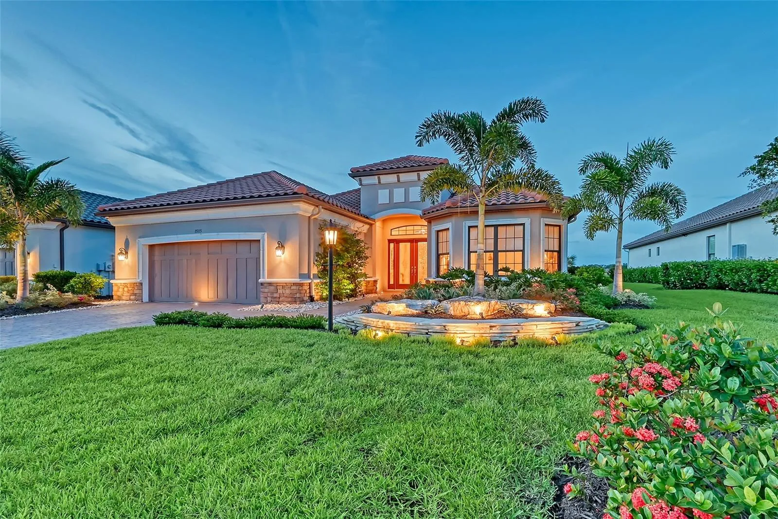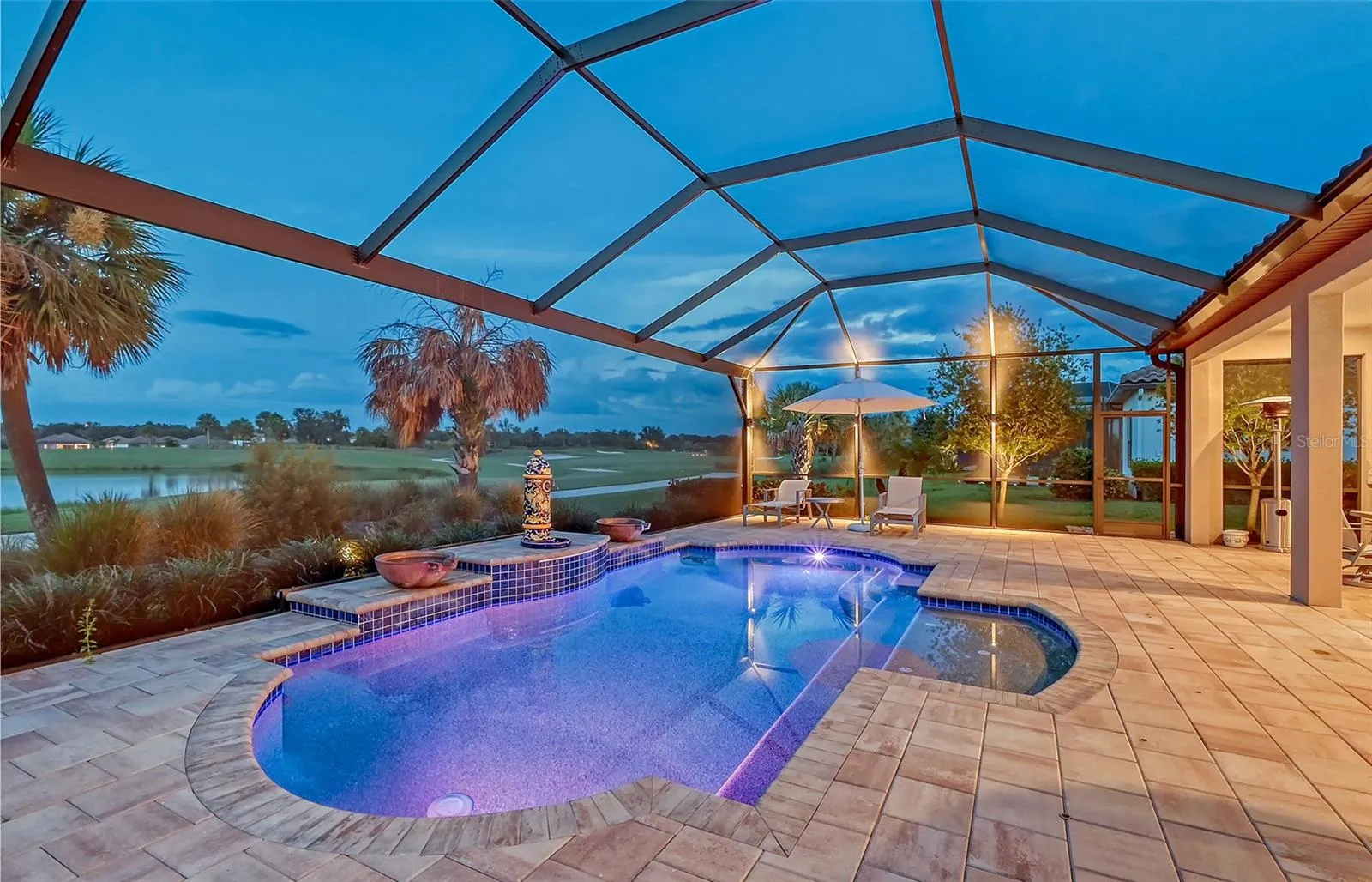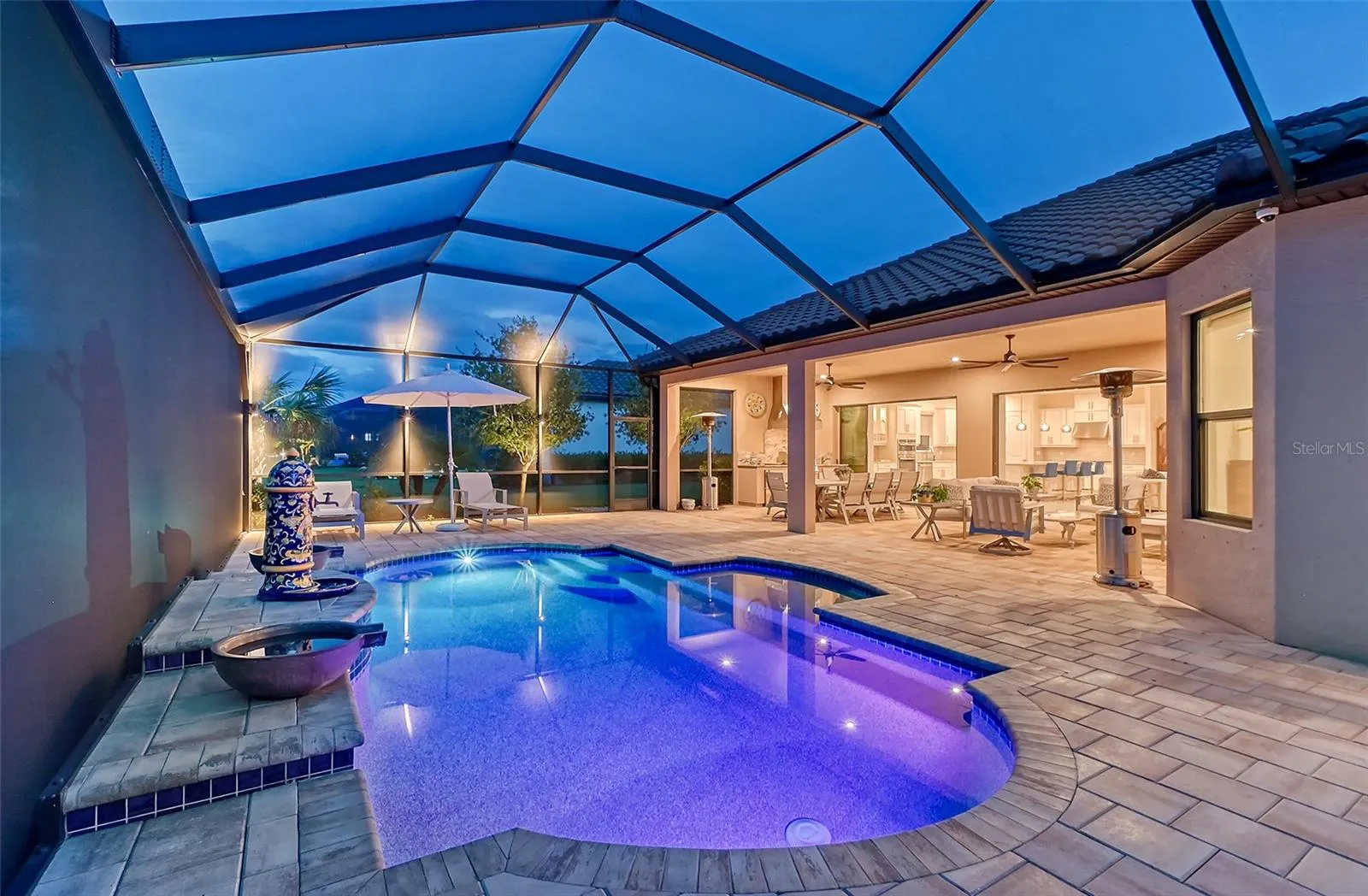 Upon entering this Pallazio open floor plan through exquisite glass double front doors, you are immediately greeted by breathtaking golf and lake views. This residence is a lavish display of award-winning design, featuring custom finishes and masterful craftsmanship throughout. The seamless indoor-outdoor Florida lifestyle is embraced through double pocket slider doors that lead to an extended covered lanai, an enchanting heated pool with Lutron color-changing lights and waterfall pots, a clear view cage with stunning golf and water views, and an outdoor kitchen complete with grill and range hood, sink, storage cabinets and stone countertops. Inside, the spacious family room overlooks an open kitchen and dining area adorned with custom lighting. The kitchen is a chef’s dream, boasting exquisite wood cabinetry with pullout shelves, an extended island with quartz countertops and additional front cabinets, top-of-the-line appliances, an extended bar with glass cabinetry, a walk-in pantry, gas cooktop, under-cabinet lighting, designer glass backsplash and a water filtration system under the sink. The primary suite is an oasis of comfort, featuring an extended sitting area with bay windows, tile floors, motorized shades, stunning golf and lake views, and a luxurious bath with an oversized glass walk-in shower, double vanities with quartz countertops, and a spacious closet with custom built-ins. The guest rooms are generously sized, each with en-suite baths and framed glass mirrors. A den/office with glass French doors, motorized shades, and built-in shelving completes the interior, leaving no detail overlooked. Additional highlights include impact windows in the front and hurricane shutters, custom lighting in every room, a built-in Closet Tec system in all closets, storage racks in the extended three-car tandem garage, gutters around the entire house and landscape lighting throughout. This golf membership home offers access to world-class amenities, including a resort-style pool with a Bahama bar, an onsite restaurant, wellness and fitness centers, sports courts for tennis and pickleball, and an incredible golf course with a practice range. This is luxury living at its finest.