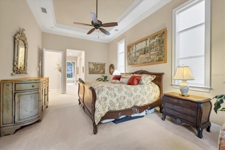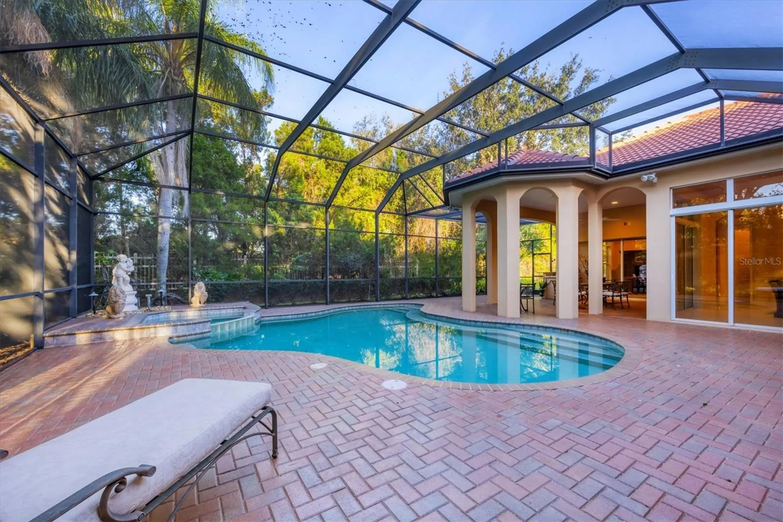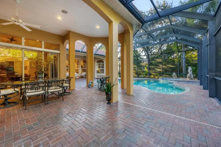 Glass double doors introduce this custom-built Arthur Rutenberg St. Augustine VI residence includes a new roof with a transferable warrantee installed in April 2025, a four-bedroom, 3.5-bath plus office retreat set on a private, beautifully landscaped lot on a cul-de-sac in the prestigious Lakewood Ranch Country Club. The foyer’s custom mosaic marble tile sets an elegant tone, leading to the formal dining room framed by a pillared entrance, tray ceiling and crown molding. The extended living room captivates with its 14-foot double tray ceiling, arched windows, detailed built-ins and an elegant gas fireplace. A pass-through with custom glass cabinetry and a wet bar connects to the main living areas, offering effortless flow for entertaining. The chef’s kitchen is a showpiece, featuring upgraded appliances including a built-in refrigerator, five-burner gas cooktop with hood and double ovens. Verde Uba Tuba granite countertops, custom cherry cabinetry with glass uppers, a large center island, and an additional prep island make this space functional and beautiful. The breakfast nook and adjoining great room feature custom built-ins, layered tray ceilings, and a full wall of sliding doors that open to the lanai, blending indoor and outdoor living seamlessly. Go outside to the extended lanai with extended dome-shaped enclosures, designed for relaxation and entertaining. Enjoy the heated pool and spa, a full summer kitchen with grill and beverage center, and granite counter seating, all surrounded by lush landscaping. The home’s ideal sun exposure provides the ideal mix of shade and light, offering breathtaking sunsets and year-round enjoyment. The primary suite is a private sanctuary featuring tray ceilings, crown molding, designer window treatments, plush upgraded carpet and dual custom walk-in closets. The spa-inspired marble-floored bath offers dual marble vanities, a walk-in shower with anti-slip floor, and a luxurious whirlpool soaking tub. Two beautifully appointed guest suites share a spacious full bath, providing comfort and privacy for family or visitors. The expansive bonus room offers flexible use as a fourth bedroom, media room or fitness space, with sliding doors that open directly to the lanai, creating a smart connection to the home’s outdoor oasis. A large private office features engineered hardwood floors with a custom inlay, French doors and large windows that fill the space with natural light. A convenient half bath is nearby. Additional highlights include a new whole-house water filtration system, tankless water heater, upgraded electrical panel servicing the pool, outdoor lighting and sprinkler system, along with an oversized side-load garage featuring upgraded storm doors and ample space for vehicles, golf carts and storage. In the gates of the renowned Lakewood Ranch Country Club, residents enjoy a lifestyle defined by luxury and leisure. The community offers championship golf courses, a state-of-the-art fitness center, tennis and pickleball courts, and an elegant clubhouse with fine dining and year-round social events. Manicured landscapes, scenic walking trails and proximity to Lakewood Ranch Main Street, Waterside Place and the area’s top beaches make this an extraordinary place to call home.