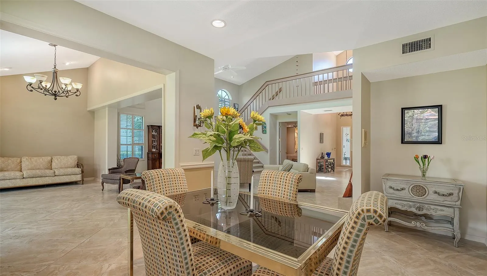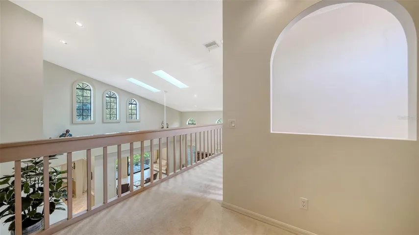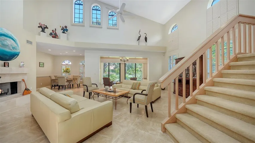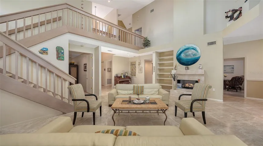 Welcome to this lovely 2-story, 3 bedroom, 3 bath maintenance-free home in Villa D’Este, nestled within the gated community of Prestancia in Palmer Ranch. This villa boasts a BRAND-NEW ROOF, SKYLIGHTS, DOWNSPOUTS, AND GUTTERS INSTALLED IN 2025. Step into the spacious great room, featuring soaring 25’ ceilings, skylights, large windows, a cozy wood-burning fireplace, and a built-in bookcase. The living area seamlessly transitions to the patio surrounded by lush tropical landscaping, perfect for entertaining or just relaxing on a beautiful Florida afternoon. The gourmet kitchen is a chef’s dream, equipped with stainless steel appliances, granite countertops, solid wood cabinetry, two pantries, a built-in desk, and a large breakfast nook with ample space for a table and sitting area. The master suite, on the main floor, is a luxurious retreat, offering two walk-in closets with custom built-ins and a spa-style bathroom complete with dual sinks, a soaking tub, a separate shower, a makeup vanity, a water closet, and a linen closet. The first floor also includes a formal dining room, a guest bedroom (currently used as an office), a full bath, and a laundry room with a sink and closet. Upstairs, a loft leads to a third bedroom with a walk-in closet, a linen closet, and a private bath, deal for guests or multigenerational living. Additional highlights include a two-car garage with built-in storage, hurricane-rated sliders, and proximity to the community heated pool and spa. Prestancia sits in the heart of Palmer Ranch, conveniently located just minutes from Siesta Key & Nokomis Beaches, the Legacy Trail, and a wide variety of shopping options and dining venues. The close proximity to Interstate 75 allows easy access to Downtown Sarasota and all that this vibrant city has to offer. Golf or social membership is optional.