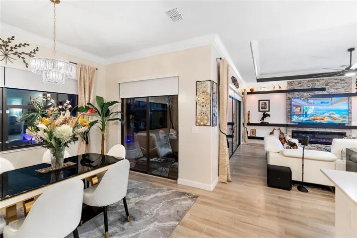 The primary suite is a true retreat, featuring a tray ceiling, a modern electric fireplace, and sliding glass doors that open directly onto the screened lanai—creating a perfect blend of indoor and outdoor comfort. The luxurious ensuite bathroom showcases dual sinks, an enormous walk-in shower, and an abundance of natural light, completing this spa-like sanctuary.