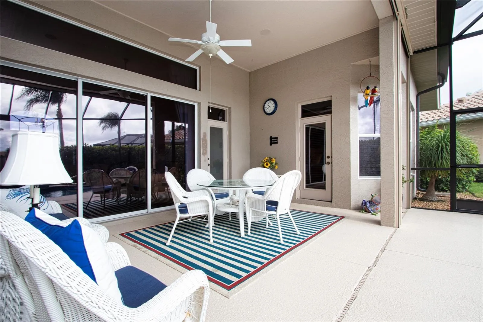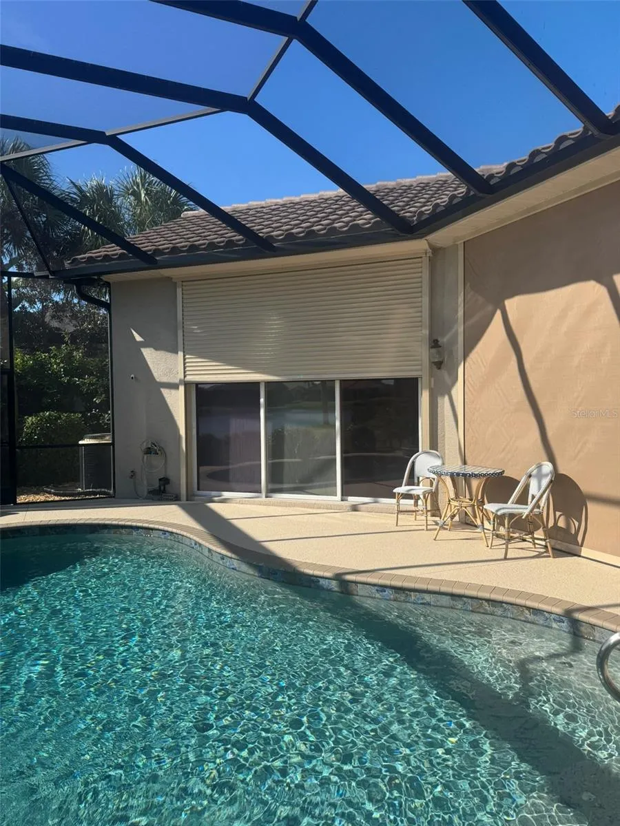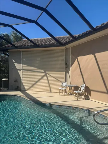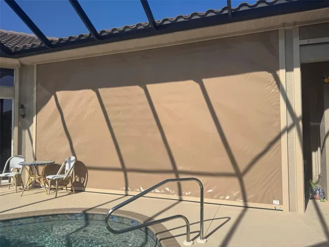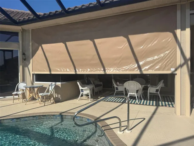 Additional highlights include a self-cleaning pool system, fireplace with adjustable heat and colors, attic pull-down stairs, alarm system available, irrigation well, storm-enhanced garage door, and an extended oversized garage with a workbench and ample storage. For added peace of mind, the home includes motorized storm shutters (2025) on the sliding glass doors and a transferable roof warranty. One AC unit replaced in 2021 and the second unit a new compressor in 2025 and both maintained semi annually.