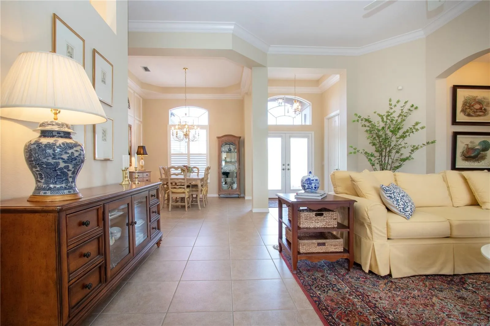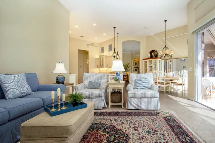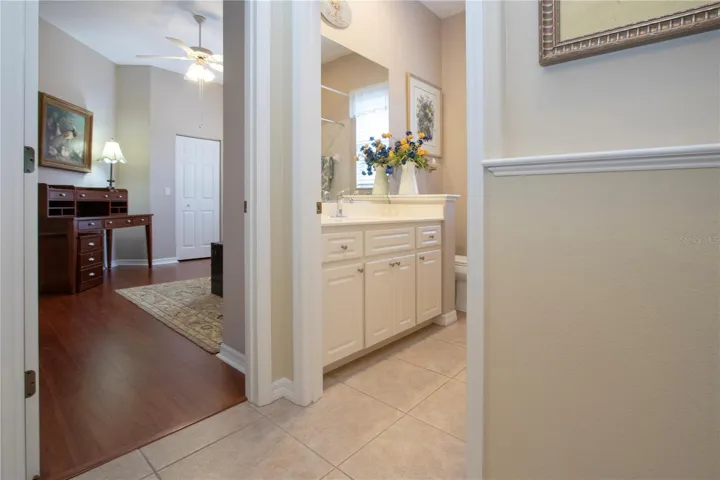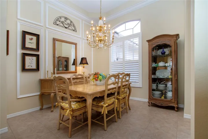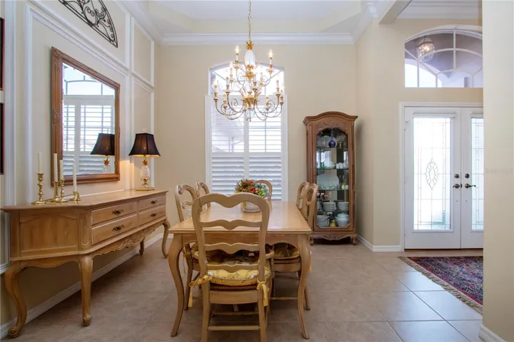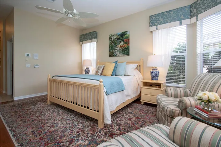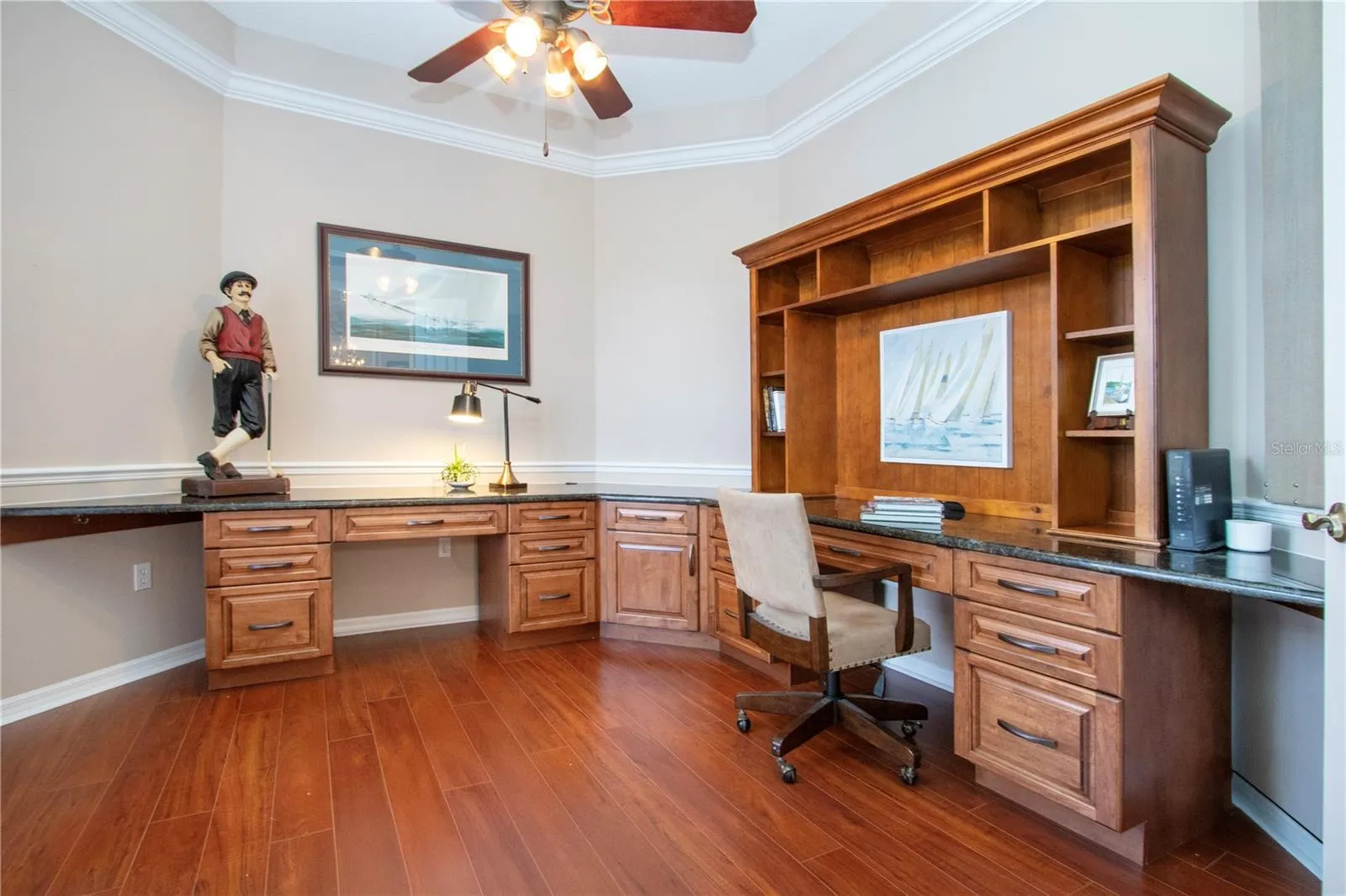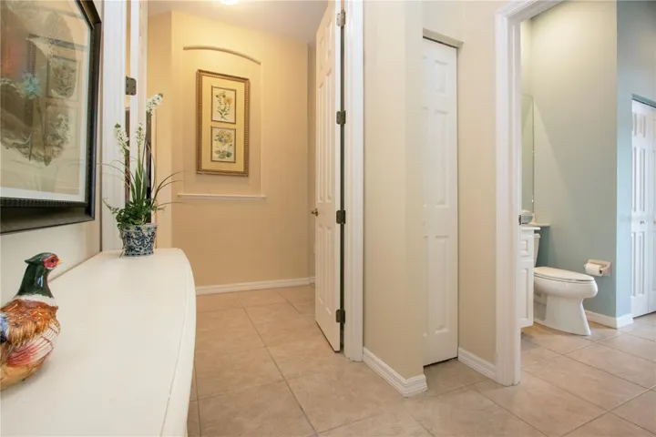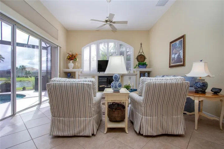 The dining and living areas provide a graceful flow for both entertaining and daily living, with the living room overlooking the sparkling pool and tranquil pond beyond. The high ceilings enhance the spacious, airy feel throughout. Relax in the inviting family room with an electric fireplace, or work comfortably in the office/den featuring a custom built-in desk for two. The split-bedroom floor plan provides guests with a peaceful retreat, while the primary suite includes an en suite bath, two walk-in closets, and generous space for relaxation. The third bedroom also features a walk-in closet, and recently installed plantation shutters add timeless style throughout.