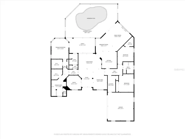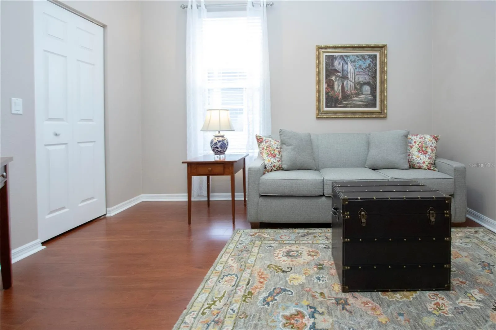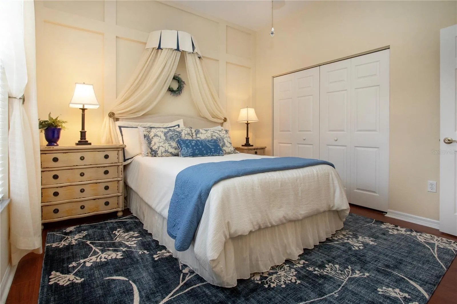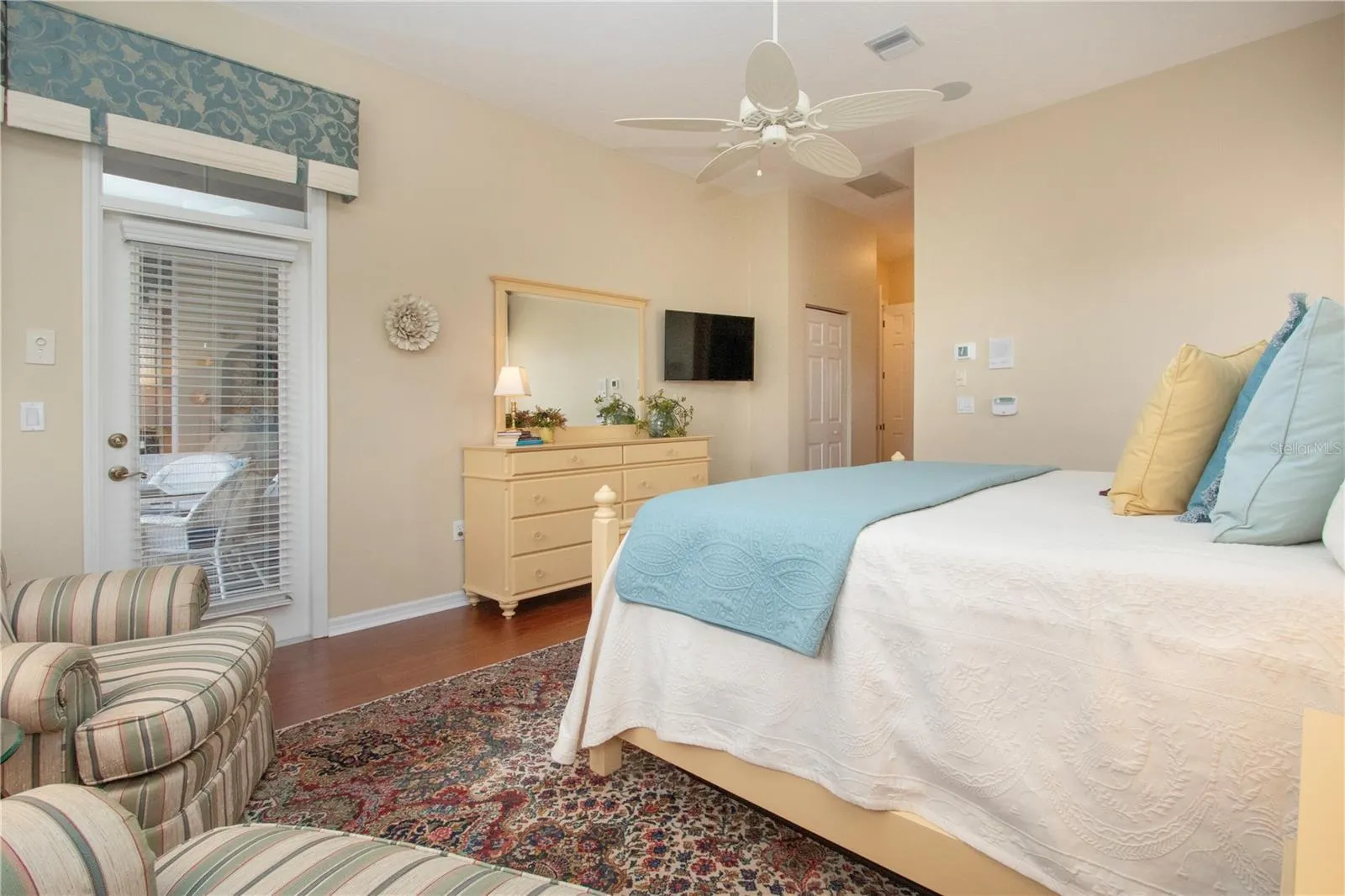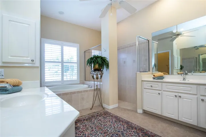 The dining and living areas provide a graceful flow for both entertaining and daily living, with the living room overlooking the sparkling pool and tranquil pond beyond. The high ceilings enhance the spacious, airy feel throughout. Relax in the inviting family room with an electric fireplace, or work comfortably in the office/den featuring a custom built-in desk for two. The split-bedroom floor plan provides guests with a peaceful retreat, while the primary suite includes an en suite bath, two walk-in closets, and generous space for relaxation. The third bedroom also features a walk-in closet, and recently installed plantation shutters add timeless style throughout.