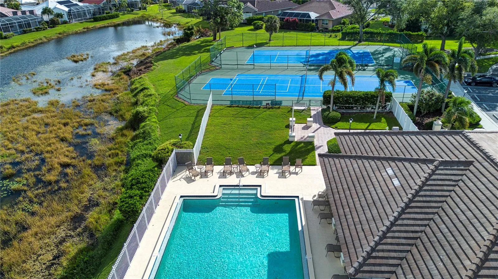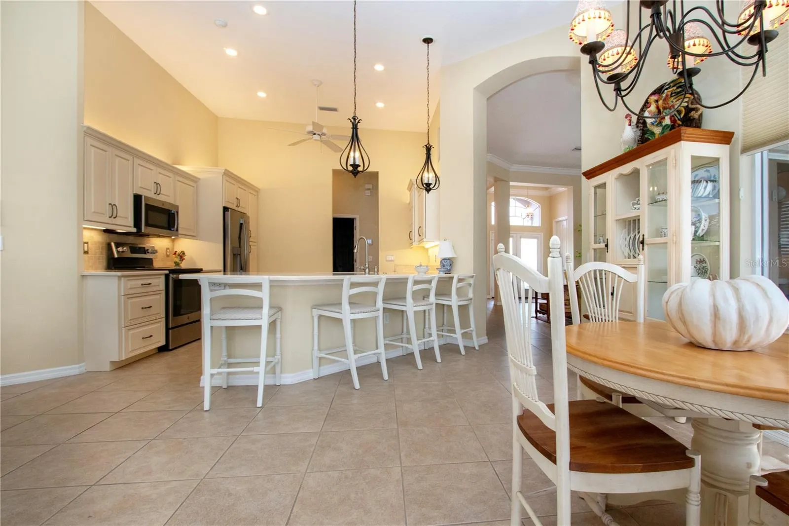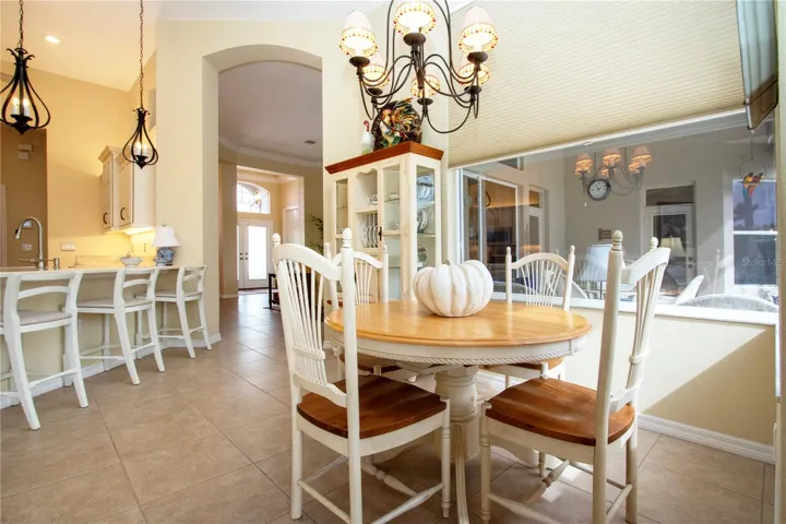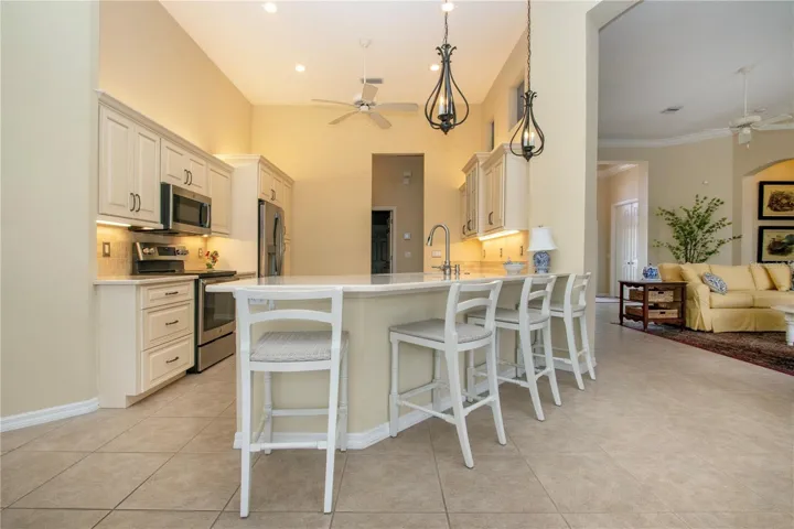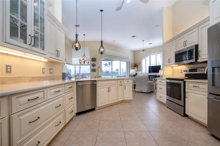 The well appointed kitchen boasts quartz countertops, solid wood cabinetry, pull-out pantry drawers, lighting above and below the cabinets, and stylish pendant lighting. The aquarium window and sliding glass doors showcase your solar-heated pool, where you can swim year-round while enjoying serene pond views and visits from sandhill cranes and blue herons in this natural bird sanctuary. The architectural-style pool cage (2020) with clear-view screening (2024) offers unobstructed views, and the convenient pool half bath adds functionality.