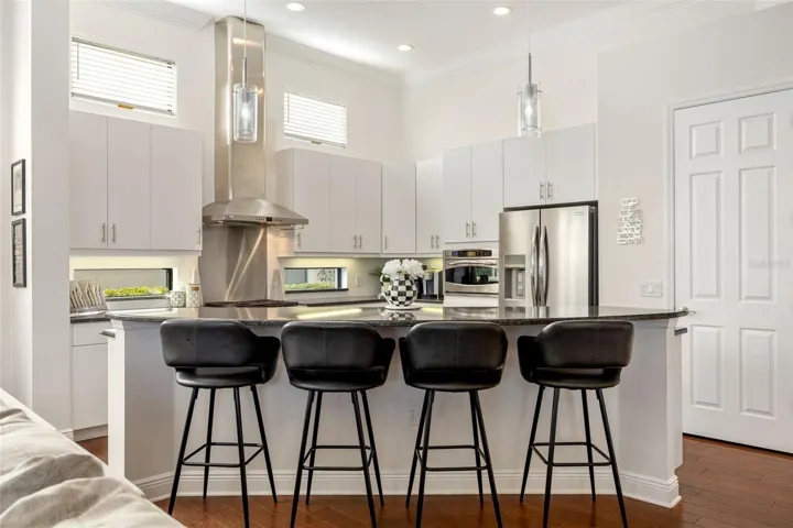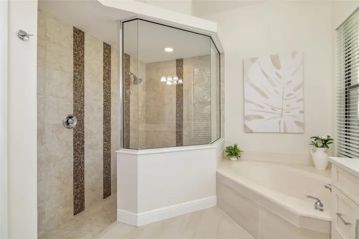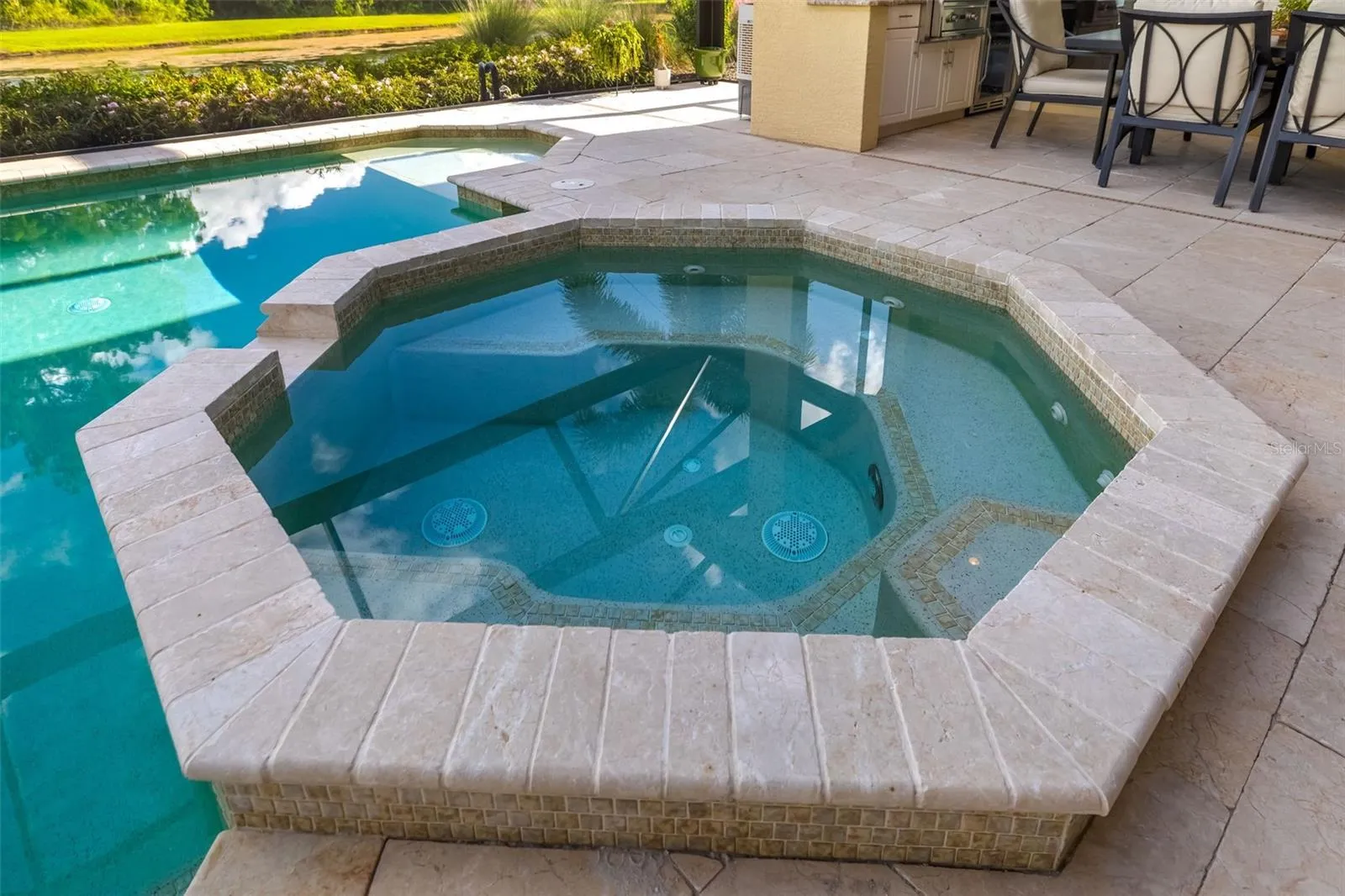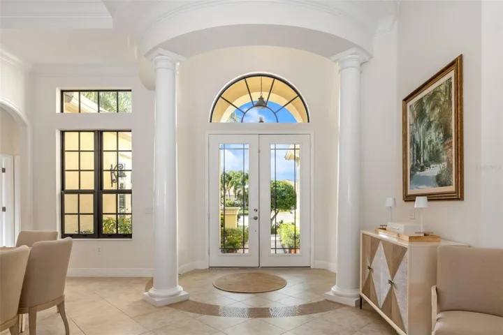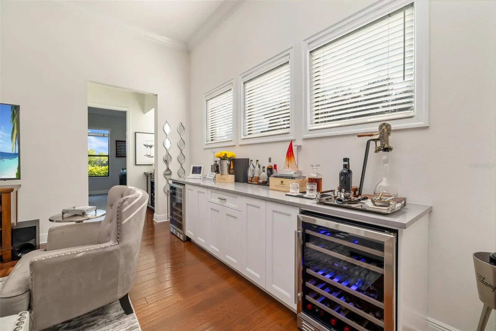 Welcome to your private oasis in the sought-after Lakewood Ranch Golf & Country Club, on Kings Dunes Hole #11. This elegant three-bedroom, three-bath home with a dedicated office offers panoramic 180-degree water and golf course views from the beautifully updated lanai. Go outside to enjoy resort-style living with a heated saltwater pool and spa, new panoramic screen enclosure (2021) and travertine tile flooring throughout the lanai. Entertain effortlessly with the outdoor kitchen, two spacious covered lounging areas and an outdoor shower, all oriented to take advantage of the gorgeous southern exposure. Inside, modern comfort meets timeless style. Soaring 12-foot ceilings in the living room, dining room and family room create a bright, open and elegant atmosphere. The kitchen features white cabinetry, stainless steel appliances and engineered hardwood flooring, complemented by a custom bar area with quartz countertops and two beverage refrigerators, ideal for hosting. The primary suite is a serene retreat, offering updated tile flooring, two custom walk-in closets, and a spa-like bath with a walk-in shower and double vanity. Additional upgrades include two new HVAC units (2023), ensuring year-round comfort. Whether enjoying quiet mornings overlooking the golf course or entertaining family and friends poolside at sunset, this home offers the best of luxury Florida living. This maintenance-free home, on a quiet cul-de-sac, also features a garage with new epoxy flooring and storage cabinets. Membership to the Lakewood Ranch Golf and Country Club is optional, offering flexibility to suit your lifestyle.