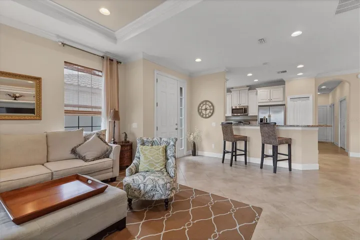 Esplanade Golf & C.C. at Lakewood Ranch, This 2BR/2BA + Den & 2 Car Garage, Highly Sought-after Roma Model features an AMAZING Private South East rear facing Lake View homesite with preserve across the water, with wonderful lake views from Primary BR, and two sides of the home viewable from Kitchen, Dining, Living, and of course from the Lanai and extended screen enclosed patio! Very Rare to get this kind of water view, this is truly a special lot, and located at the End of a Cul-de-sac, it provides added solitude with no through traffic. The view and privacy of this particular lot is unmatched and priceless. The home has great space with high ceilings, an open floor plan with Living, Dining, and Kitchen all open to each other, featuring Crown molding, tray ceilings with crown, and lovely light coming in from the east-facing sliders and south-facing windows. The Kitchen features Granite Counter and breakfast bar, Closet Pantry, 42″ wood cabinets, Stainless Steel Appliances including refrigerator, dishwasher, microwave hood, and Gas Stove, the home is plumbed and stubbed out for GAS in other locations too (water heater runs on gas), Washer and Electric Dryer (stubbed out for gas if desired). Esplanade Golf & C.C. is all about the active lifestyle featuring an award winning golf course (pay to play), pro-shop golf and tennis pro staff, Har-Tru tennis courts, Workout facility, Pool with Lap lanes and Lagoon Style Resort Pool with adjoining Bahama Breeze Tiki Bar/Restaurant, plus the Barrel House Bistro and Tap Room, Wine lockers, Teaching Kitchen, an abundance of covered outdoor dining areas and an outdoor fireplace, bar and TVs to watch the game and socialize. Impeccably maintained and luxurious surroundings make this a truly special place to live part-time or year-round. This is NOT a 55+ community but is maintenance-free (all landscape included in the fee), offering you time to enjoy an active and fulfilling lifestyle. Live and play your best life now!