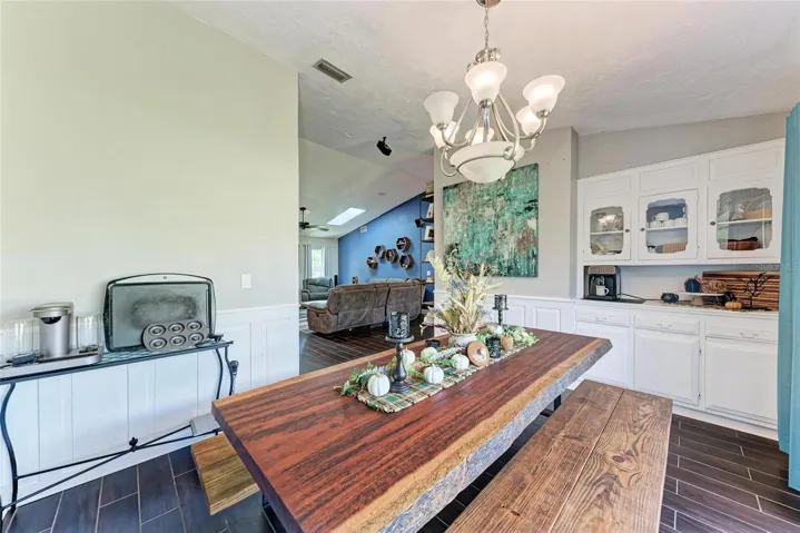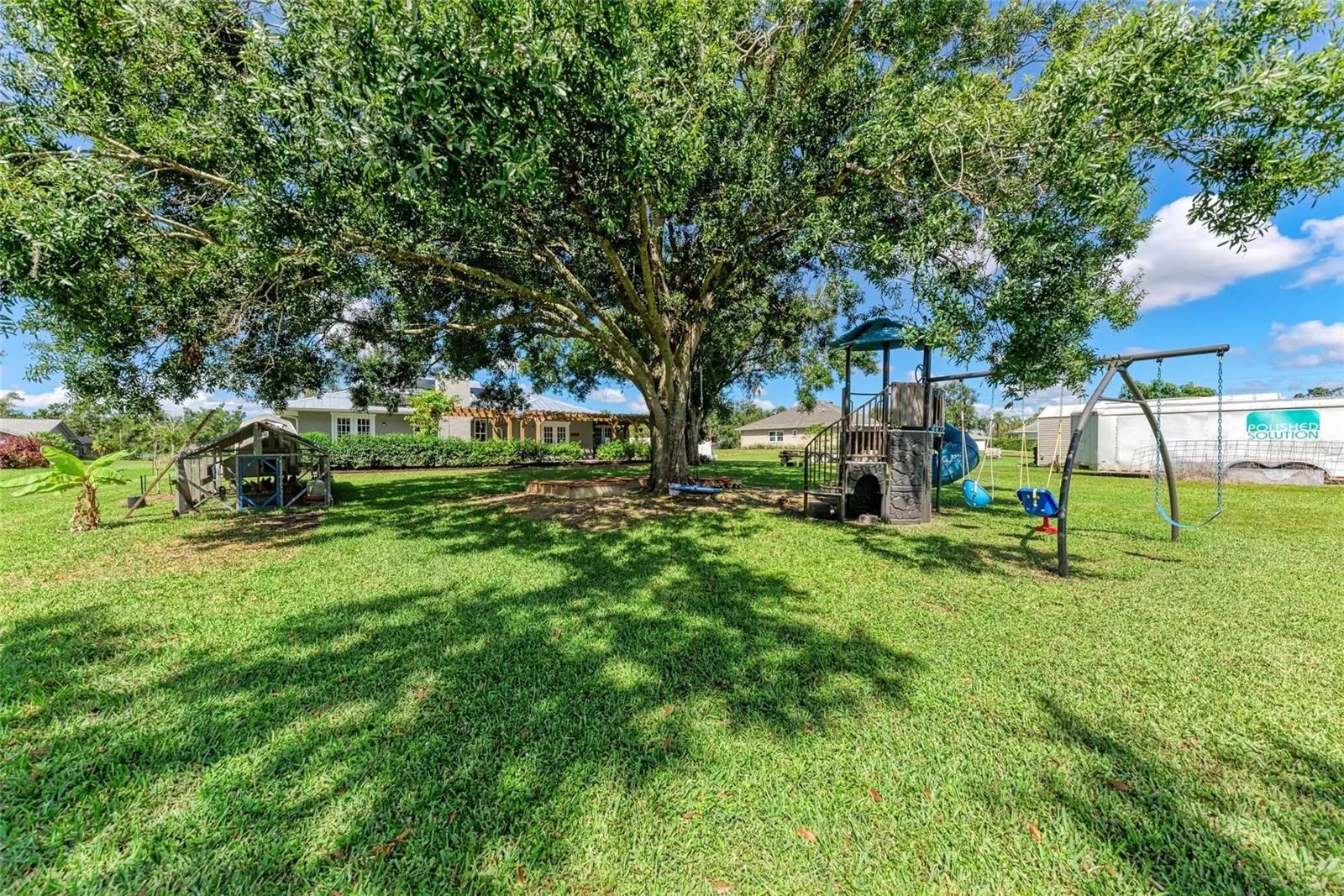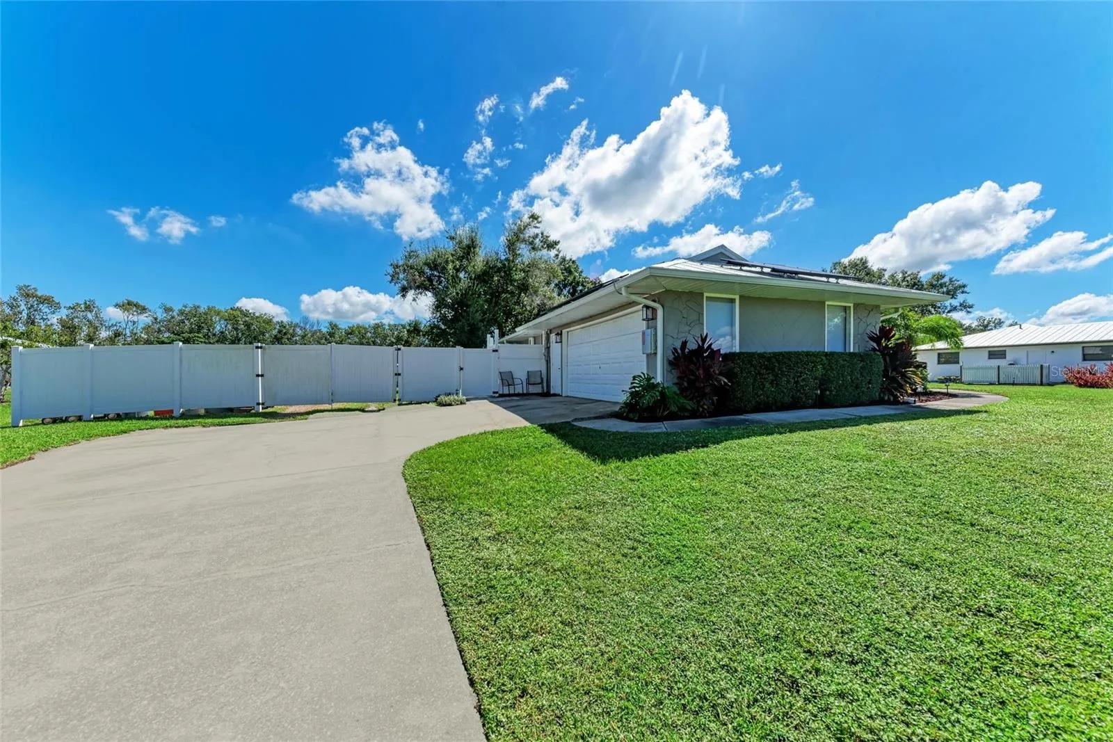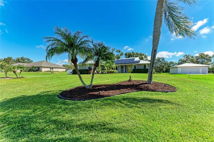 Welcome to beautiful Racimo Ranches located right beside Tatum Ridge Golf Course! This beautiful 3 bedroom, 2 bathroom and 2 car garage home is on over an 1+ ACRE OF LAND and non deed restricted. Entry leads to foyer with coat closet and opens to all living areas. Large light and bright living room with sky lights and wood burning fireplace. Dining Room with bay window and china cabinet/hutch with custom trim. Kitchen has mostly stainless steel appliances, tiled backsplash, quartz stone counters, cabinet pantry and breakfast bar. Office/Playroom has french doors to exterior and option to turn into another bedroom. Primary Bedroom has french doors to exterior and large built-in closet with access to primary bathroom. Primary bathroom has quartz countertops, dual sinks, linen cabinet, whirlpool tub and walk-in shower with rain shower head. Bedroom 2 has french doors to exterior coy pond area and built-in closet. Bedroom 3 has built in closet. Guest Bathroom has quartz countertops, dual sinks and tub/shower combo with seat/plant shelf. Ceramic tile throughout with carpet in Bedrooms 2 and 3, laminate in pimary bedroom and concrete in office/playroom. 2 car garage with laundry area and side door. Huge brick paver and artificial turf CUSTOM PERGOLA lanai with planters. Seating area with ceiling fan, OUTSIDE SHOWER with rain shower head, dining area, custom dual swings and coy pond. Professionally landscaped with lighting and irrigation system in flower beds and garden. Playground and custom sandbox. Shed with electric and separate gardening storage area. POND. GARDEN with irrigation and water spigot for watering plants and vegetables. Solar panels transferable or returnable. Roof 2022. A/C 2016. Approximately 8 minutes to I-75, Sams Club, Target, Lowe’s, the best Publix in Sarasota Fruitville Farms, Chick-fil-A, Nathan Benderson Park with National Rowing Competitions, UTC Mall with extensive shopping and dining and the Brand New Mote Marine Aquarium, Tiger Woods PopStroke Miniature Golf and more! World Renown dining abounds. 25 minutes to the best beach in the nation Siesta Key Beach. Make this charming home your oasis in Paradise!