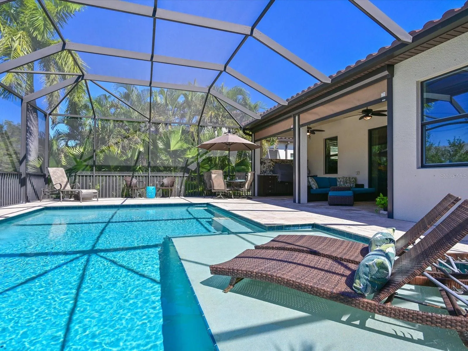 Save the best for last: Walk out to your private custom designed lanai and pool area. The covered lanai with travertine tile flooring boasts a large seating space to relax and unwind with friends and family. A custom outdoor kitchen has marine grade polymer cabinetry with drawers and pull-out shelves to store everything you need to create an outdoor meal. A Hestan commercial grade stainless steel grill with built-in rotisserie and infra-red burner can cook just about anything you desire including pizzas. The kitchen also includes 2 gas side burners, an outdoor beverage refrigerator and granite countertop and backsplash.