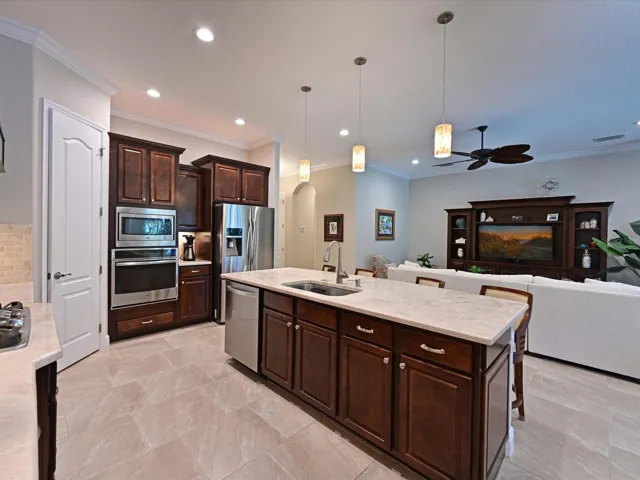 FOUR BEDROOM AND 2 1/2 BATH HOME IN LEGENDS BAY!. Original owner has meticulously maintained this home. Come see the many decorator touches and upgrades. Enter into the spacious foyer with custom light fixtures, tray ceiling with crown molding and designer wall finishes. 18″ ceramic tile flooring guides you into the spacious gathering area consisting of the great room, living room and kitchen. The gourmet kitchen has everything an aspiring chef could need. Stainless steel appliances include a three-door refrigerator/freezer with dual ice output, built-in microwave and oven, 5 burner gas stove and new LG dishwasher. Wood cabinetry offers plenty of storage with easy to use pull out drawers and soft close features. The large corner pantry has solid wood slat shelving. Diana Reale marble countertops and travertine backsplash adorn this area. The kitchen island offers casual seating for up to four. The dining area is optimal for more formal meals; two large windows offer light and views to the outdoor area. The spacious great room is perfect for larger gatherings or just relaxing watching TV.