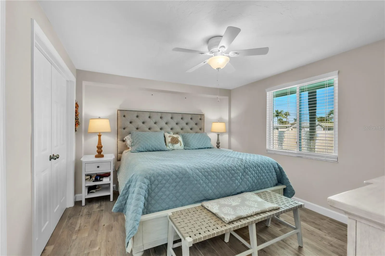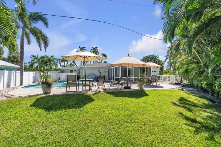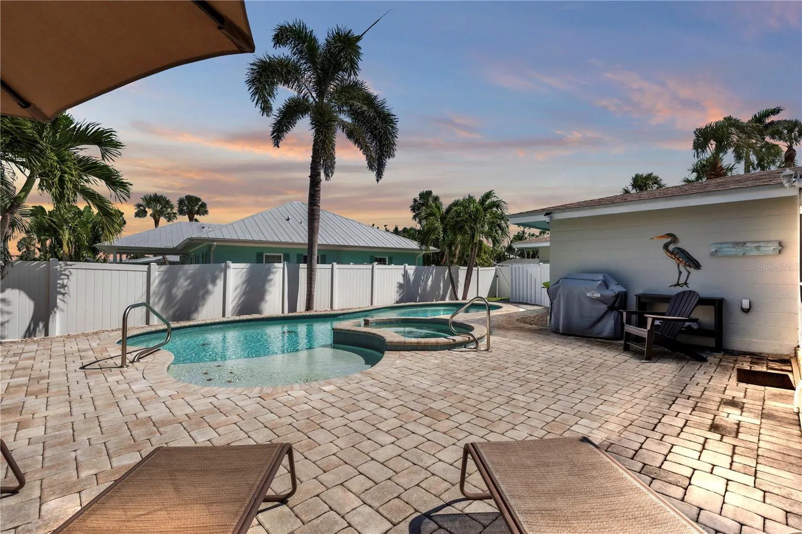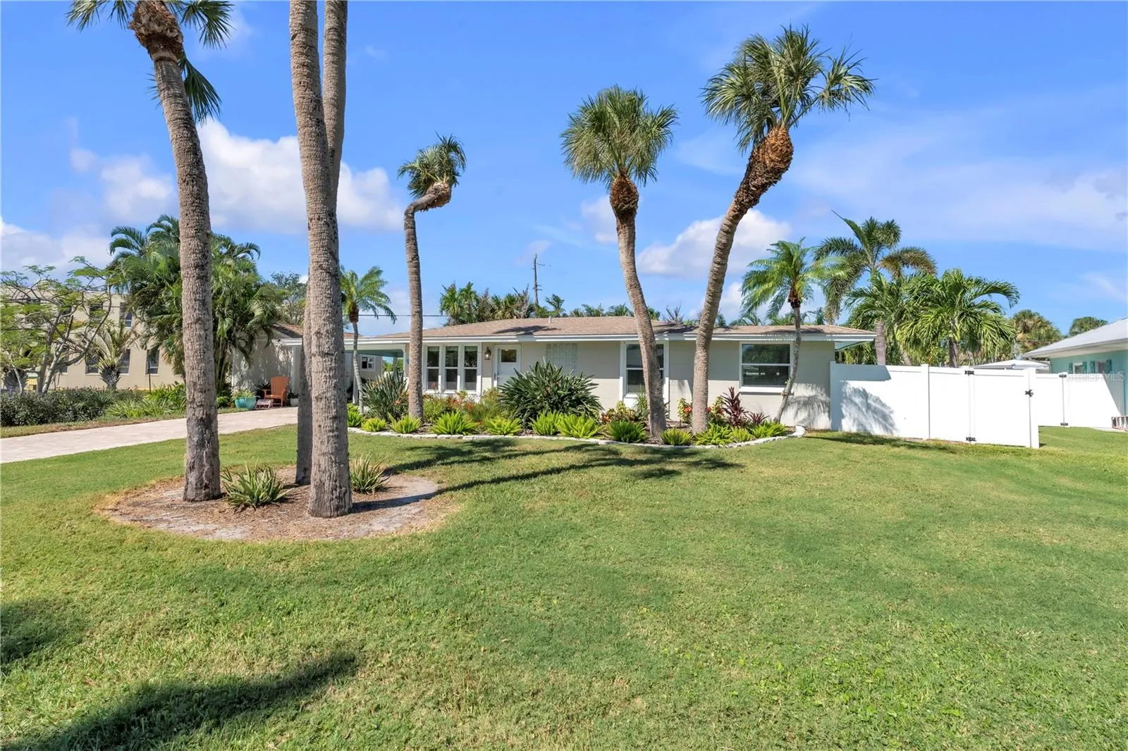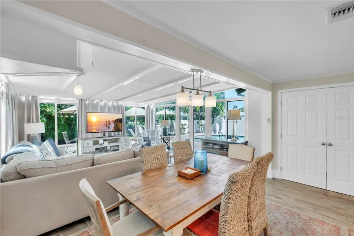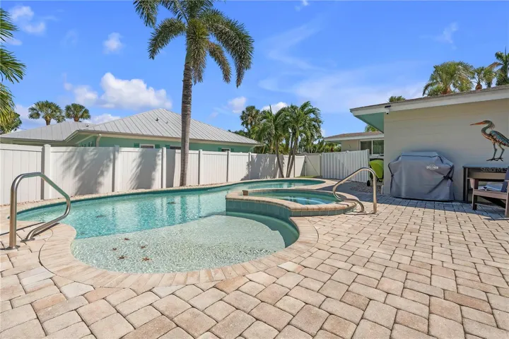 This beautifully updated 2BD/2BA coastal home captures the essence of laid back island living with a bright, open interior and a backyard designed for total relaxation. Inside, warm wood-style flooring runs throughout, setting a comfortable tone that pairs perfectly with the home’s coastal palette. The kitchen is crisp and inviting, featuring sleek quartz countertops, stainless steel appliances, and a sea glass toned backsplash that adds a subtle pop of color. Just off the kitchen, the dining area flows into a spacious living room with sunroom style windows that fill the space with natural light and frame views of the lush, tropical landscaping. A separate family room offers a second gathering space. Both bedrooms are generously sized, offering plenty of natural light and a sense of comfort. Step outside to discover your own private paradise. The heated pool and spa are surrounded by a spacious paver patio and swaying palms, offering the ideal backdrop for entertaining, unwinding, or soaking up the Florida sun. A detached shed with finished interiors adds flexibility to suit your lifestyle. There also is a boat slip with water, electric and a 10,000 lb lift available for separate purchase right up the street. Located just a short stroll or bike ride to the sugar white sands of the Gulf and the vibrant shops, restaurants, and beachy charm of Anna Maria Island, this home offers the perfect blend of comfort, convenience, and coastal character.