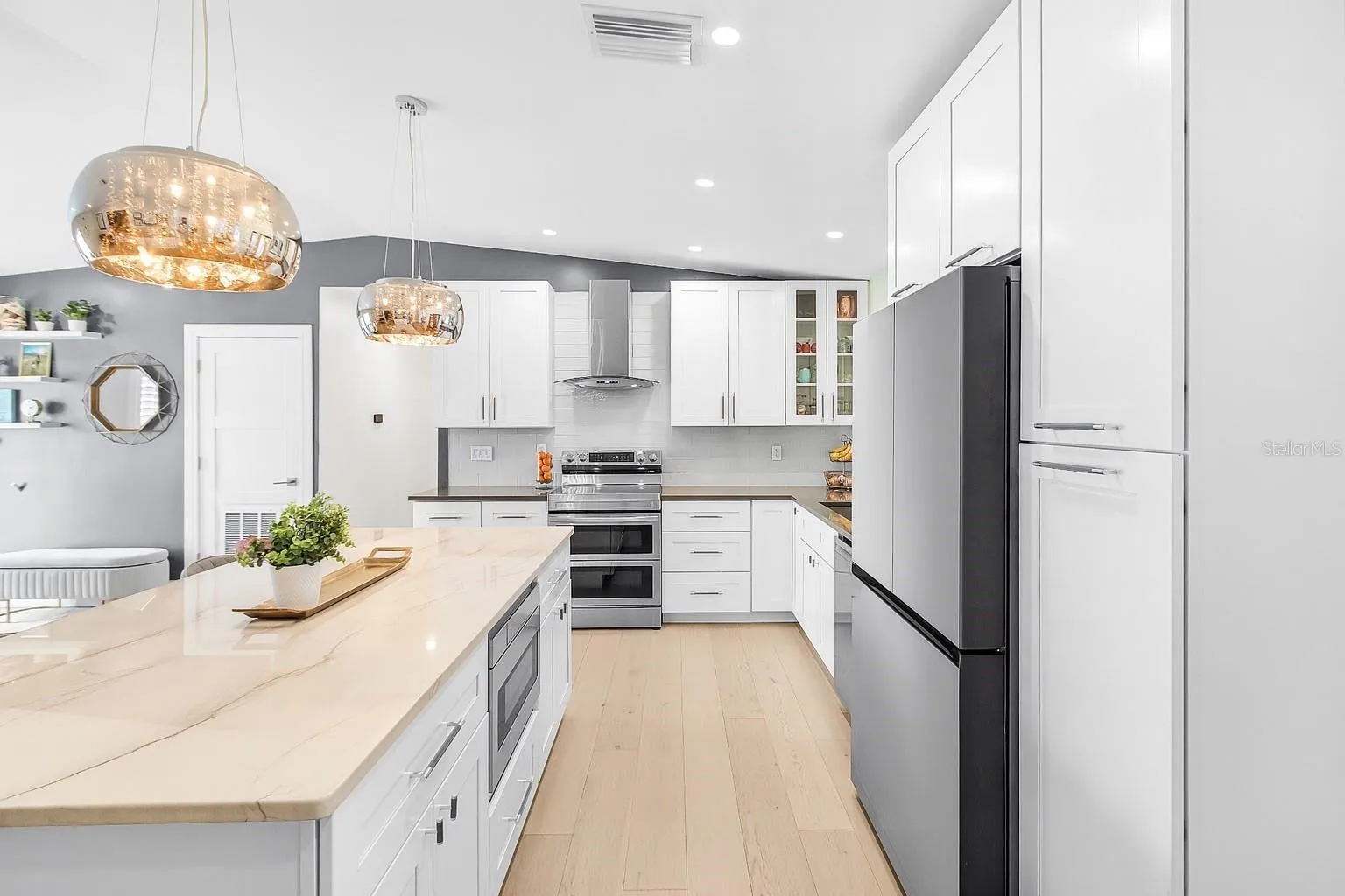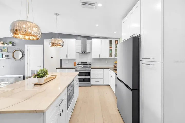 Set on a rare quadruple lot, this fully renovated home is as much an opportunity as it is a retreat. Redesigned inside and out, it offers a perfect blend of comfort, craftsmanship, and room to expand. The open layout flows seamlessly from the bright designer kitchen—featuring quartzite countertops and soft-close shaker cabinetry—to spacious living and dining areas overlooking the pool.