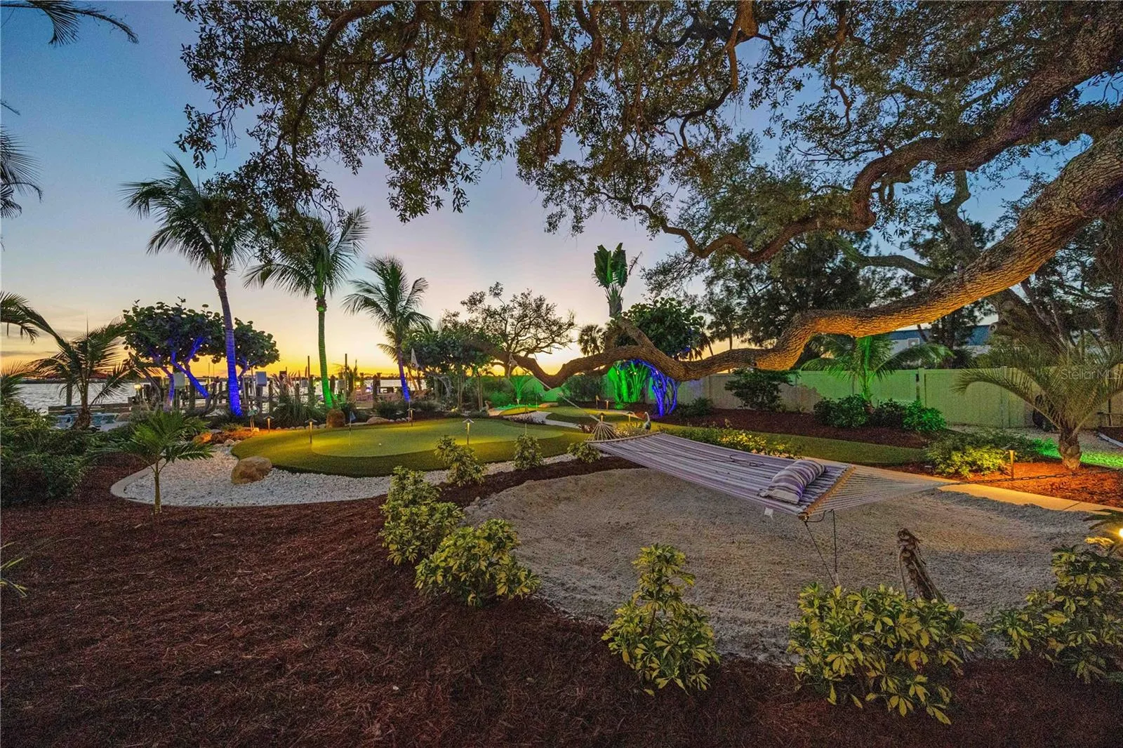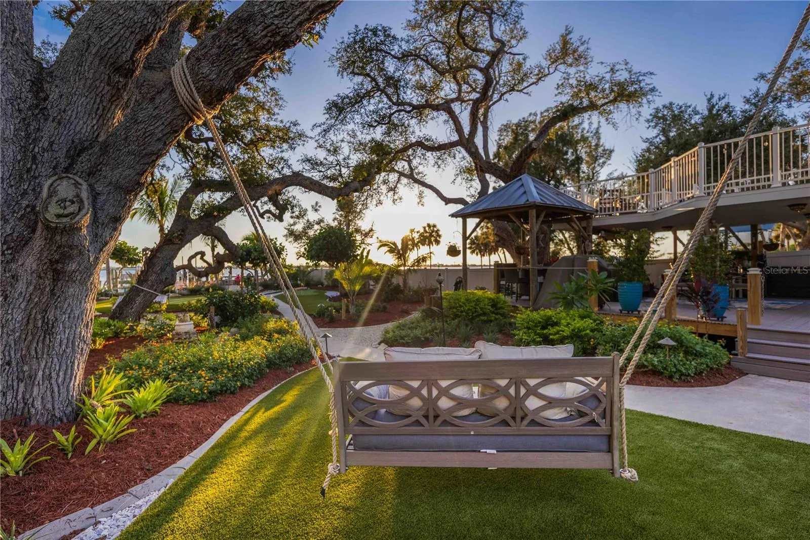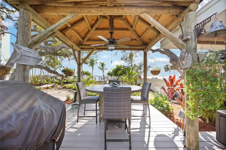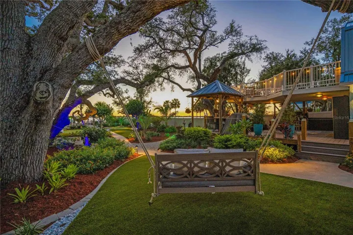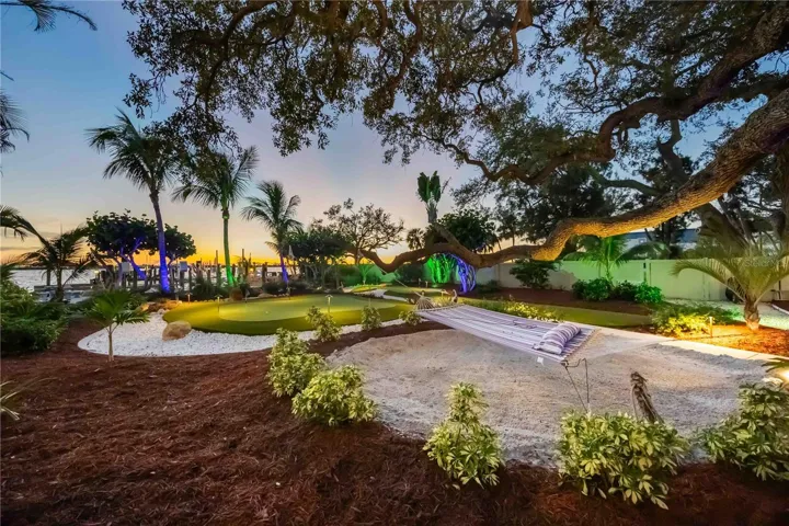 Outdoor amenities elevate this property to another level. The completely rebuilt dock (2024) includes four lifts, with capacity for vessels up to 50 feet, plus water and 50-amp electric service. A county boat ramp and full-service marina are steps away, making boating effortless. The grounds include multiple seating areas, a giant swing daybed beneath the oak canopy, an outdoor shower, a pergola with dining space for six, and a private Tiki hut with stainless steel grill, fire pit, and bar—all positioned perfectly for breathtaking sunset views over Lemon Bay.