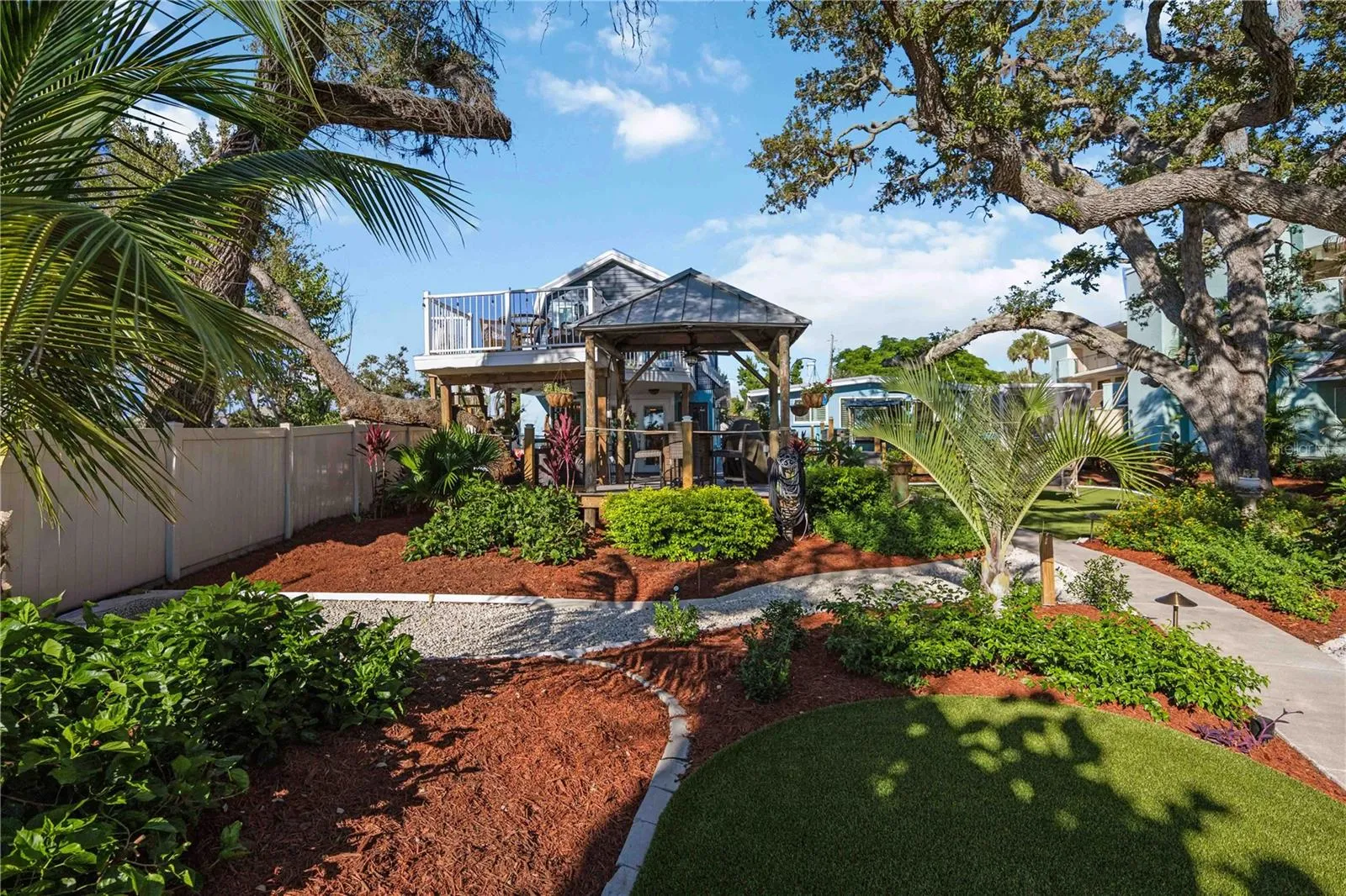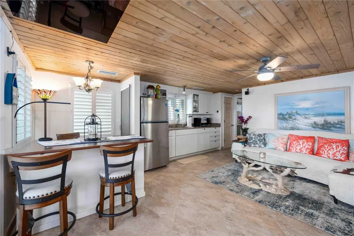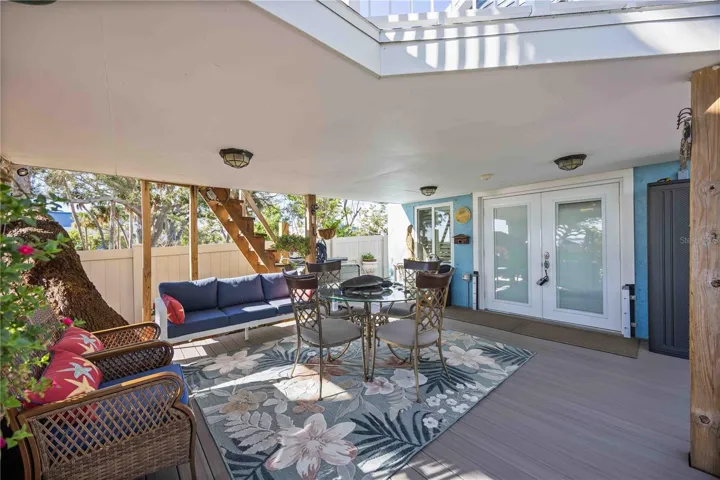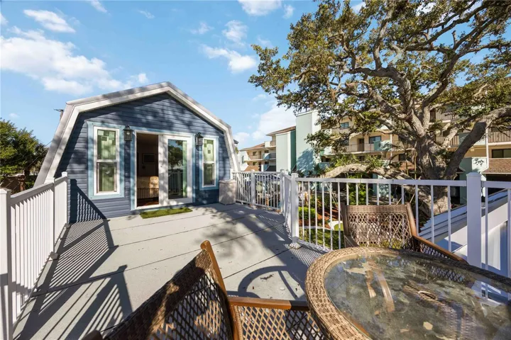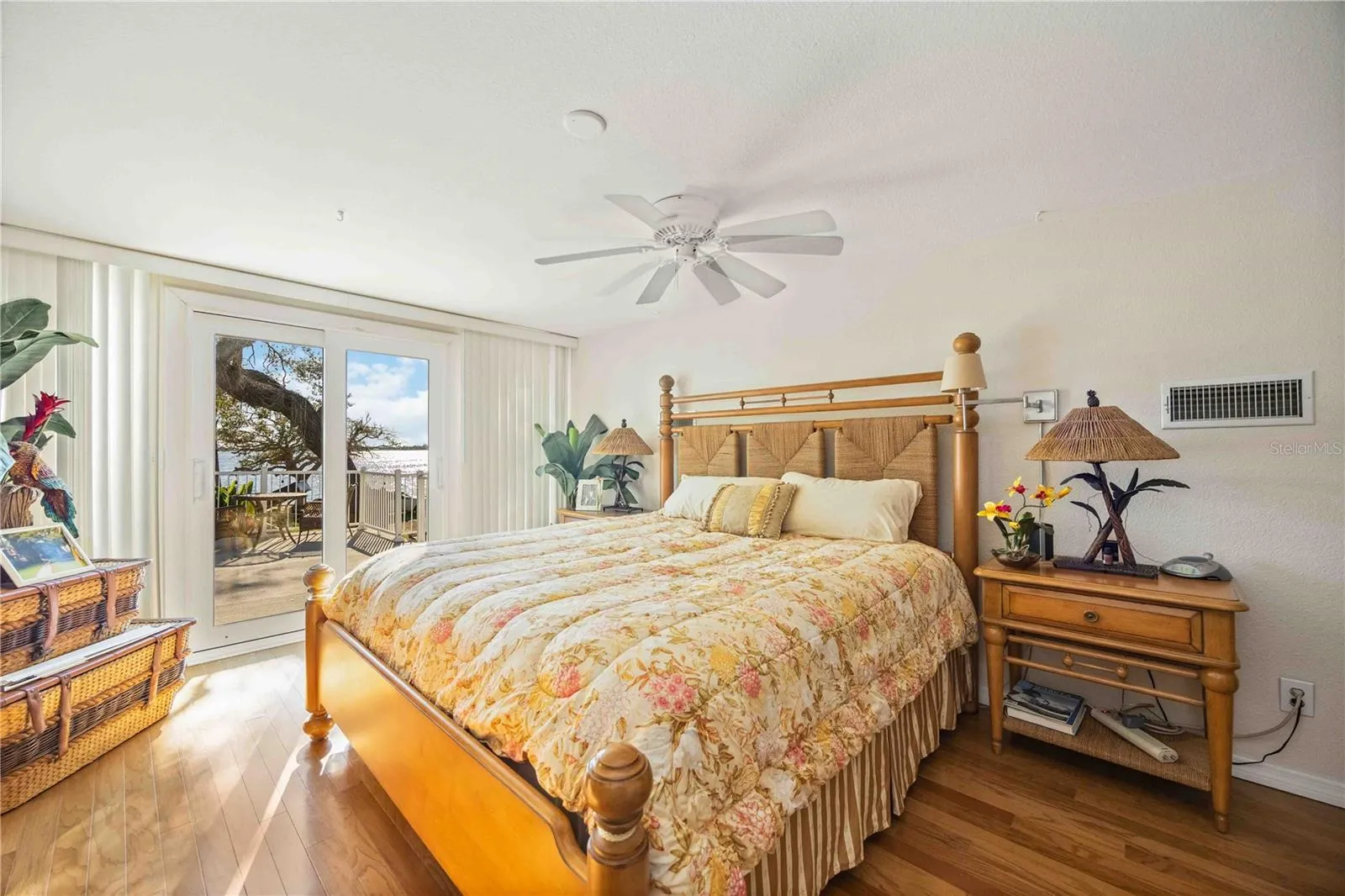 The primary residence offers approximately 1,500 square feet of total usable space, including outdoor living areas. The upper-level suite features a king-size bed, elegant bath with granite finishes, walk-in closet, and sliding doors opening to a spacious deck shaded by mature oaks and overlooking the gardens and bay. Downstairs, the open-concept living area includes a granite bar-top kitchen, dining nook, and full laundry room with front-load washer and dryer. Hardwood and porcelain tile flooring, warm wood ceilings, and quality finishes throughout create a refined yet relaxed coastal atmosphere.