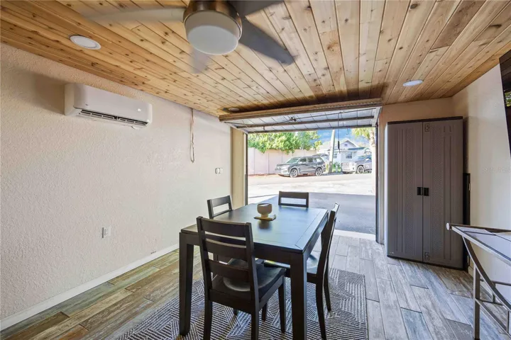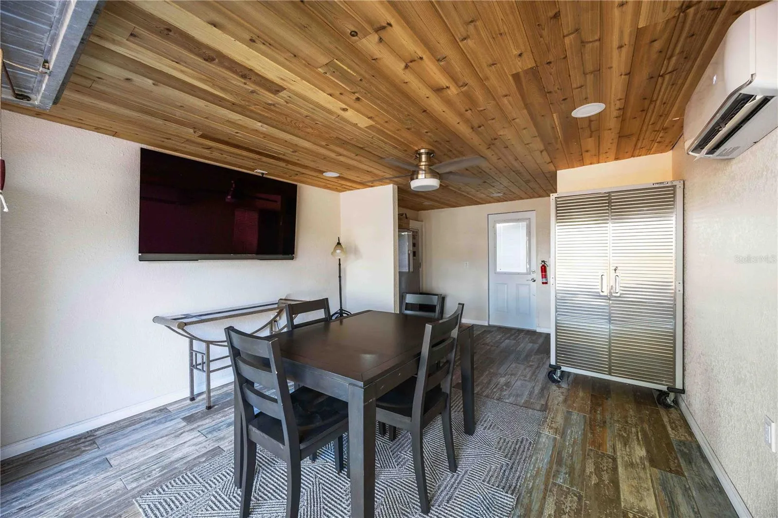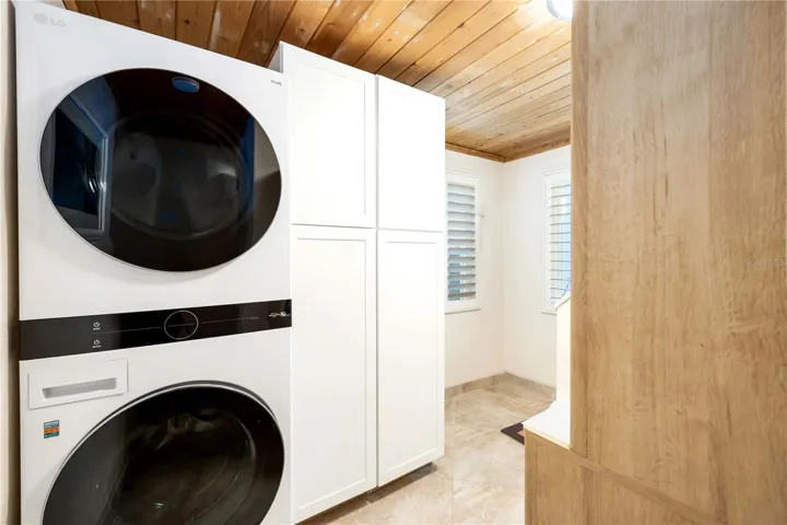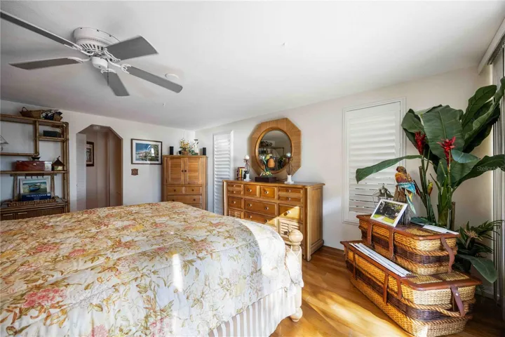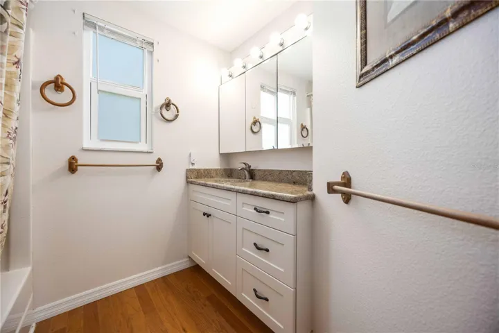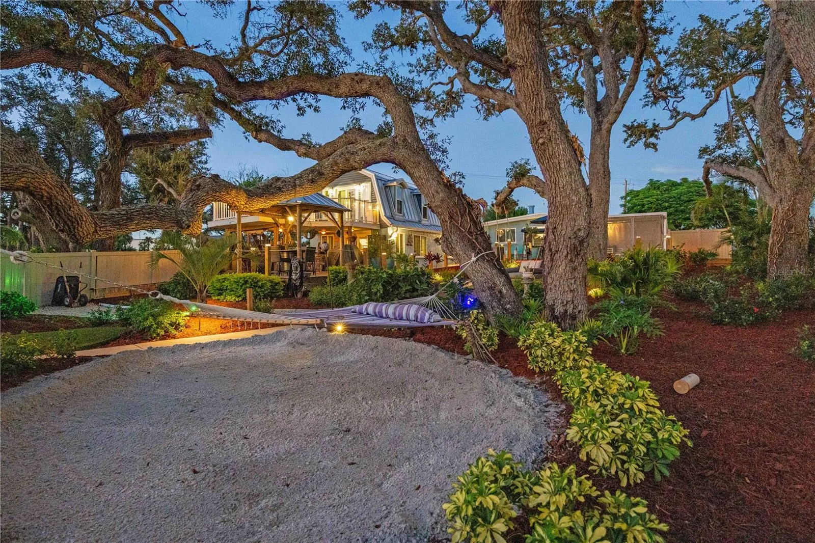 The primary residence offers approximately 1,500 square feet of total usable space, including outdoor living areas. The upper-level suite features a king-size bed, elegant bath with granite finishes, walk-in closet, and sliding doors opening to a spacious deck shaded by mature oaks and overlooking the gardens and bay. Downstairs, the open-concept living area includes a granite bar-top kitchen, dining nook, and full laundry room with front-load washer and dryer. Hardwood and porcelain tile flooring, warm wood ceilings, and quality finishes throughout create a refined yet relaxed coastal atmosphere.