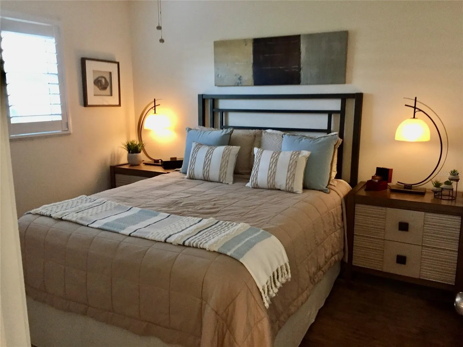 Wide open kitchen with stainless steel appliances, drop-down stainless hood, granite countertops and a breakfast bar with stools great for entertaining. Living room is open to the kitchen and has a large smart TV and Wi-Fi there are windows in every room with plantation shutters that give a wonderful light, bright and airy feel, This villa has been professionally decorated with chic, upscale furnishings. Step into the primary bedroom with beautiful queen bed that has four pillows and hotel style sheets. The en suite bathroom has a large shower, large walk-in closet, double vanities, granite countertops. The cozy second bedroom has a queen bed, two nightstands and closets. Second bathroom has a combination, tub, shower, beautiful tile and granite countertop. There is a lot of storage in this unit. The windows have been replaced with impact windows and The roof was replaced this year. Also a washer and dryer in the unit. There is assigned parking right by your front door with plenty of guest parking. The Community pool. HOA requires $150.00 application fee. 50% down at time of booking balance due Nov 1,2025. Must lease for 3 months at a time. Effective date Dec 1,2025 through May 1, 2026