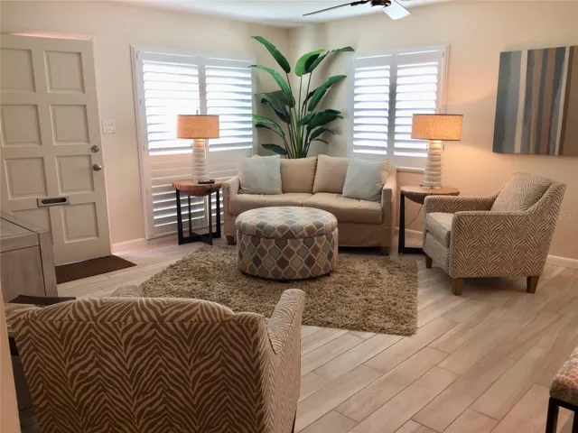 WOW! A BEAUTIFUL UPSCALE VILLA just two miles to world famous SIESTA KEY BEACH. Woodside Village West is in the sought after Gulf Gate area offering trendy restaurants and shops. This 2 bedroom 2 bath has been totally remodeled with an open floor plan. As you enter you will see lite tile floors that look like wood throughtout.