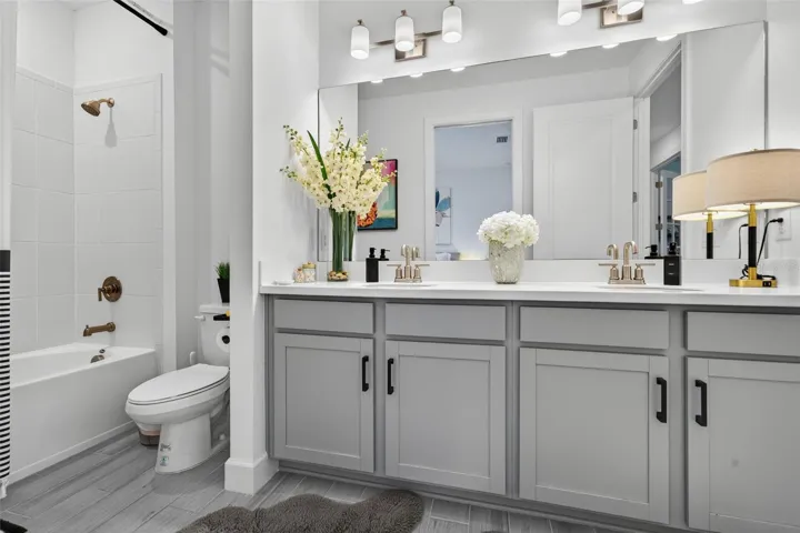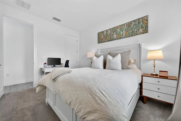 Retreat to the luxurious primary suite featuring serene lake views, a spa-inspired bathroom with dual vanities, and a spacious walk-in shower. The flex room provides versatility—perfect for a home office, media room, or guest retreat.