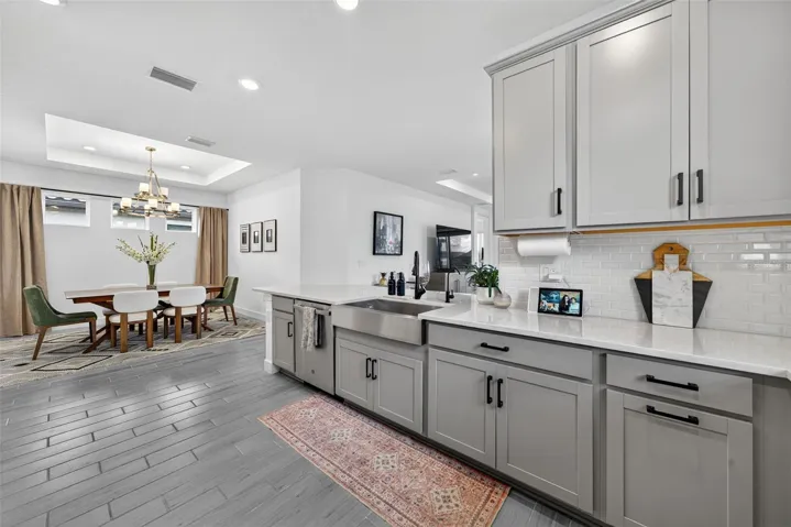 Inside, natural light fills the open-concept living area with highlighting tray ceilings, 8ft doors, designer tile and plush carpet flooring, and elegant finishes throughout. The chef-inspired kitchen features custom cabinetry, quartz countertops, a farmhouse sink, and a reverse osmosis, water purification, and softening system, ensuring every detail caters to both beauty and function.
