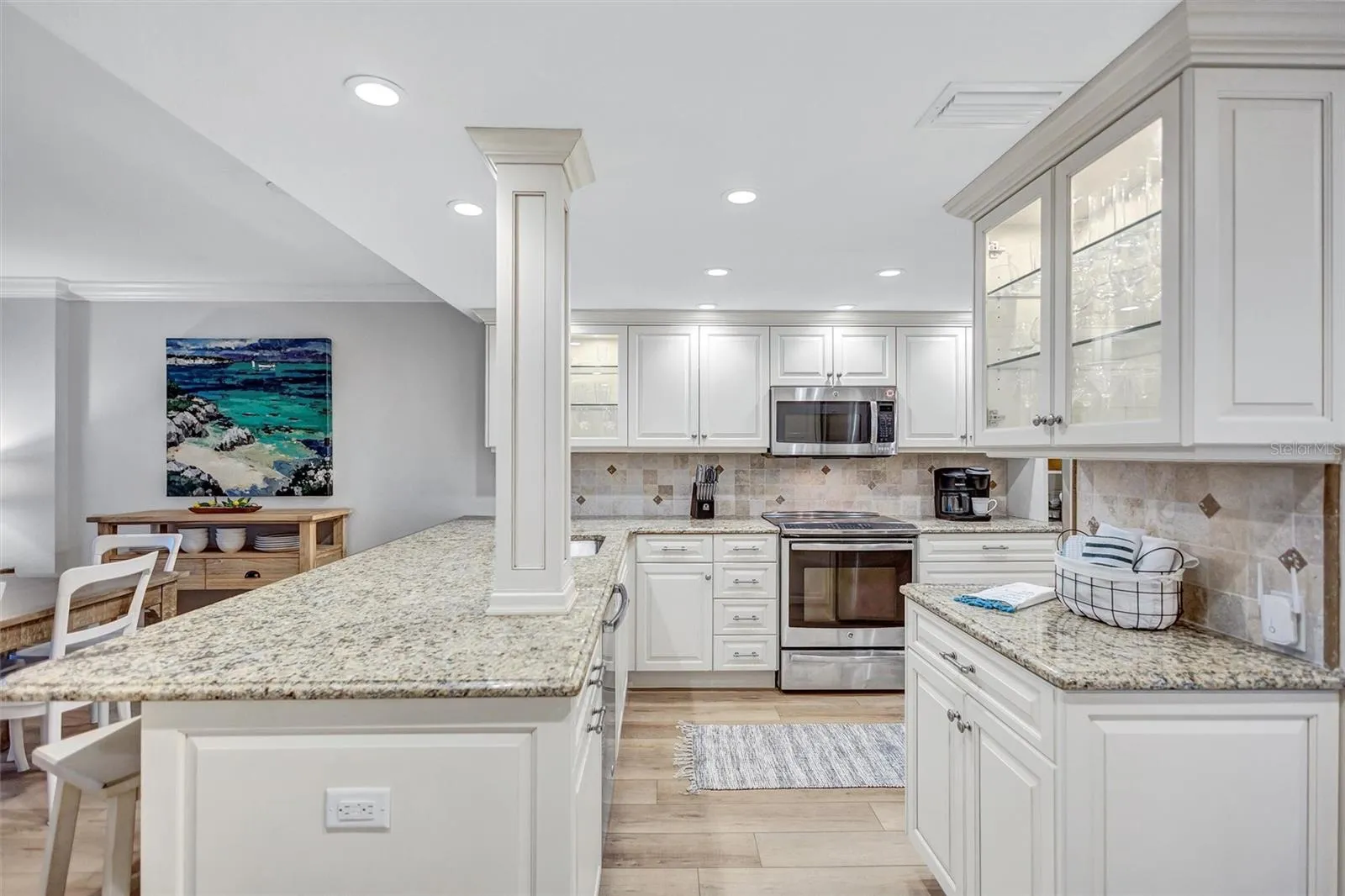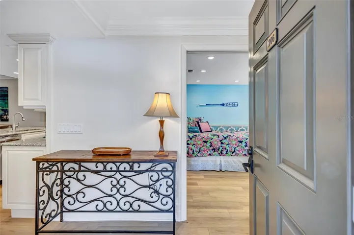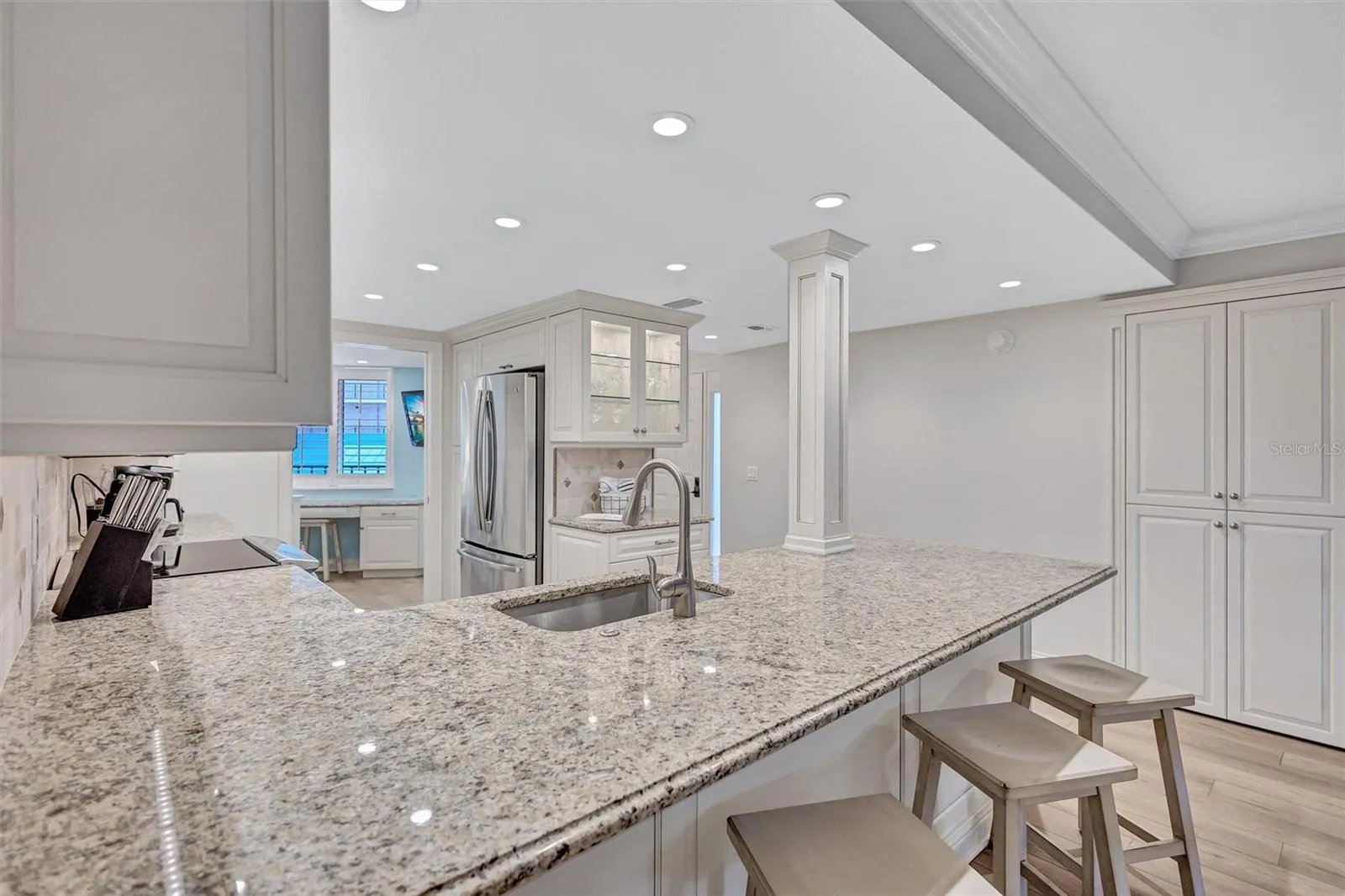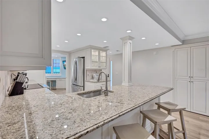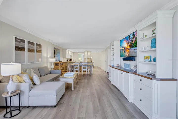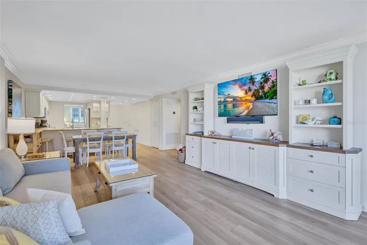 Find your beach get-away in this remodeled three-bedroom Casarina condo located on Siesta Key’s famous Crescent Beach. This stunning TURNKEY FURNISHED and updated unit includes an open concept kitchen with high-end custom soft-close cabinetry, designer hardware and granite countertops. The great room was extended to incorporate the balcony into the living space creating an open and airy feeling to this home. A wall mounted television with Sonos audio provides family entertainment. The spacious primary bedroom with a Closet Tech designed walk-in closet opens to a large bathroom with custom cabinets, dual sinks and large walk-in shower. A third bedroom was created during the recent remodel and includes a built-in under window desk. The full-sized laundry room allows for plenty of storage. Luxury vinyl flooring was installed in 2020 in all public rooms. Impact windows were added in 2016. Electric blinds can close off the sliding glass doors to the outside view while all other windows have custom designed plantation shutters. Crown molding and solid wood doors are found throughout the unit. Casarina is an 89-unit condominium complex that sits on 200 feet of private beach and encompasses 7 acres of tropical landscaping. The complex has a clubhouse with kitchen. Spend your days enjoying the beachside pool and spa, play a game of pickleball on one of the two lighted tennis courts, or relax on the island’s famous crystal sand beach. Hop on the free trolley to enjoy the dining, shopping and entertainment at Siesta Key Village. CASARINA ALLOWS OWNERS ONE SMALL PET. View the video at: https://sunnylensmedia.hd.pics/5880-Midnight-Pass-Rd-1/idx